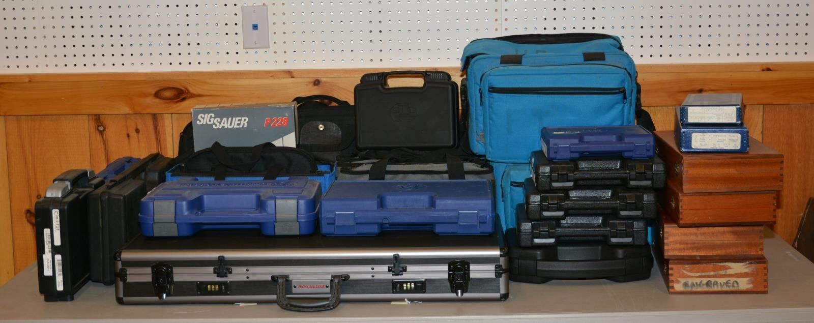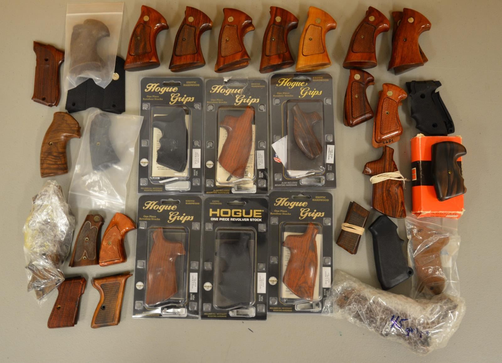 GRIPS: S&W - N frame square butt: smooth target Goncalo Alves w/ thumb recess; 4 checkered target Goncalo Alves w/ thumb recesses; checkered target Goncalo Alves w/ speed loader cutout & w/out disks. / K frames: Goncalo Alves checkered target w/ speed loader cutout (light marks). / 2 J frame square butt checkered walnut target; checkered walnut Bekeart style. / Hogue S&W wood Monogrips: 2 N frame square butt; N rnd.; K rnd.; J rnd. / 2 pair aftermarket S&W Model 39 / aftermarket checkered PPK/S; Mauser HSc / Target Hi-Standard / Target Model 1911 / wrap around Colt Model 1911 rubber w/ medallions / Colt hard rubber I frame / Colt oversized D frame (light marks) / aftermarket finger grooved Colt D frame. CARRY CASES: Winchester all purpose 32" X 13" X 5" case w/ combo locks & foam padding / 2 Dillon Range Bags / 2 AR-15 style carry bags. / 3 Wilson Combat pistol range bags. / Dillon sm. range bag containing 2 Dillon pistol bags. GUN BOXES: STI 5.0 Edge / Pardini / Sig P 228 / Sig 210A / 3 Trijicon black plastic cases w/ paperwork / generic black plastic / 4 S&W blue plastic cases for Models 640, 625 & 2 for 629's. / 4 S&W Mahogany boxes 2 Model 29's 6 1/2", 27 6" & 57 6" (all very good w/ tool kits). / 2 piece Bangor Punta boxes w/ packaging for Models 24 6 ½” & 30-1 2". PROVENANCE: From the Frederic W. Thrane Collection. (02-14153-4/NW). $900-1,400.