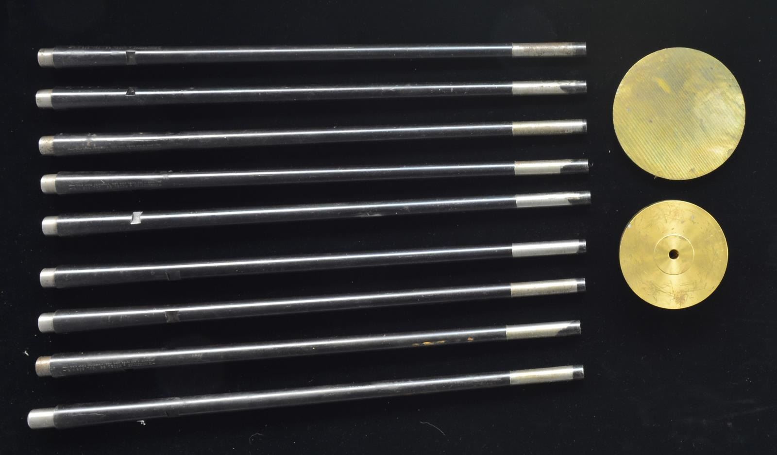9 Winchester 20.5" Model 88 .308 Win. bbls. that have been turned down on the last 3" of the muzzle. Also included are 2 brass discs, 1 measuring 4" in dia. & the other measuring 5" in dia. UNATTACHED ACCESSORIES: full scale blueprints dated “4-94” on the mfg. & assembly of a gatling gun project, along w/ a 30-page booklet explaining the project, dated “1991”. (02-14555/JZ). $200-400.