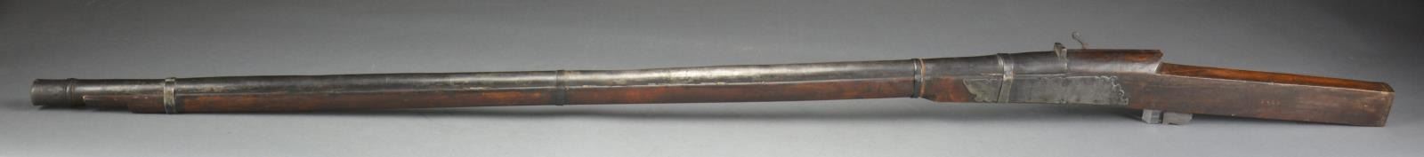 WALL GUN. NSN. What appears to be old 58" bbl. is stamped “GPRIEXRI216722” on right side near breech in front of pan. Split iron match holder is actuated by lever at grip. Hardwood stock extends to w/in 3" of muzzle. Sheet metal decorative plates are on sides. Stock is held to bbl. by 4 sheet metal bands. CONDITION: good. Bbl. w/ remnants of a coat of black paint. Stock aged w/ paint or ink. Rough bore. (01-18796/MGM). ANTIQUE. $250-500.