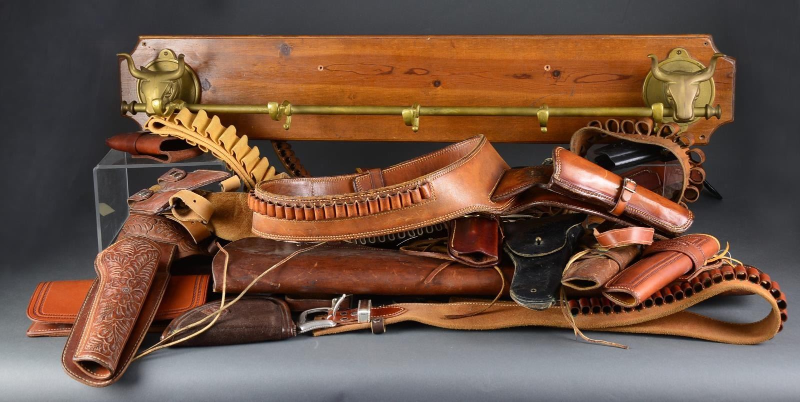 BULLSHEAD HOLSTER RACK. 39" tubular brass rod w/ 5 gun belt / holster hooks. Brass bull's heads hold each each of the rack in their mouths. Rack mounted on 41 1/2" x 7 1/4" finished pine board. w/ routed borders. HOLSTER BELT RIGS. Alfonzo holster & Gun Shop North Hollywood, CA Mexican dbl. loop holster for 7 1/2" SAA revolver. / Hunter No. 3060F8 tooled dbl. loop belt & holster for 7 1/2" SAA revolver. / Triple K No. 144-15 dbl. loop holster & belt for 6 1/2" SAA revolver. / Unmarked Mexican dbl. loop two holster rig for Model 1911 pistols w/ 2 mag. holders. / El Paso Saddlery Co. tooled black shoulder rig for Model 1911 w/ 2 matching mag. holders. / Jackass No. 150 shoulder holster for semi auto pistol w/ Jackass No. 14803 dbl. mag. holder. HOLSTERS. El Paso Saddlery Co. No. 174 for Colt SAA 7 1/2". / El Paso Saddlery Co. No. 174 for Colt SAA 10". / El Paso Saddlery Co. No. 174 for Colt SAA 5 1/2". / Hunter No. 1100-58. / Hunter No. 7791466 US marked flap holster. / Brauer Bros. No. H130. / KIM tool belt loop w/ matching 2 mag. pouch. / Brauer Bro. nylon holster. / Unmarked molded holster for semi auto pistol. BELTS. Suede lg. cal. cartridge belt w/ polished silver finished buckle. / Leather shot shell belt. / Leather belt for centerfire cartridges. / Web cartridge belt w/ Anson marked repro. belt buckle. / Unmarked web cartridge belt. / Honest No. 36 62803 black belt w/ Dillion leather holster for semi auto pistol & matching 2 mag. holder. RIFLE SCABBARDS. 2 Bucheimer Model 101 leather rifle scabbards. ACCESSORIES. Pioneer Products beavertail rifle sling. / El Paso Saddlery No. 174 45-70 caliber leather cartridge wallet. / Bianchi No. 30 clip grip. / Safariland zippered sm. pistol pouch. (02-13986/DS). $300-500.