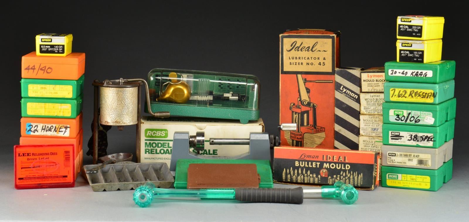 15+ RELOADING DIES: 5 RCBS 2 die reloading sets. Cals.: 30-06, 7.7 Jap., 30-40 Krag, 7.62x54R Russian, 6.5 Jap. / 3 RCBS 3 die reloading sets. Cal. 38-55 Win & Ballard, 45 Colt, 32 S&W Long. / 1 RCBS Carbide 2 die set in 45 ACP. / 1 Herters 38 Spl. 3 die set in RCBS box. / 4 LYMAN 2 die sets. Cal.: 30-30, 303 Brit., 22 Hornet, 32-20. / 1 Lyman 2 die set in 44-40. / 1 Lee Loader 2 die set in 8mm Lebel. 10+ BULLET MOLDS & EQUIPMENT: 1 Powder Electric melding pot w/ ladle. / 1 Aluminum 6 cavity ingot mold. / 2 Lyman Ideal bullet mold handles in box. / 9 Lyman boxed mold blocks. Numbers: 557.456, 457191, 538146, 68569, 358429, 3118, 42798, 515141AW, 585213. 8 ASSORTED LOADING TOOLS: 1 RCBS model 10.10 reloading scale in box. / 1 Lyman Universal case trigger. / 1 Lyman Ideal Lubricator & No. 45 sizer in box. 33,34) 2 Quinetics bullet pullers. / 1 Box of assorted bullet lube & sizer dies. / 1 Cox & Sprague 30-06 primer pocket cleaner. / 1 RCBS Case lube pad. MISC. ITEMS: Partial boxes of bullets include: Speer in cals.: 6.5, 303, 451, 30, 7.62 Russian. Sierra partial box in 7mm. Hornady 38 cal. / 1 - 41-44 cal. plastic ammo wallet / 1 Birch wood case cleaner. / Reloading pamphlets by Lyman & RCBS. CONDITION: good to very good unless otherwise noted. (02-14041/DS). $250-500.