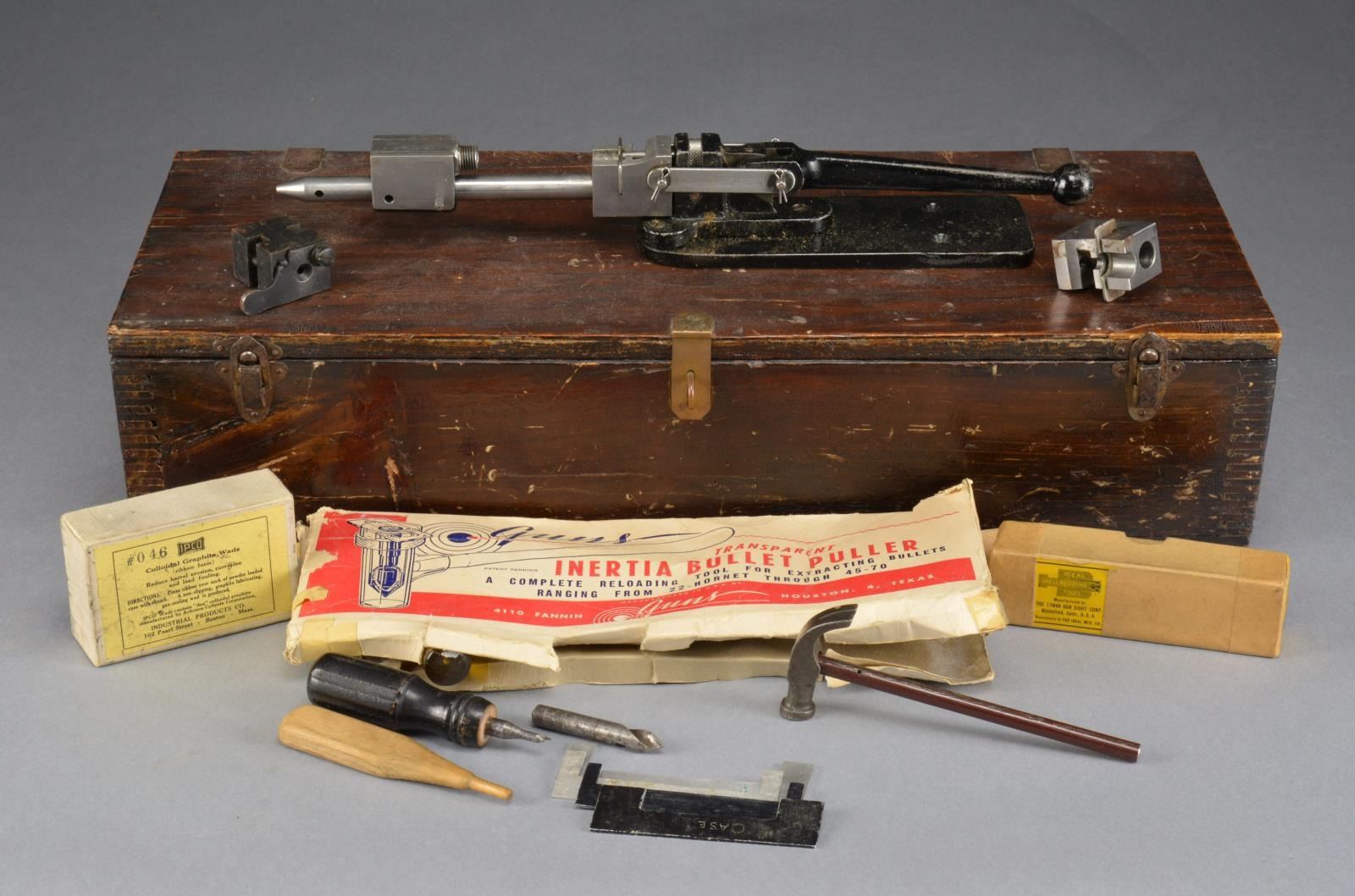 B&M MODEL 26 IMPROVED RELOADING TOOL. Decaps, reprimes & neck sizes cases. Includes instruction sheet. / SET OF B&M 6.5MM RELOADING DIES. Including 2 expander points & 3 bullet seaters. / 6.5MM SIZER. / GUNS, Houston, TX, bullet puller. / Sm. box containing brush, priming pocket deburring tool & jigs. / Partial box IPCO Colloidal Graphite wads. / Sm. reloaders hammer. Set is stored in a 21 1/2" x 8 1/4" x 5" homemade plywood box. CONDITION: tools are all in good workable shape, some show finish wear. (02-14077/DS). $100-200.