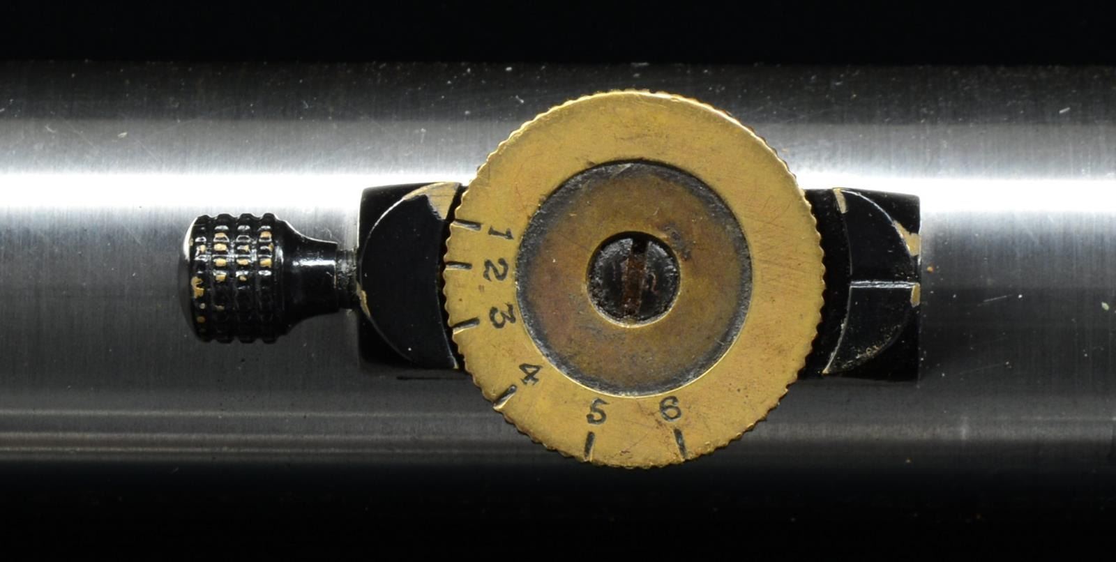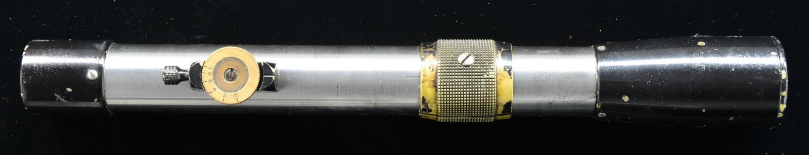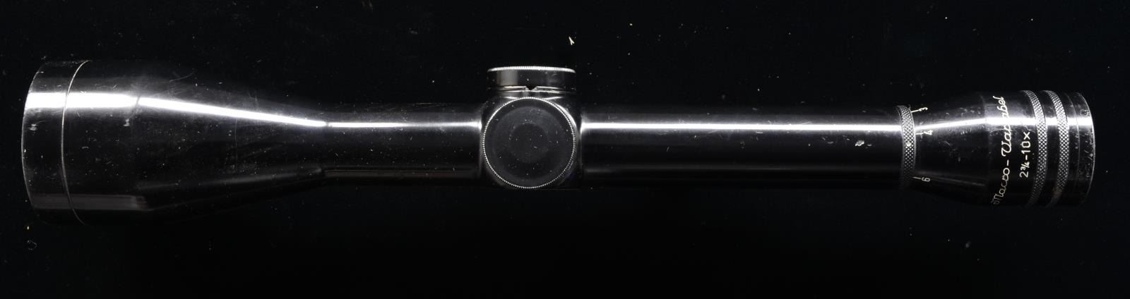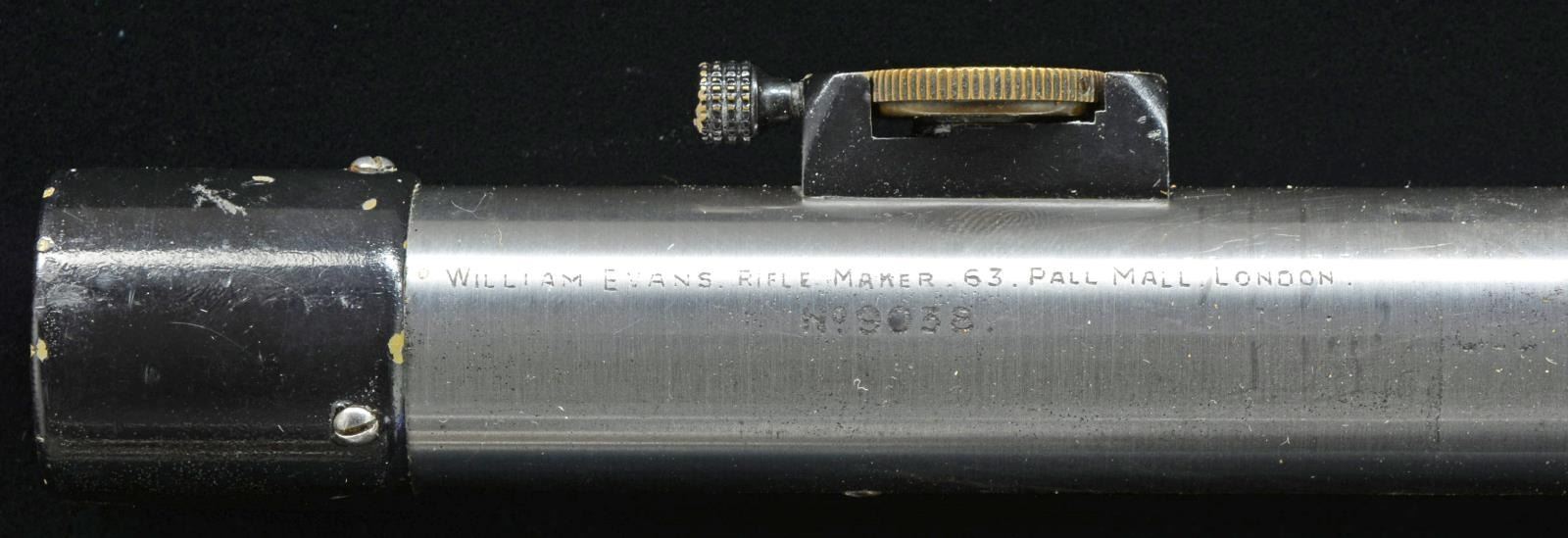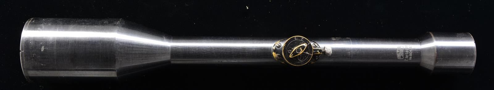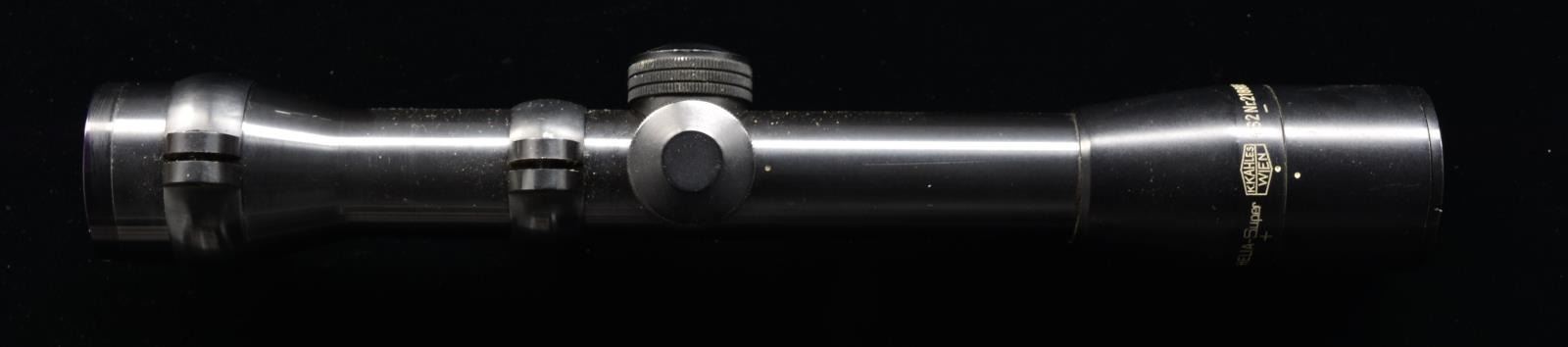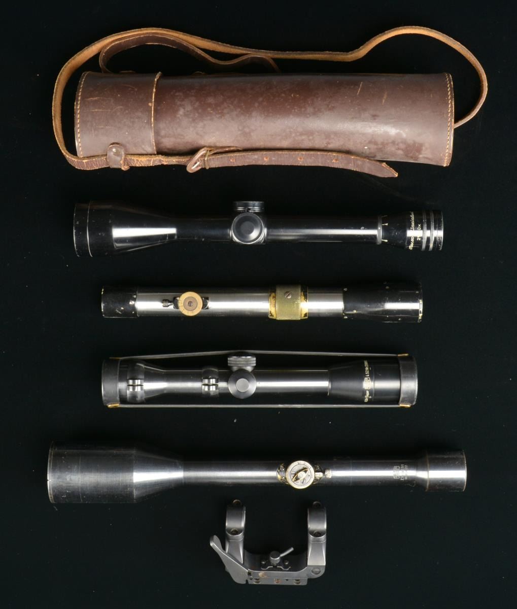 1 Kahles "Helia Super" 4x scope w/ duplex reticle w/ high quality claw rings, rear w/ windage. Exterior w/ a few minor marks, optically clear. / 1 Zeiss Zielacht scope w/ 3 post reticle, no windage adj. Exterior w/ old ring marks, some compressions on objective bell. Optically clear. / 1 Unusual German type scope marked “William Evans Riflemaker 63 Pall Mall London” on left side. Scope has single post reticle. Bbl. polished bright. Most lacquer on ends. A bit cloudy. / 1 Hertel 2 3/4 – 10X 30mm rail scope w/ 3 post & crosshair reticle w/ claw mounts. Exterior w/ a number of marks, loss to left side of reticle housing. In its leather case. Optically clear. Case is good. / 1 Unmarked sniper type side mount w/ base. Appears to be reblued, retaining nearly all of that blue. (02-14184-4/MGM). $300-600.
