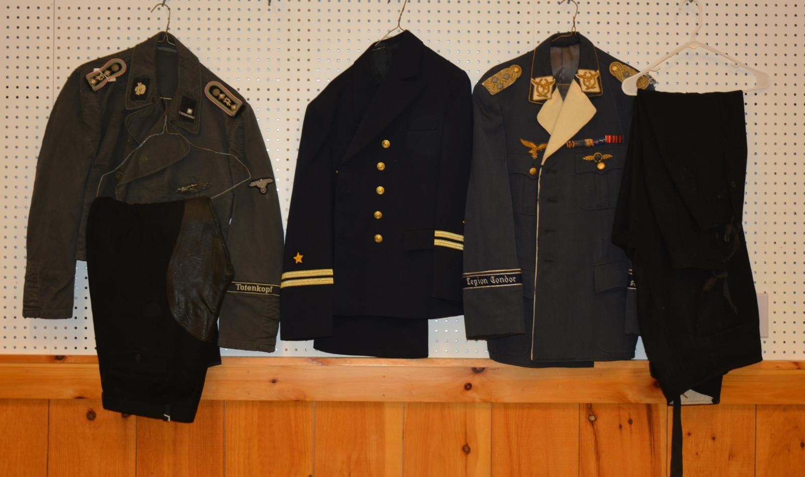 PANTS. 1 Tunic is for a Luftwaffe general w/ badges & ribbon bars, all of which are reproduction. 1 Is for a Navy lieutenant. 1 Is for an SS panzer master sergeant. 1 Pair of pants are black w/ a leather seat. 1 Pair of pants are black wool. CONDITION: tunics & pants show light wear overall w/ minor staining. (02-13535/BF). $300-500.