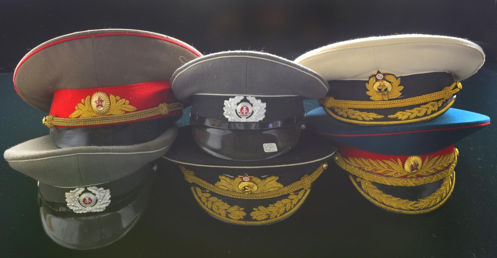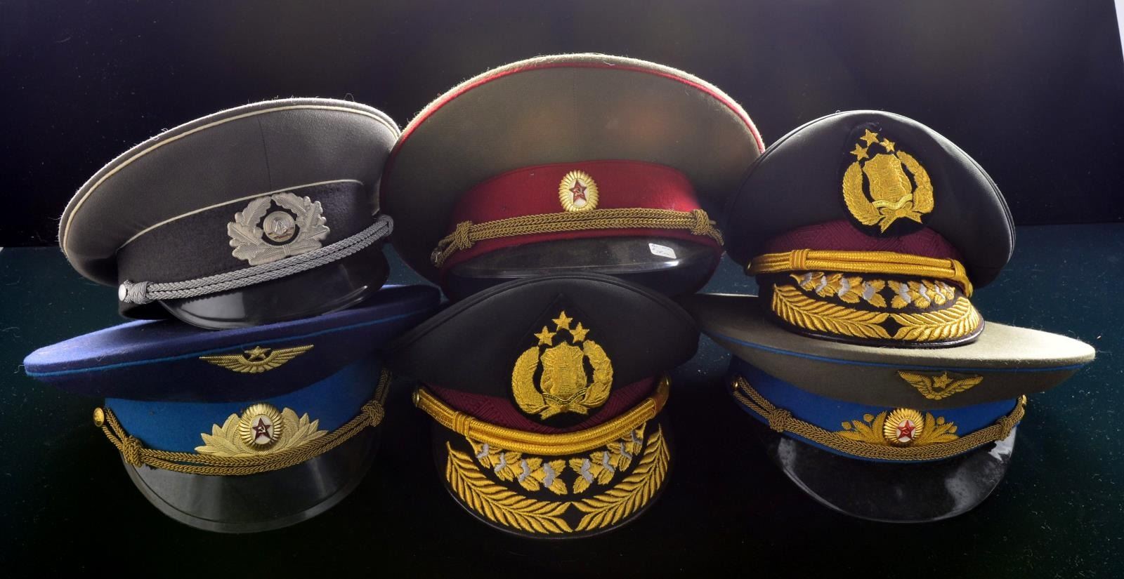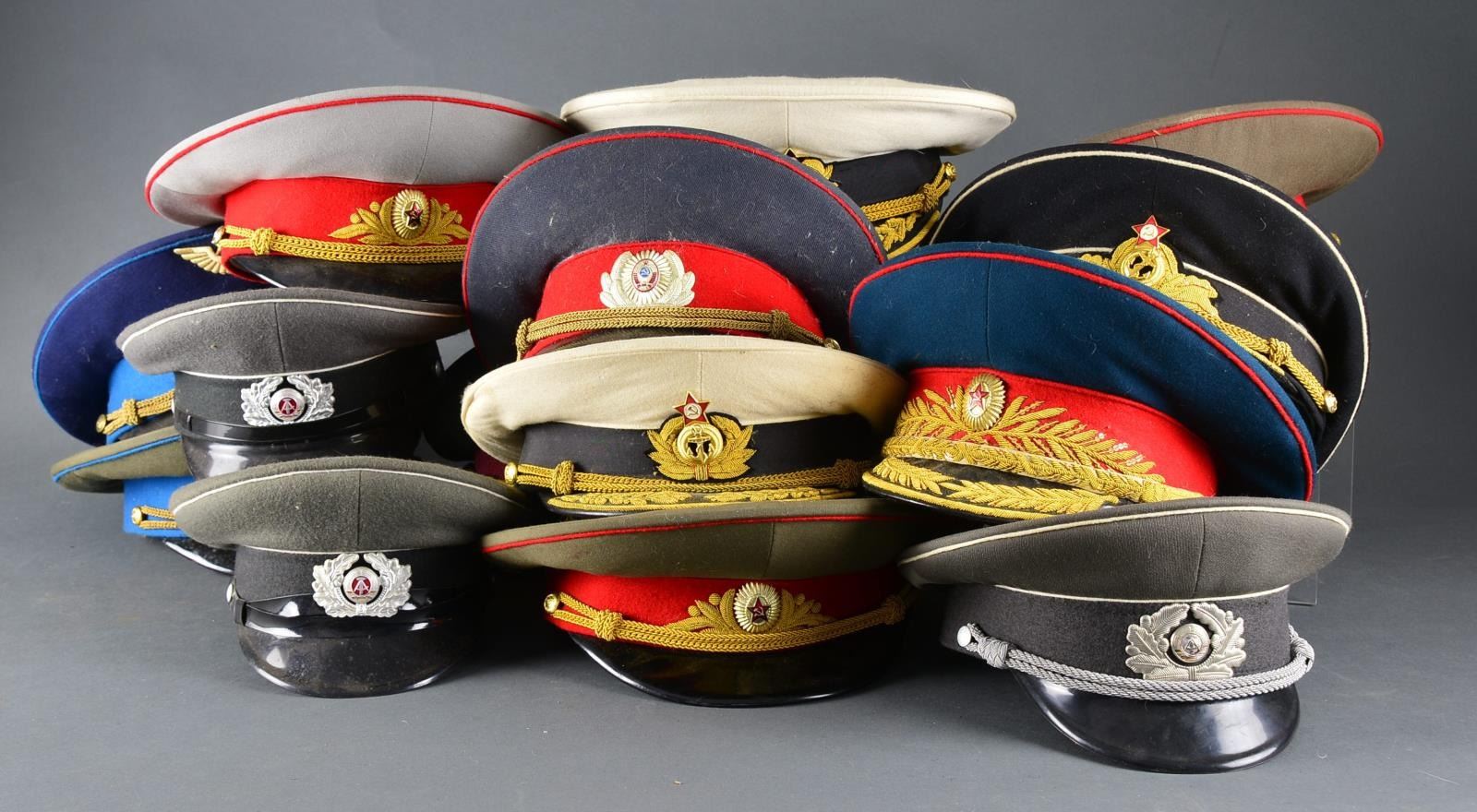 INDONESIAN HATS. This interesting group contains approx. 40 mostly Russian & East German military hats along w/ 2 Indonesian Police peaked caps. Hats represent various branches of the military & include officers & enlisted versions. CONDITION: many hats are unissued, some show light wear. (02-13540-1/BF). $300-500.