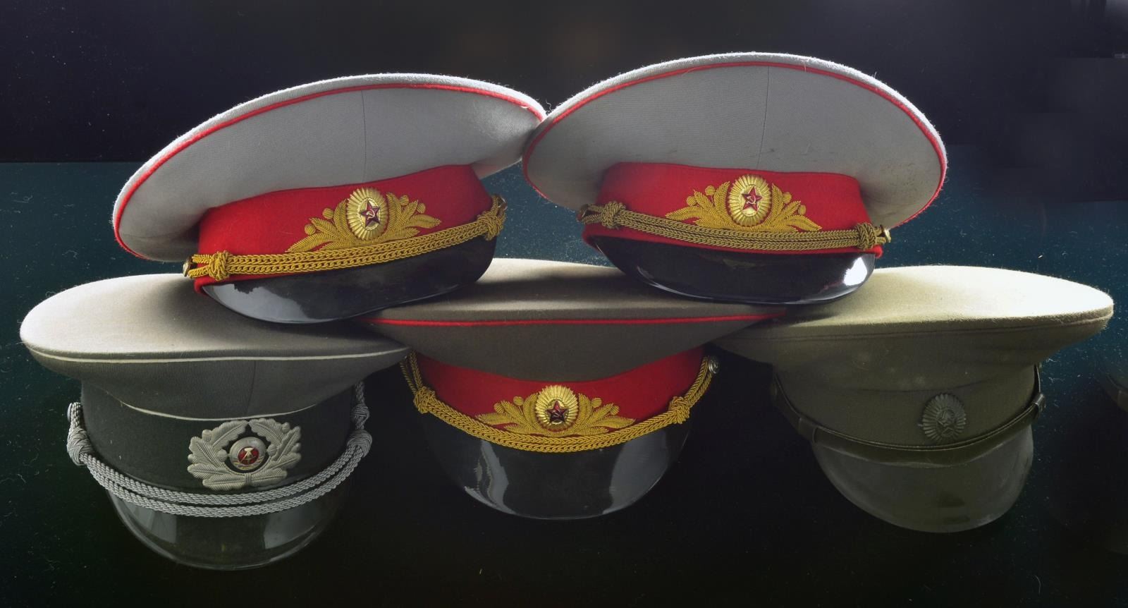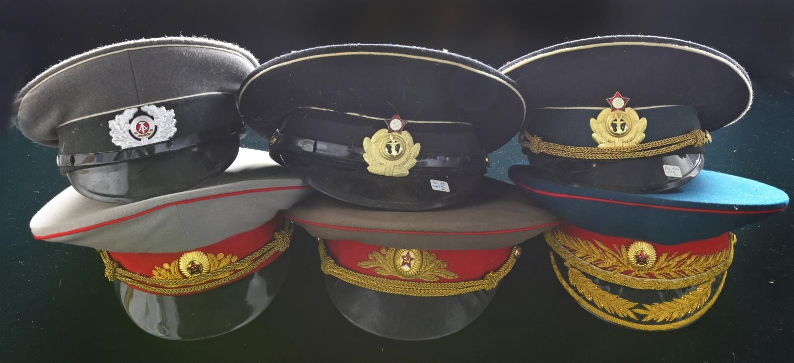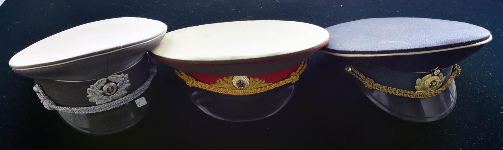 INDONESIAN HATS. This interesting group contains approx. 40 mostly Russian & East German military hats along w/ 2 Indonesian Police peaked caps. Hats represent various branches of the military & include officers & enlisted versions. CONDITION: many hats are unissued, some show light wear. (02-13540-1/BF). $300-500.