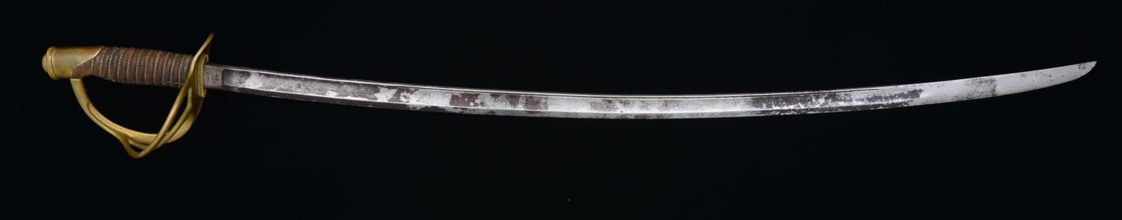 Overall length: 40 1/4”. Blade length: 34”. Single fullered blade marked at the ricasso, “U.S. C.E.W 1865” & “MANSFIELD & LAMB FORESTDALE RI”. Brass hilt. Wire wrapped leather grip. No scabbard. CONDITION: blade has a medium gray mottled patina w/ scattered areas of dark oxidation. Hilt has a pleasing mustard patina. Grip has a noticeable drying crack. Leather shows light to moderate wear. Wire is complete. (02-14632/BF). $200-300.
