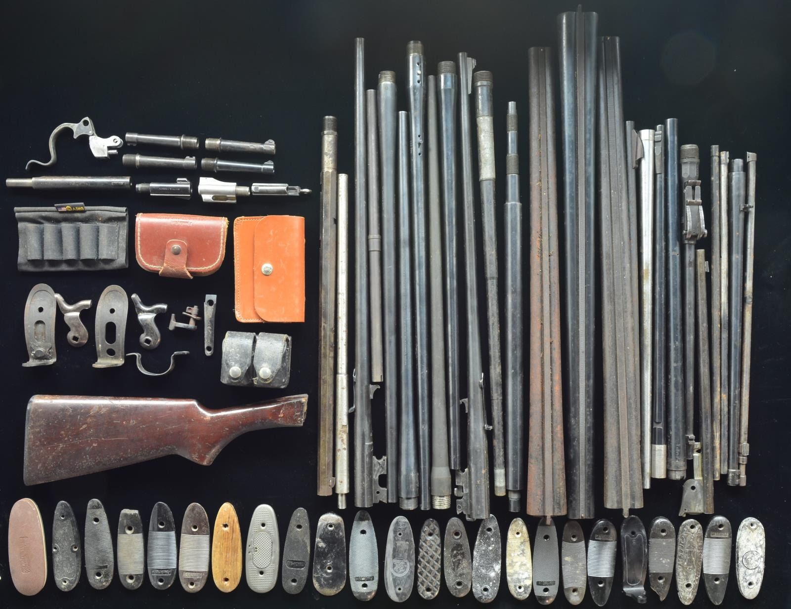 Lot consists of 3 unmarked SXS shotgun bbls. (2-16 ga. & 1-12 ga.; 1 w/ forend. 3 Shotgun bbls, 2 unmarked 12 ga. in the white, 1 Ithaca Featherlight blued 16 ga. 22 Assorted rifle bbls. including Winchester M70 30-06, Winchester model 88, Ruger 10/22, Savage 219 & military style rifle bbl. marked "TERNI". 9 Handgun bbls. including 2 M1911 style, 1 Ruger 357 mag. revolver bbl., 1 S& W 38 Spl. revolver bbl. & 4 Luger bbls.; 2 w/out front sight blades. 2 Springfield trapdoor buttplates, 2 Springfield trapdoor hammers. 1 Unidentified shotgun buttstock. 1 Leather pouch containing 2 speed loaders. 50 Misc. rubber, steel & plastic buttplates Lot also contains misc. sm. gun parts. CONDITION: overall ranges from poor to good w/ some metal parts showing oxidation & patina. Some buttplates are chipped & cracked. (02-14676/BH). $300-500.