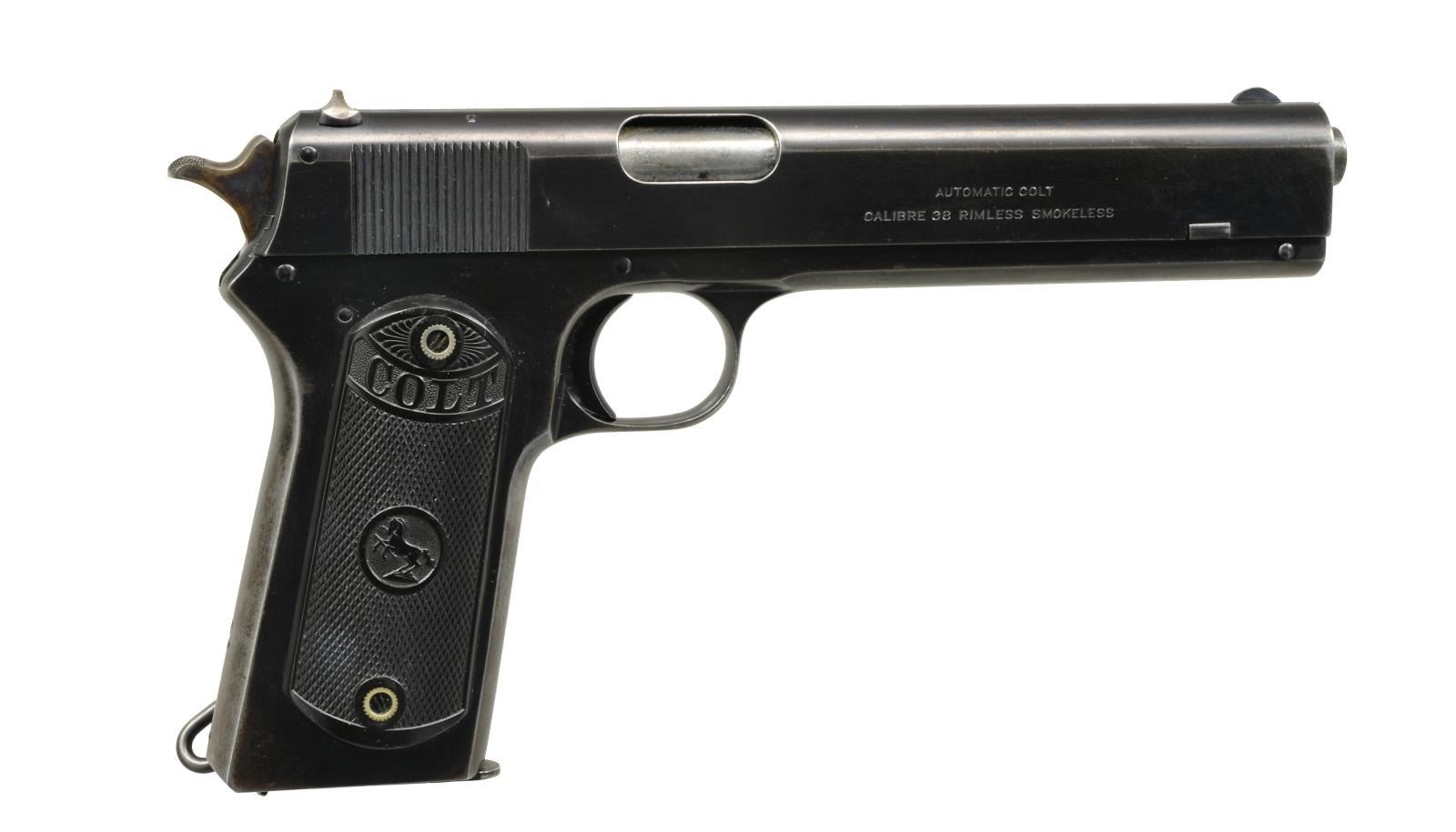 Cal. 38 ACP. S# 40160. Bbls. 6". Mfg. 1902-1929. Colt logo hard rubber grips & lanyard swivels at bottom left rear of butt. Blued finish w/out front cocking grooves. Later variation w/ spur hammer in second S# block 30,200 - 43,266. MAGS: 1 Colt 8 rd. TOTAL; very good 2 tone w/ base mark "MIL. / COLT / 38CAL.". CONDITION: very good general appearance w/ slight high point wear & thinning in grip area. Light pinprick oxidation near butt area. Very good grips. Vivid case colors on hammer. Near excellent bore. (20-2137/NW). CURIO. $2,000-3,000.