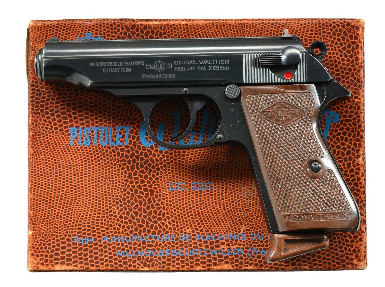 Cal. 7.65mm (32 ACP). S# 342893. Bbl. 3 7/8". Mfg. under license by Walther & import marked by IAI of TN. Standard French proofs & Manurhin / Walther marked checkered brown plastic grips. MAGS: 2 factory 8 rd.; finger extension & flat bases. UNATTACHED ACCESSORIES: brown pebble grained Manurhin / Walther box matching numbered to pistol; includes brass cleaning rod & bottle style bore brush. CONDITION: faint thinning on front high points of slide plus 2 sm. marks on right side; all other aspects near excellent including bore & grips. (20-2120/NW). CURIO. $600-900