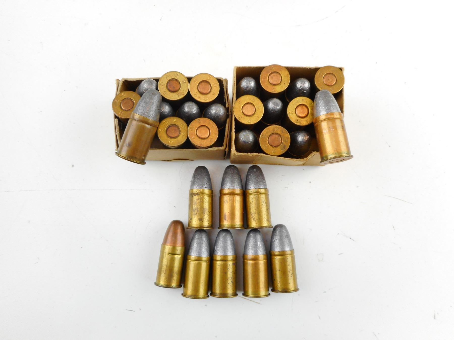 54 RNDS, LEAD AND COPPER BULLETS, 1920S-1944 DATES, 1 BOX IS BRITISH, SEALED BOXES