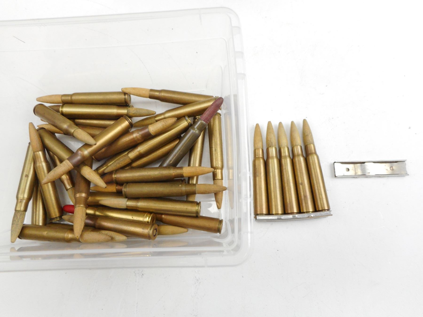 38 RNDS, 2 STRIPPER CLIPS, INCLUDING WWII GERMAN, AND OTHER ASSORTED MFG'S