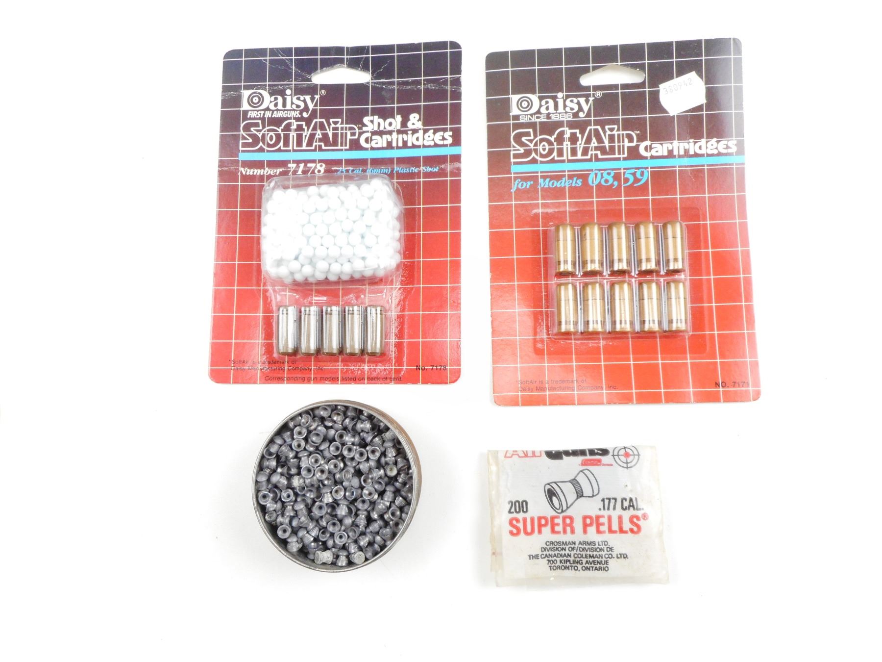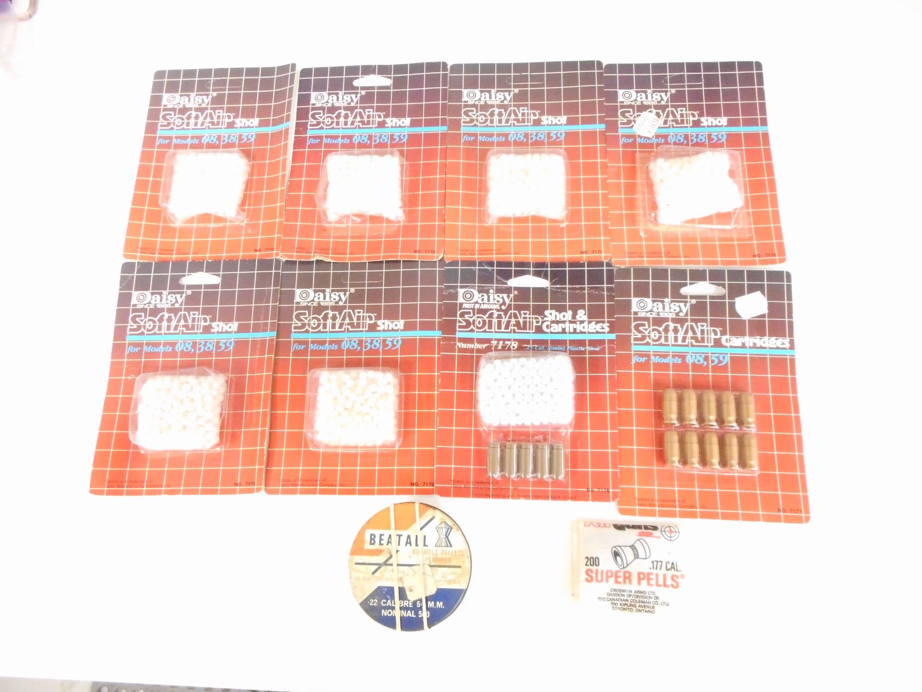 7 PACKAGES DAISY SOFT AIR SHOT FOR MODELS 08, 38, 59 SOFT AIR PISTOLS, .8 LBS .22 CAL BELLETS, .177 CAL PELLETS