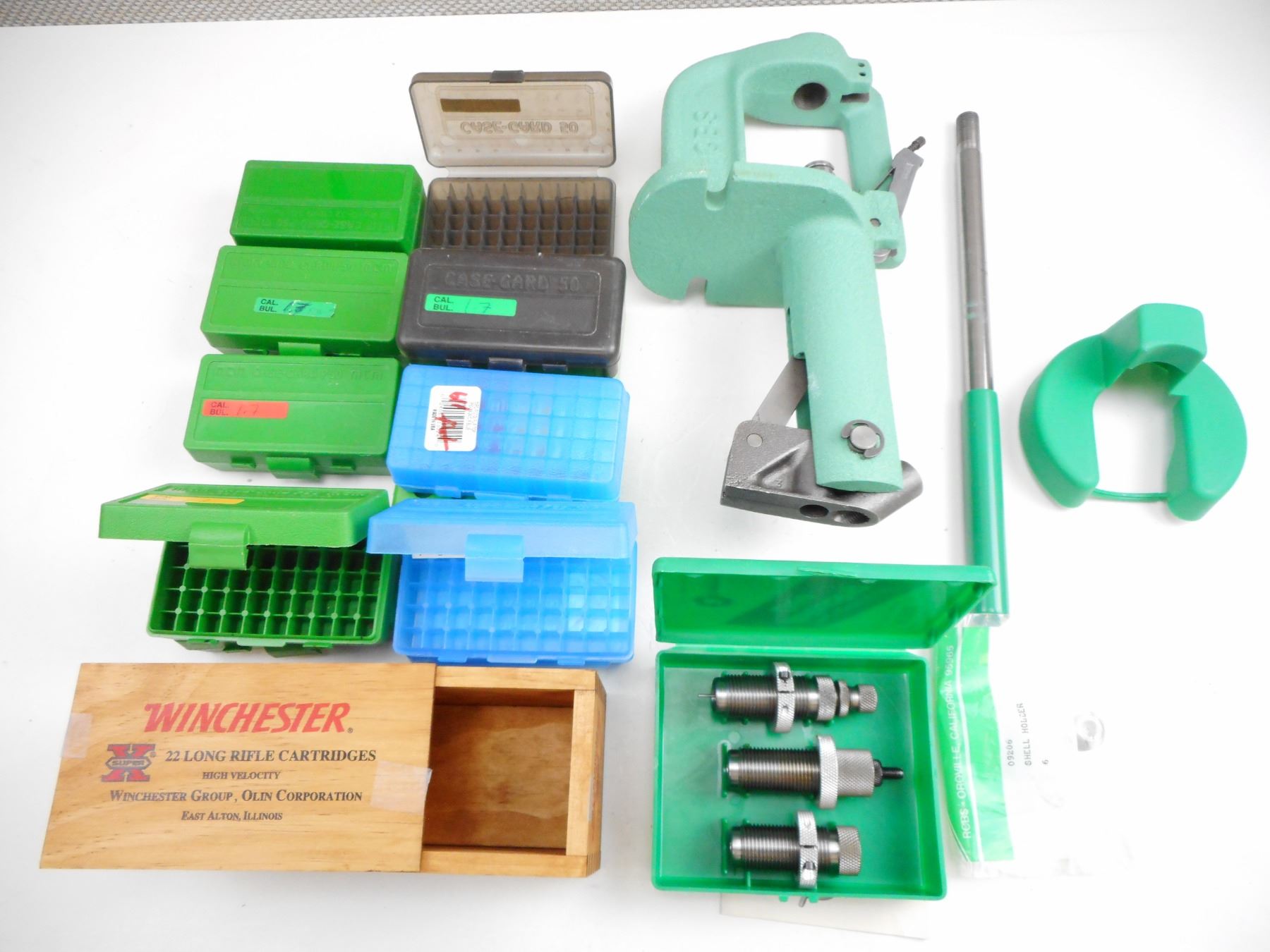 Lot 16137 RCBS RELOADING PRESS, PLASTIC AMMO BOXES, VINTAGE AMMO BOX