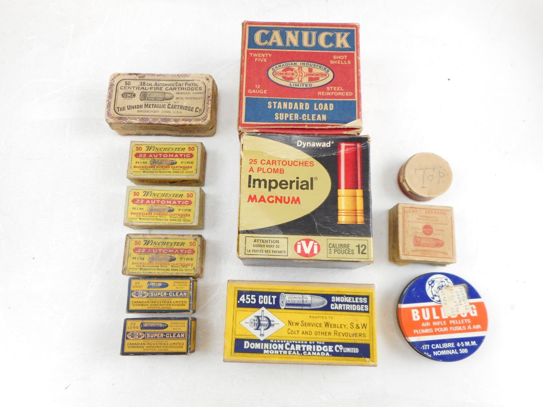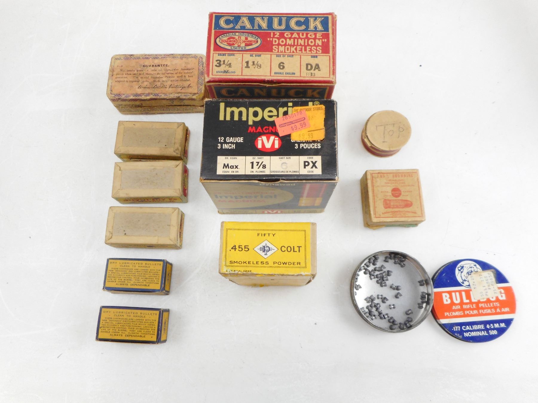11 BOXES, APPROX 25 PELLETS .177 CAL PELLETS, BOXES INCLUDE 22 SHORT DOMINION, .38 ACP UMC, .22 WINCHESTER, .455 DOMINION, CANUCK 12 GA