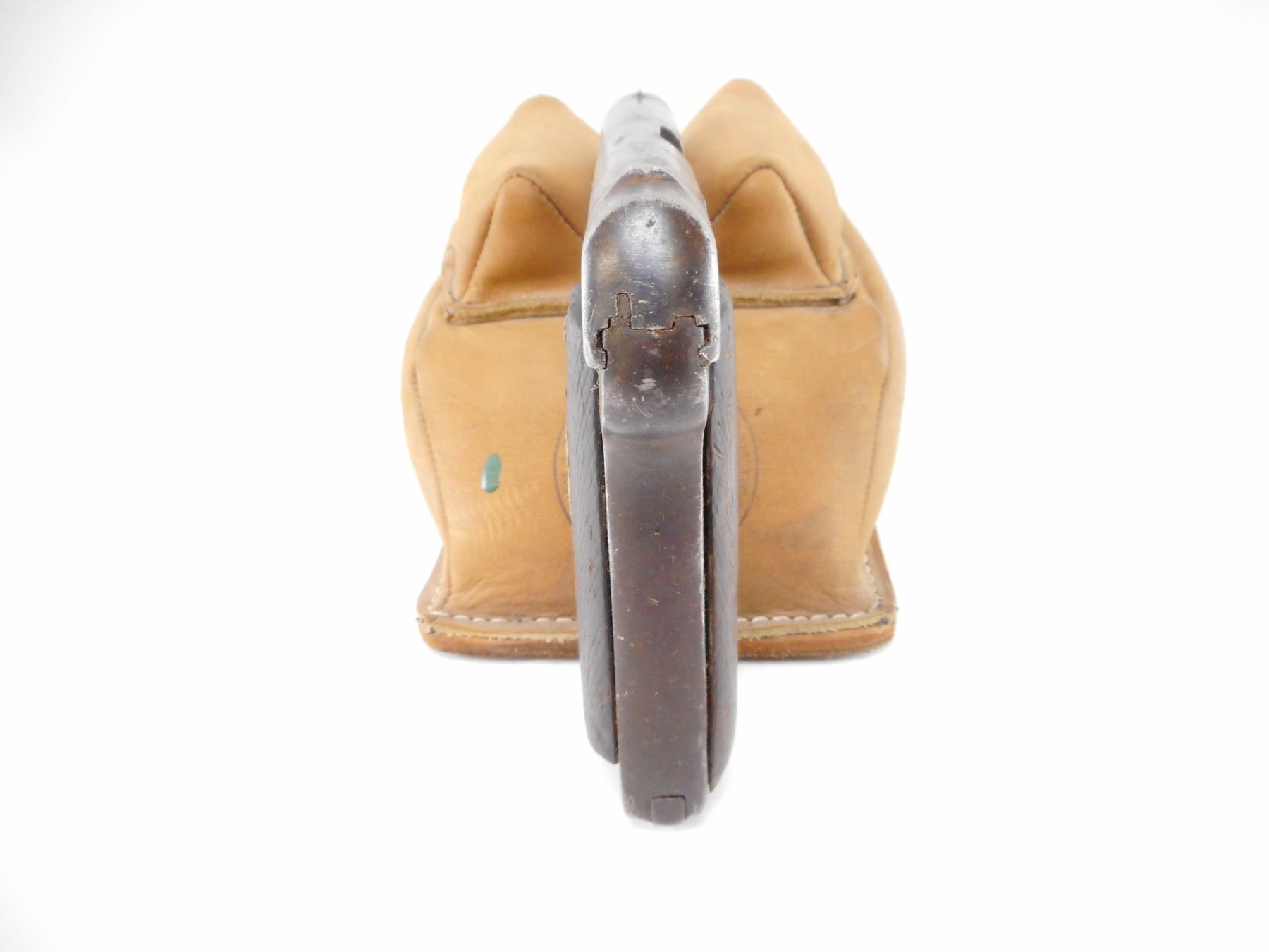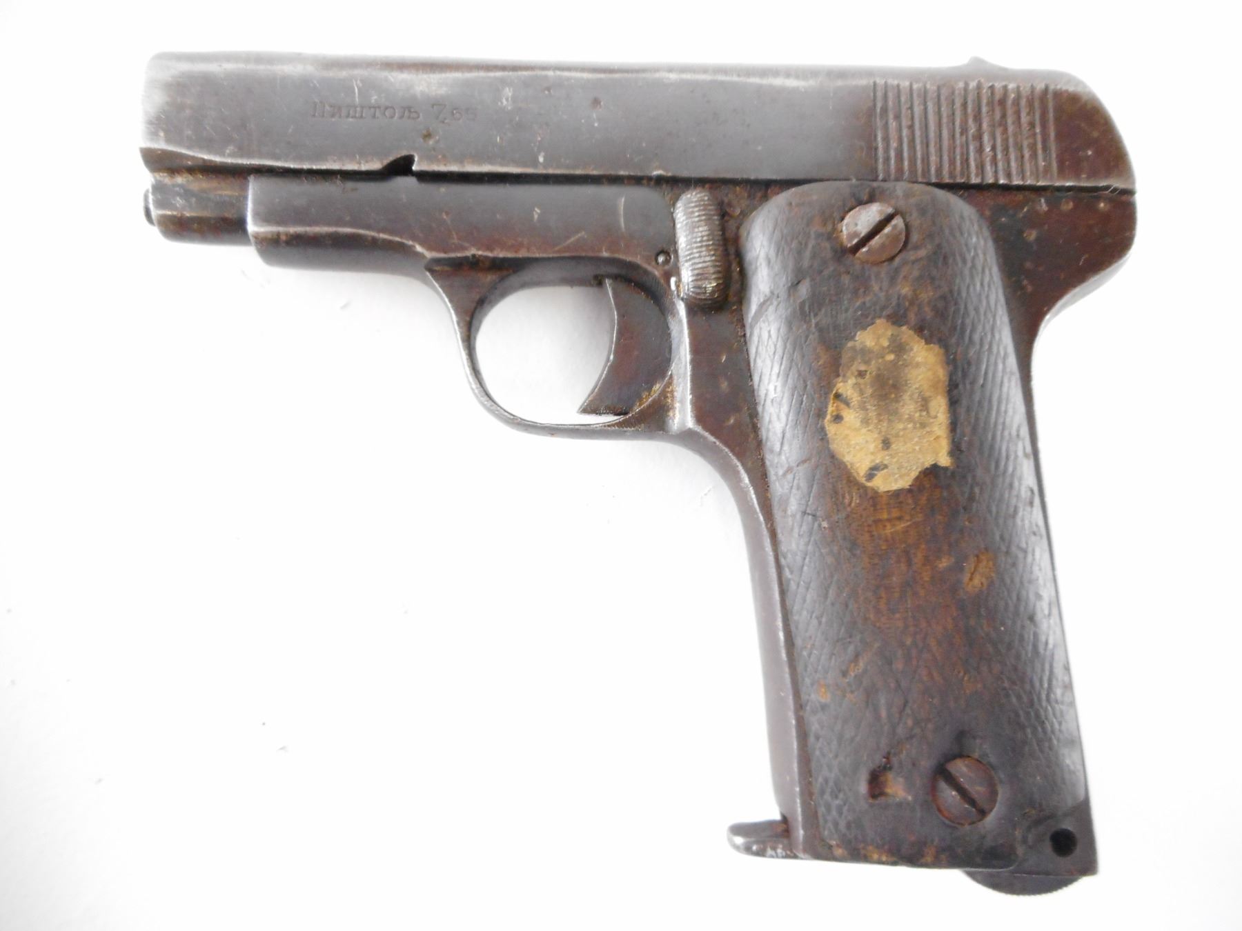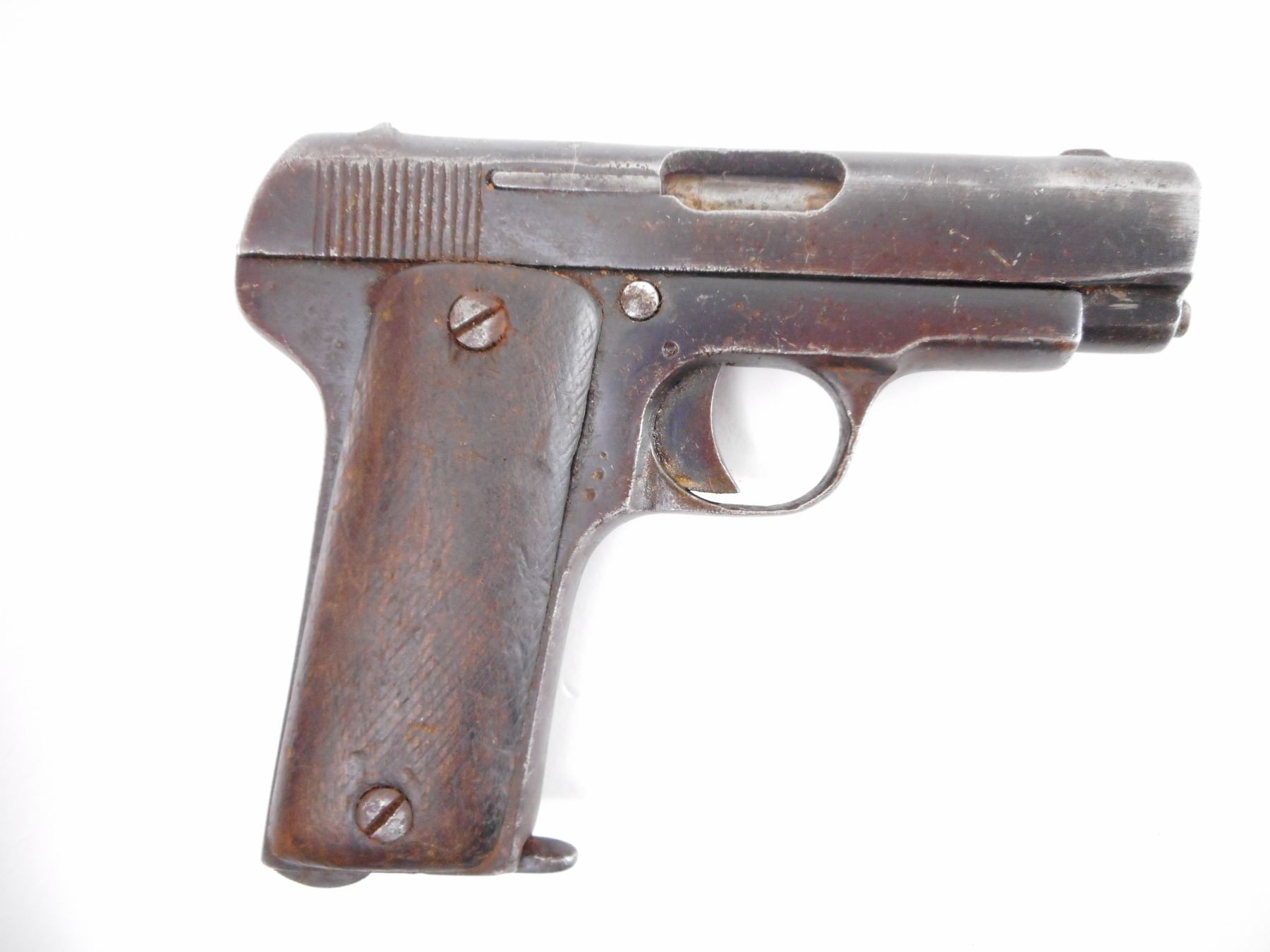 UNKNOWN , MODEL: RUBY TYPE , CALIBER: 7.65MM , COMES WITH MAGAZINE. BORE IS GOOD. BLADE FRONT AND RAISED NOTCH REAR SIGHT. CHECKERED TWO PIECE WOOD GRIPS THAT SHOW EXTENSIVE HANDLING MARKS WITH NUMEROUS CHIPS. SHOWS SOME LIGHT SURFACE RUST ON ALL METAL PART. , ACTION: SEMI AUTOMATIC HANDGUN , BARREL LENGTH: 81MM , SERIAL # 150 , CONDITION: 4/10 , CLASS: CANADIAN PROHIBITED CLASS