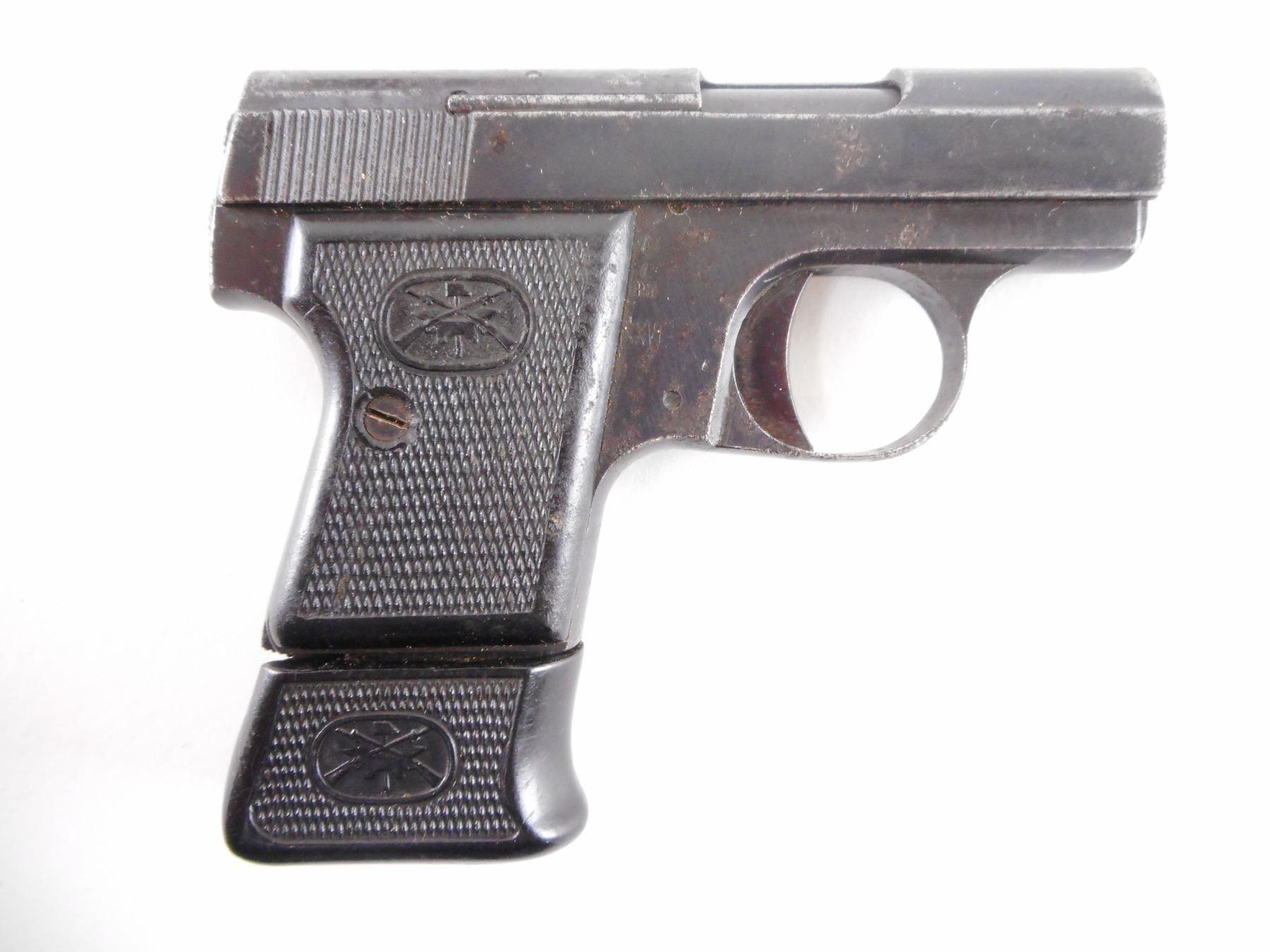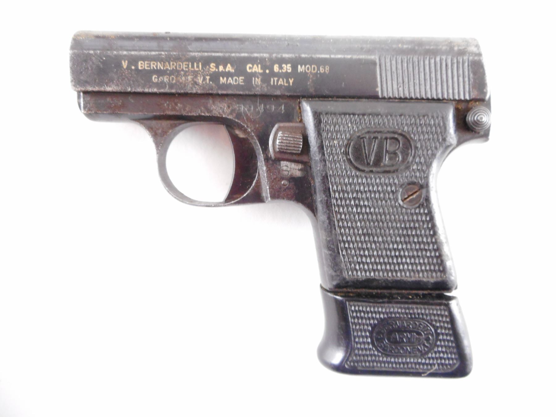 BERNADELLI , MODEL: 68 , CALIBER: 6.35MM , COMES WITH MAGAZINE. BORE IS GOOD. BLADE FRONT AND NOTCH REAR SIGHT. CHECKERED BLACK PLASTIC GRIPS. SHOWS EXTENSIVE HANDLING MARKS WITH LIGHT SURFACE PITTING ON ALL METAL PARTS. , ACTION: SEMI AUTOMATIC HANDGUN , BARREL LENGTH: 51MM , SERIAL # 99494 , CONDITION: 5/10 , CLASS: CANADIAN PROHIBITED CLASS