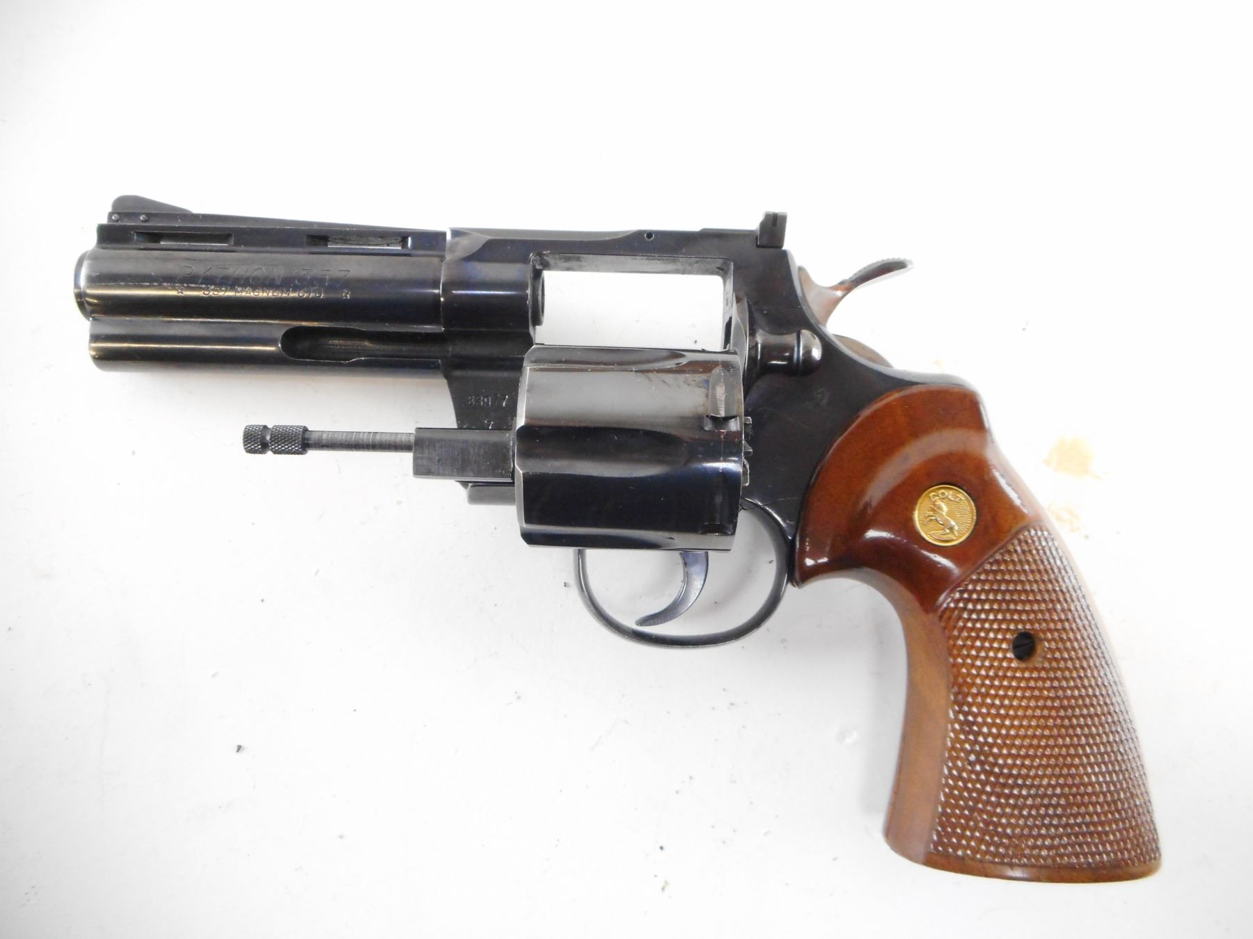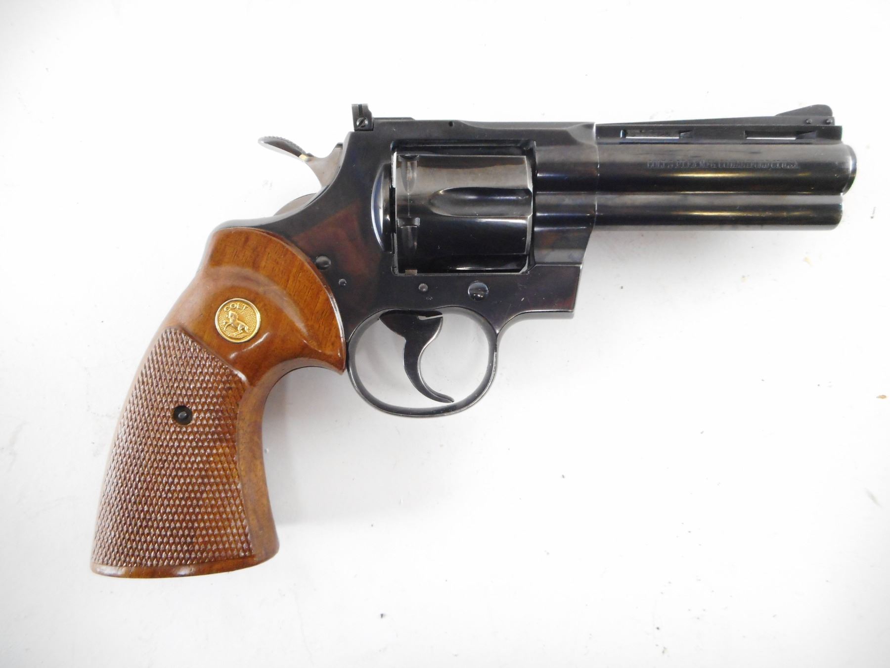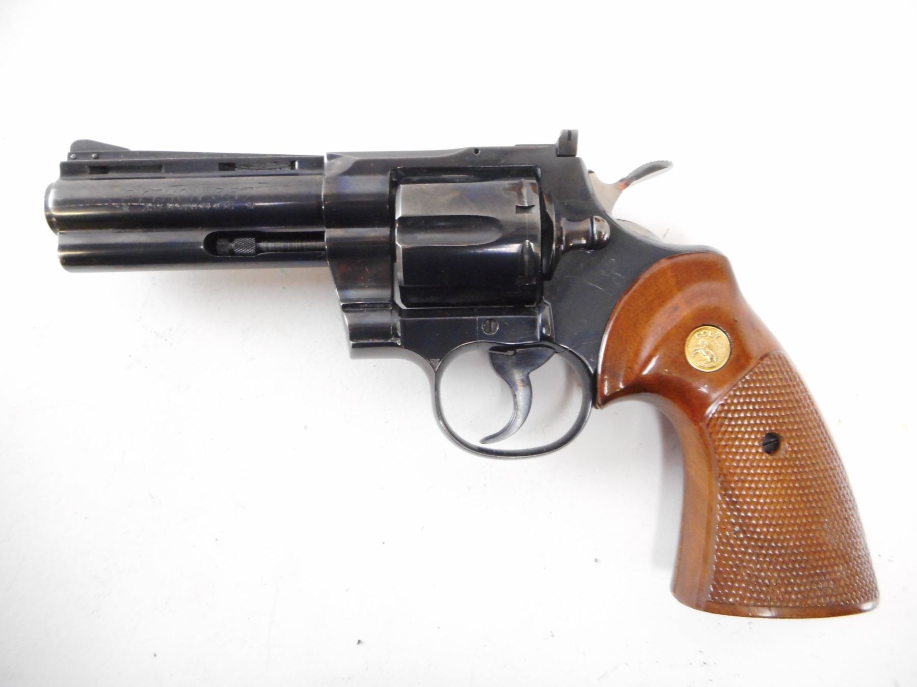 COLT , MODEL: PYTHON , CALIBER: 357 MAG , BORE IS EXCELLENT. BLADE FRONT SIGHT. ADJUSTABLE REAR SIGHT ON A VENTED RIB BARREL. CHECKERD TWO PIECE WOOD GRIPS WITH COLT LOGO. SHOWS VERY LITTLE HANDLING MARKS. HOLDS COCK, INDEXES WELL, ACTION IS TIGHT. , ACTION: REVOLVER , BARREL LENGTH: 102MM , SERIAL # 83977 , CONDITION: 8/10 , CLASS: CANADIAN PROHIBITED CLASS