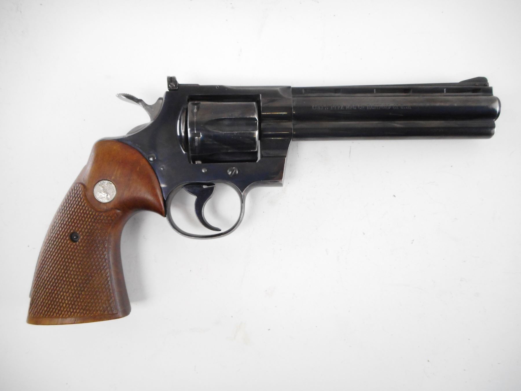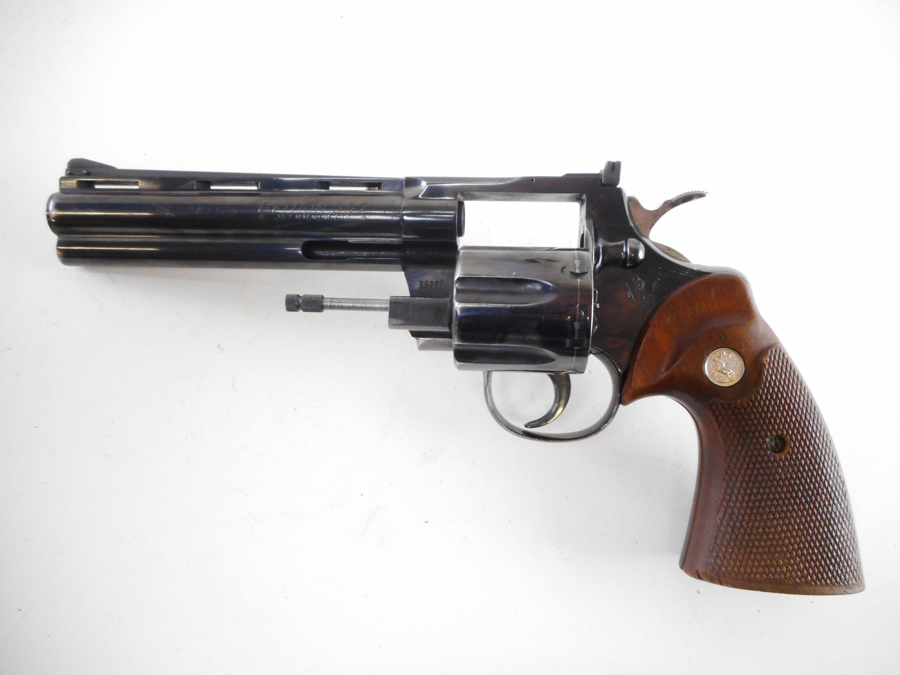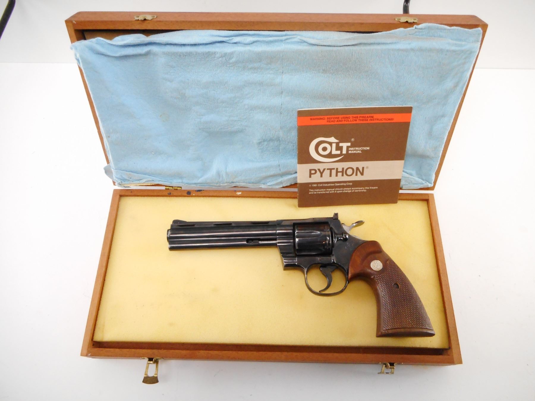 COLT , MODEL: PYTHON , CALIBER: 357 MAG , COMES WITH CASE, MANUAL. BORE IS VERY GOOD. BLADE FRONT AND ADJUSTABLE REAR SIGHT ON A VENTED RIB BARREL. CHECKERED WOOD GRIPS WITH COLT LOGO. SHOWS VERY LITTLE HANDLING MARKS. , ACTION: REVOLVER , BARREL LENGTH: 152MM , SERIAL # 15987 , CONDITION: 8/10 , CLASS: CANADIAN RESTRICTED CLASS