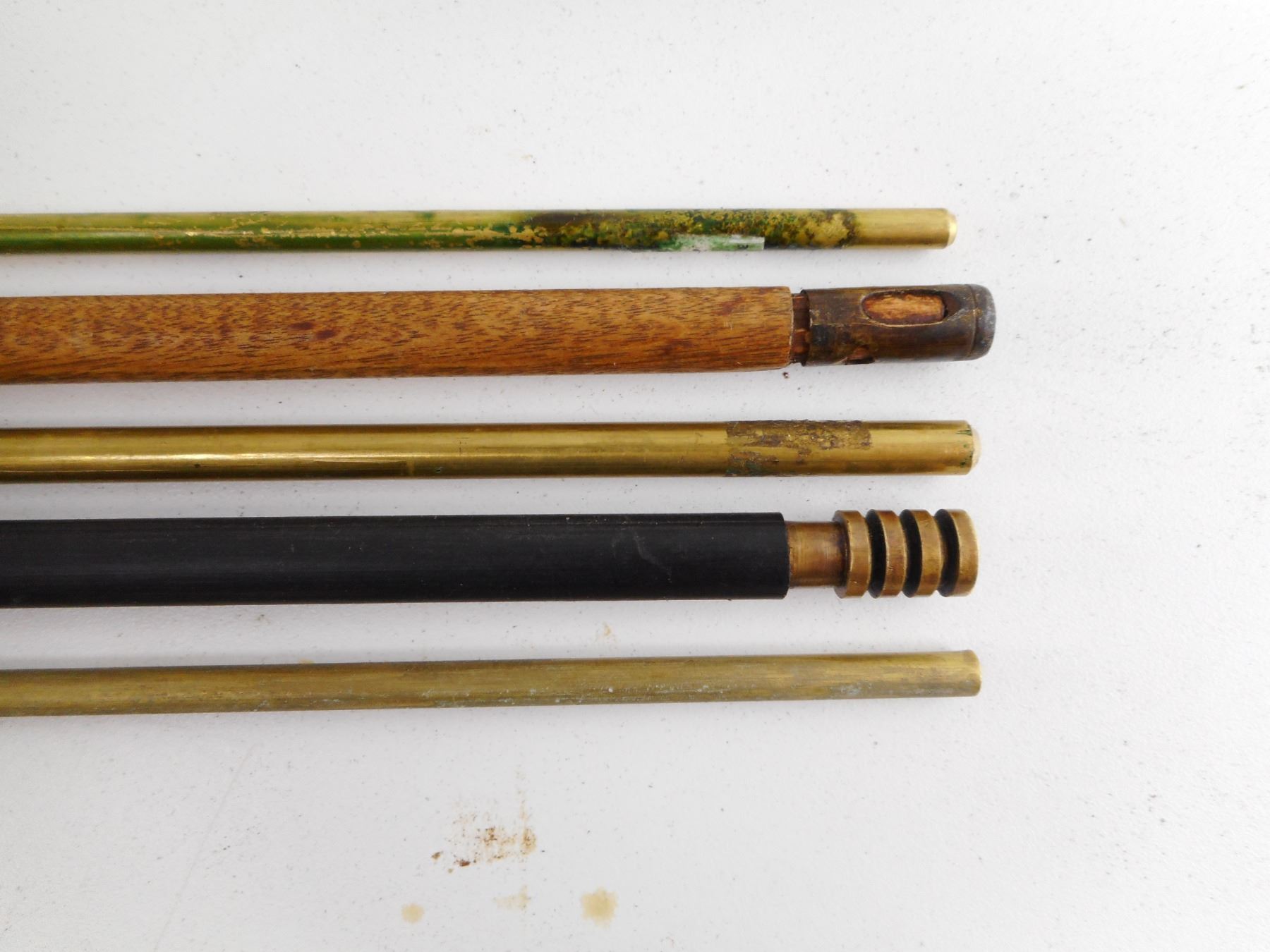 ASSORTED CLEANING RODS , (2) MUZZLE LOADERS; (1) WOODEN, (3) BRASS RIFLE CLEANING RODS. LOT OF 5