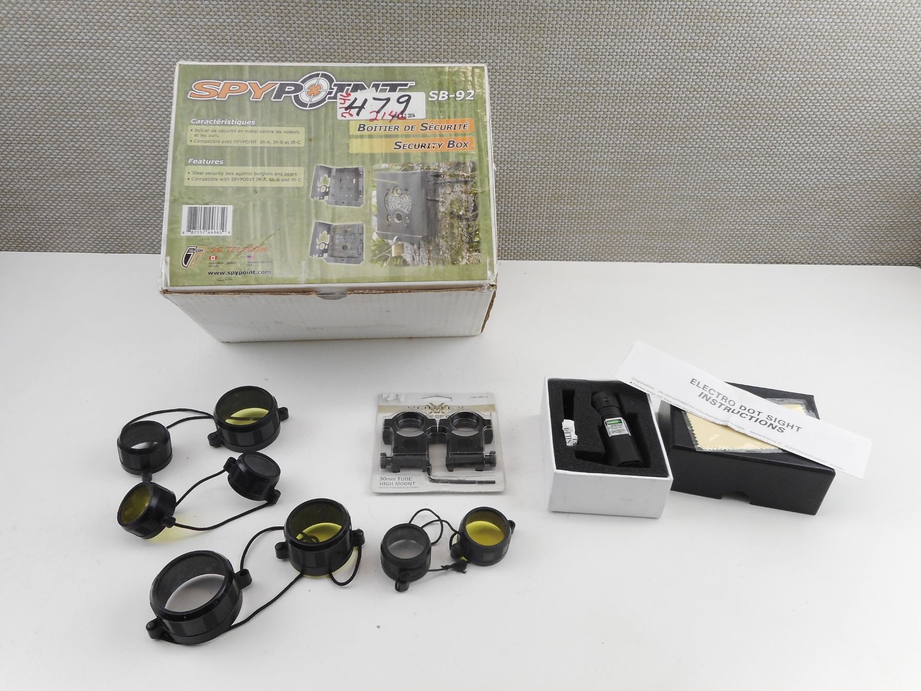 GAME CAMERA SECURITY BOX + GREEN LASER ETC , (1) SPYPOINT GAME CAM SECURITY BOX, APPEARS COMPLETE, APPROX. DIAMETER 8.5X7.25X4" (1)GREEN LASER (WORKS), WITH INSTRUCTIONS, ALLEN KEY. VARIOUS BIKINI STYLE LENS CAPS, (1) VORTEX 30MM TUBE HIGH MOUNT RINGS, APPEARS NEW, IN ORIGINAL PACKAGE. SEE PHOTO.