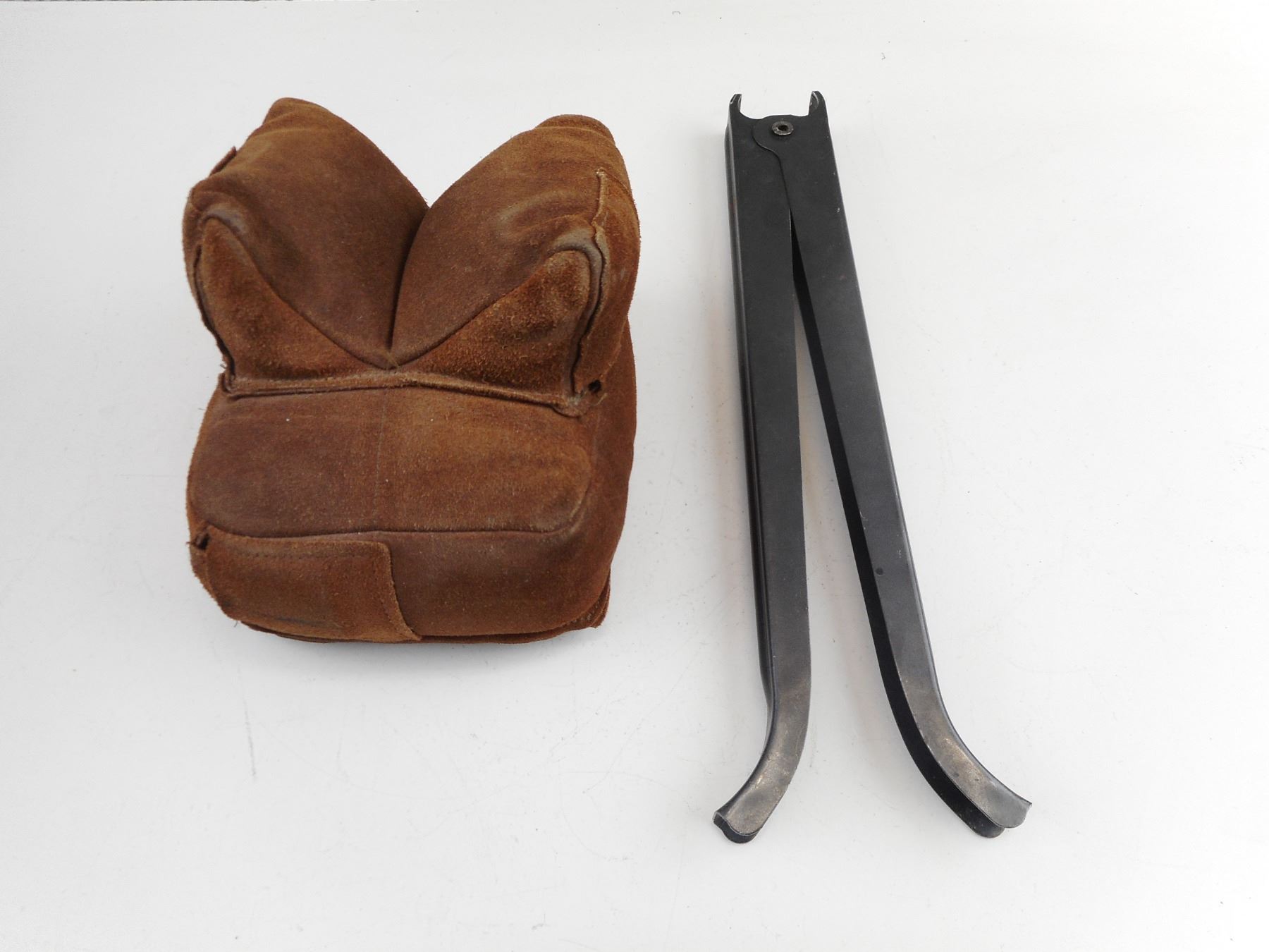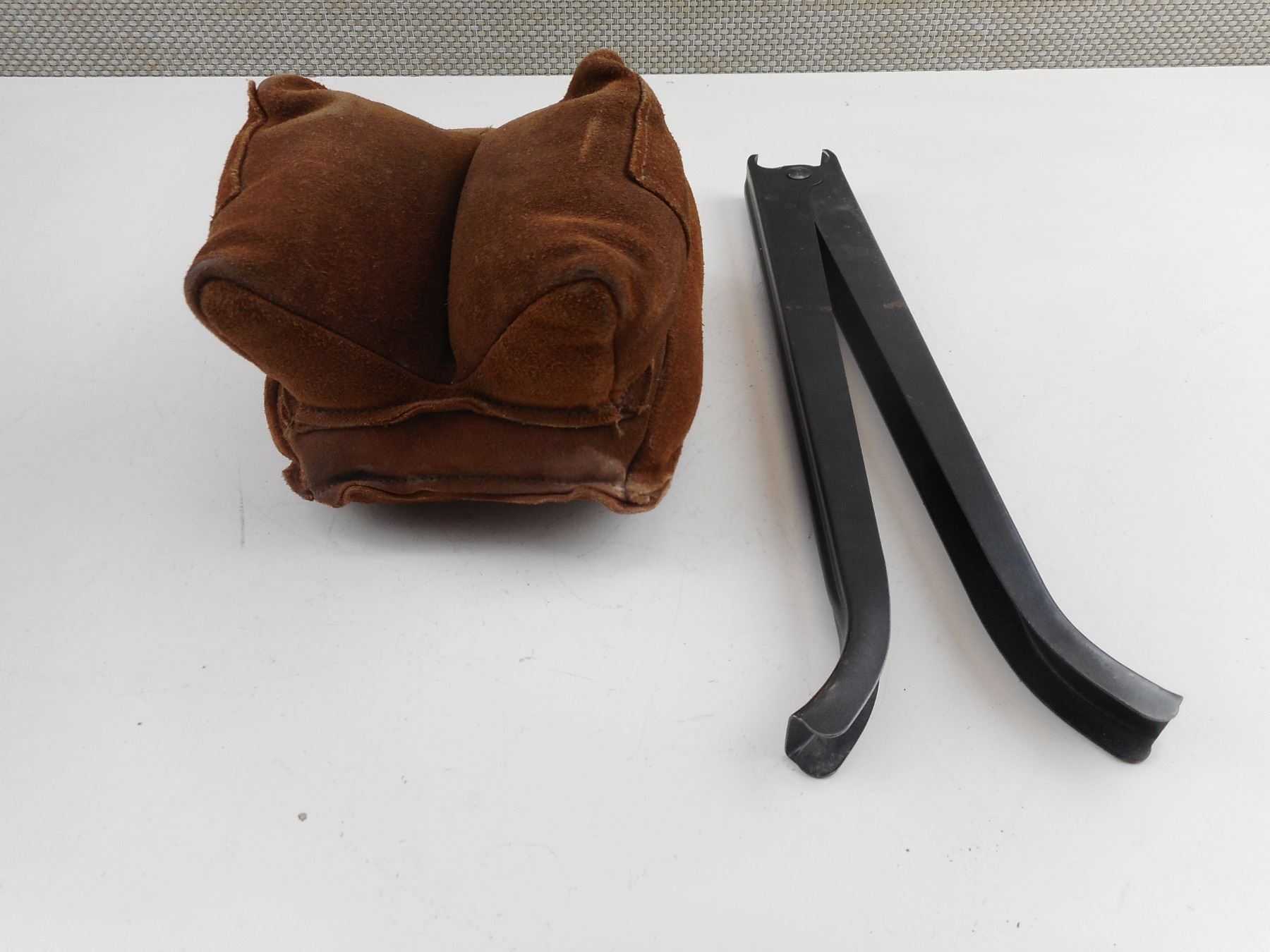 BIPOD + SHOOTING REST , (1) STEEL CLAMP ON BIPOD, APPROX. LENGTH 11.5", (1) REAR SHOOTING BAG (FILED). LOT OF 2. SEE PHOTO.