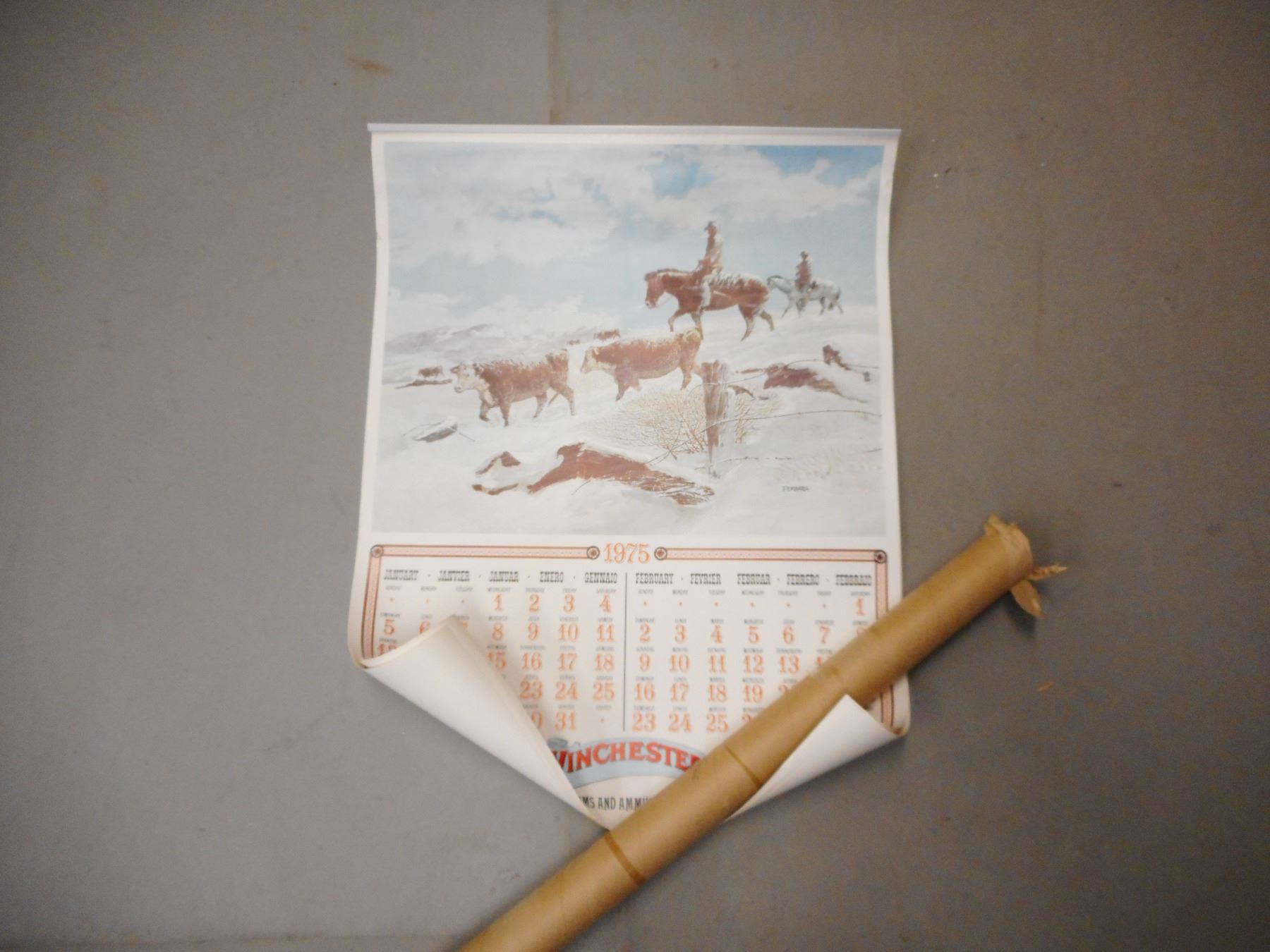 WINCHESTER CALENDAR , YEAR 1975, GOOD CONDITION, COMES IN CARDBOARD TUBE PACKAGE.