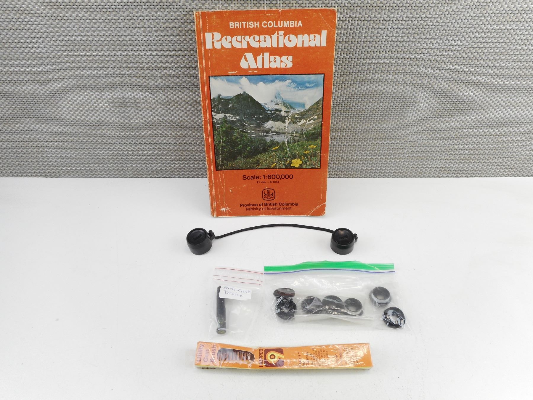 OUTERS CLEANING KITS ETC , (1) OUTER INCOMPLETE .38 CAL CLEANING KIT, (1) OUTER INCOMPLETE .22 CAL CLEANING KIT, (2) HKS COMPETITION AMMO BOX, HOLD 60 ROUNDS, USE WITH 586-A, PYA, M3-A, (1) BRITISH COLUMBIA RECREATIONA ATLAS, (1) ANTI-CANT DEIVCE. ETC. SEE PHOTO.
