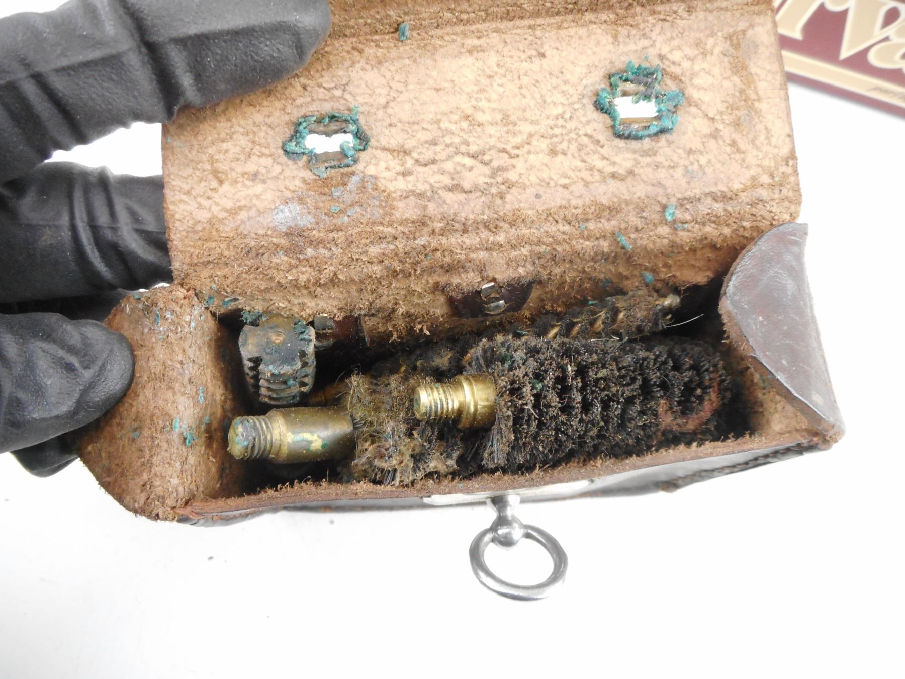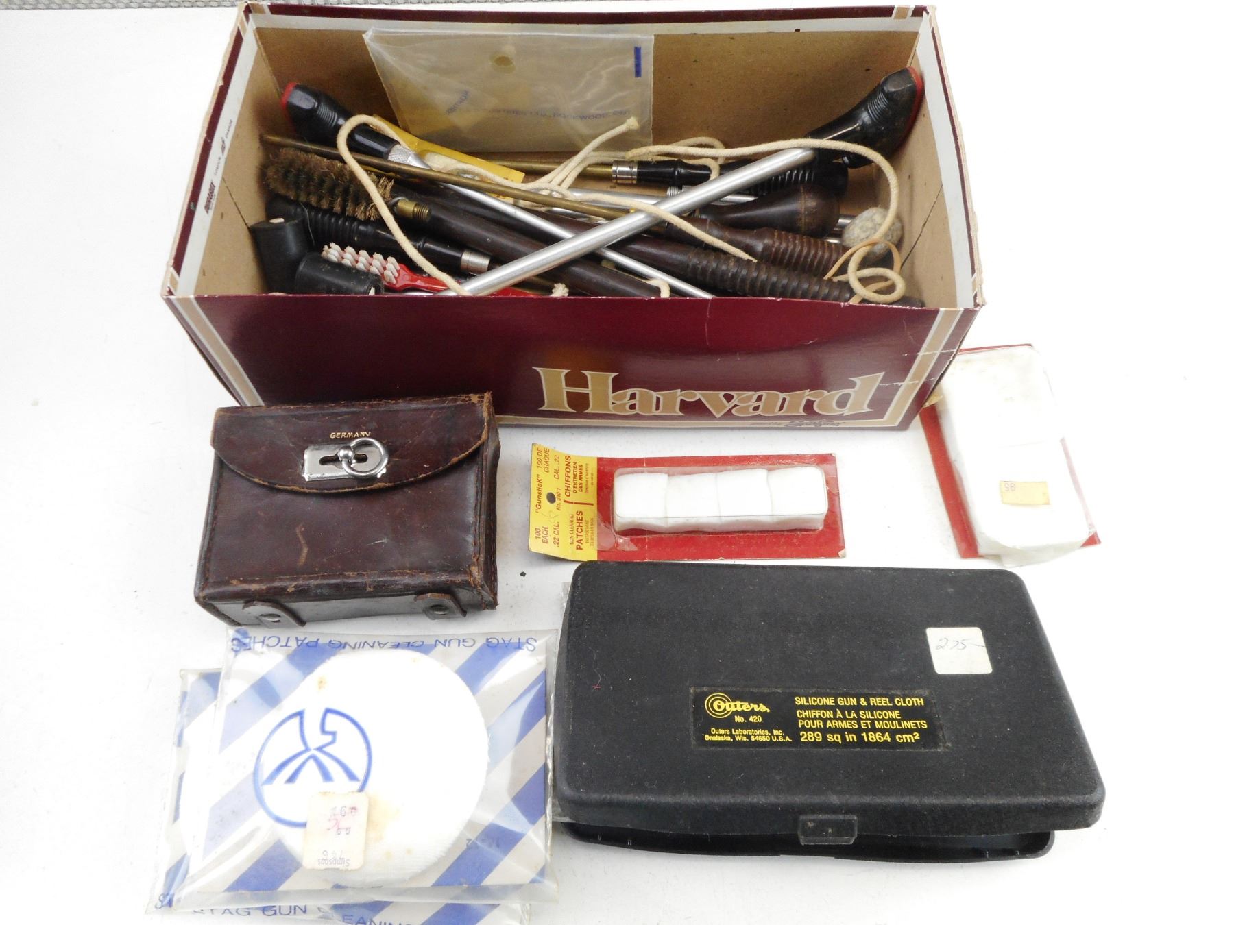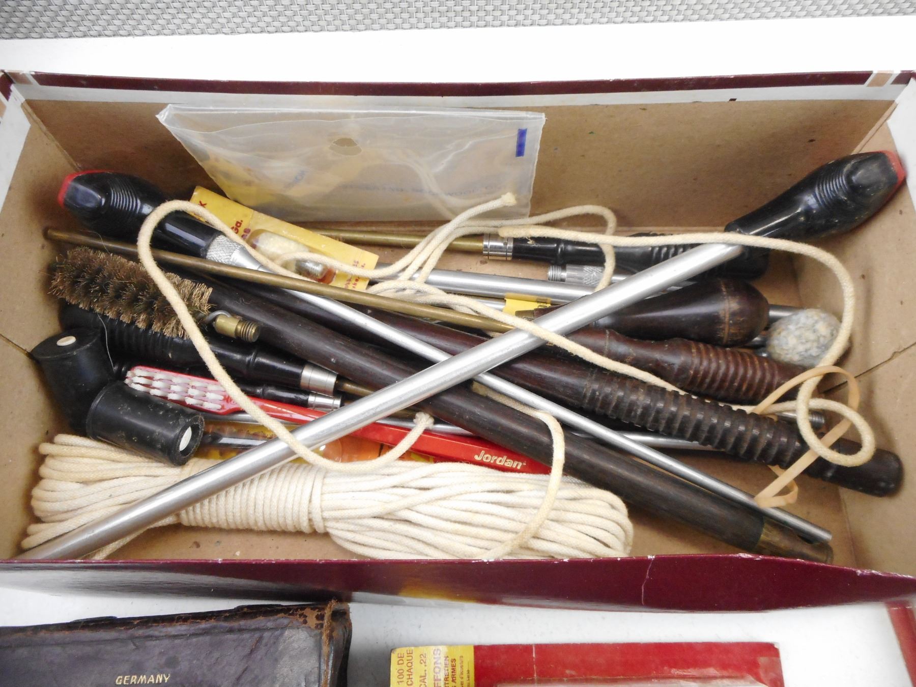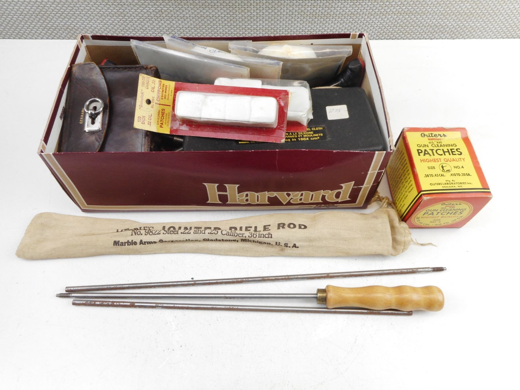 ASSORTED CLEANING ACCESSORIES , VARIOUS CLEANING RODS, MULTIPLE PACKS OF CLEANING PATCHES, VARIOUS BRUSHES, (1) MARBLE'S JOINTED RIFLE CLEANING ROD, NO. 9822 STEEL.22 AND .25 CALIBER, 36",(MAY BE INCOMPLETE). SEE PHOTO.