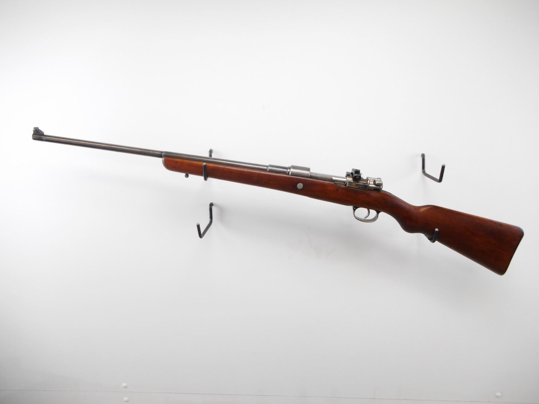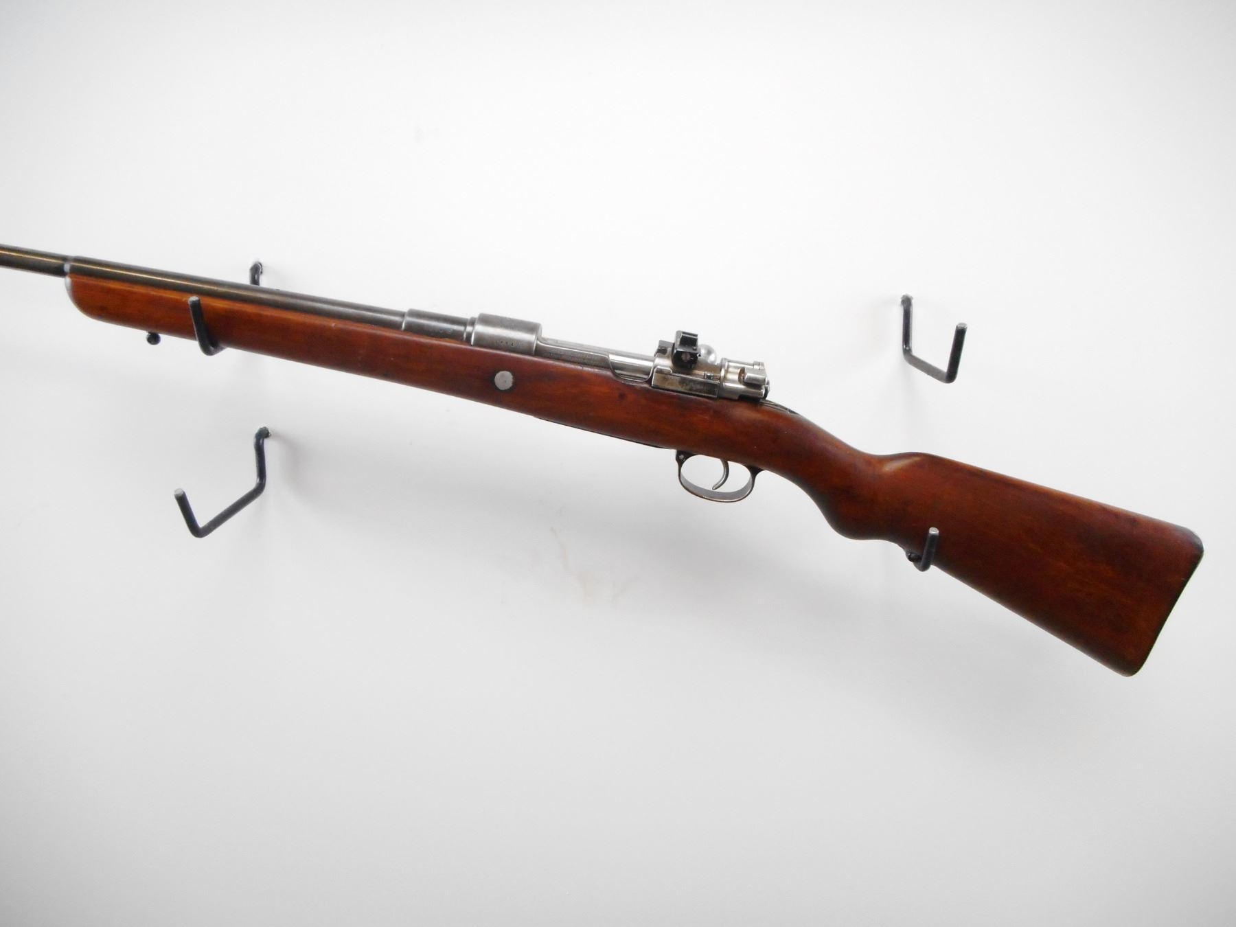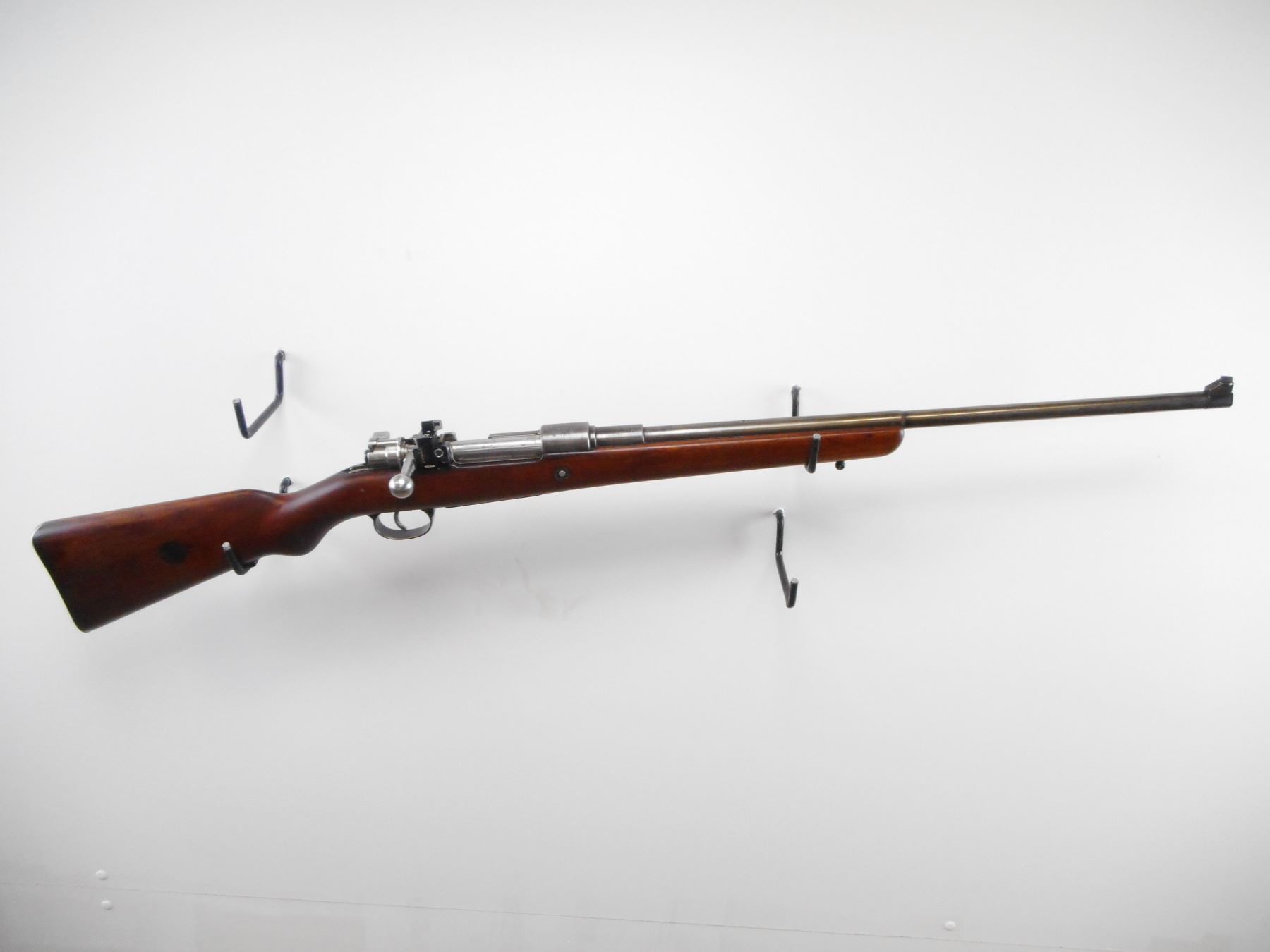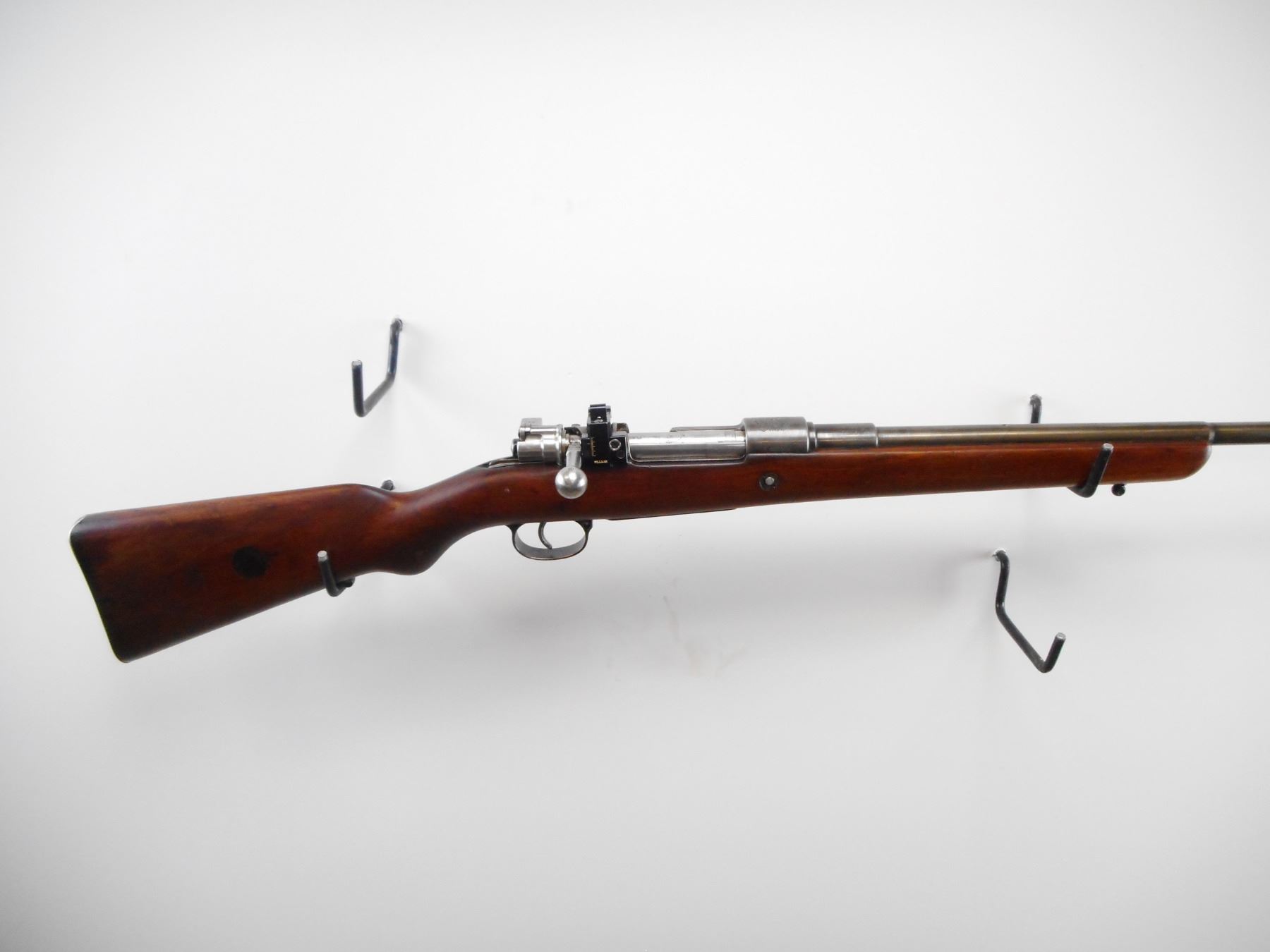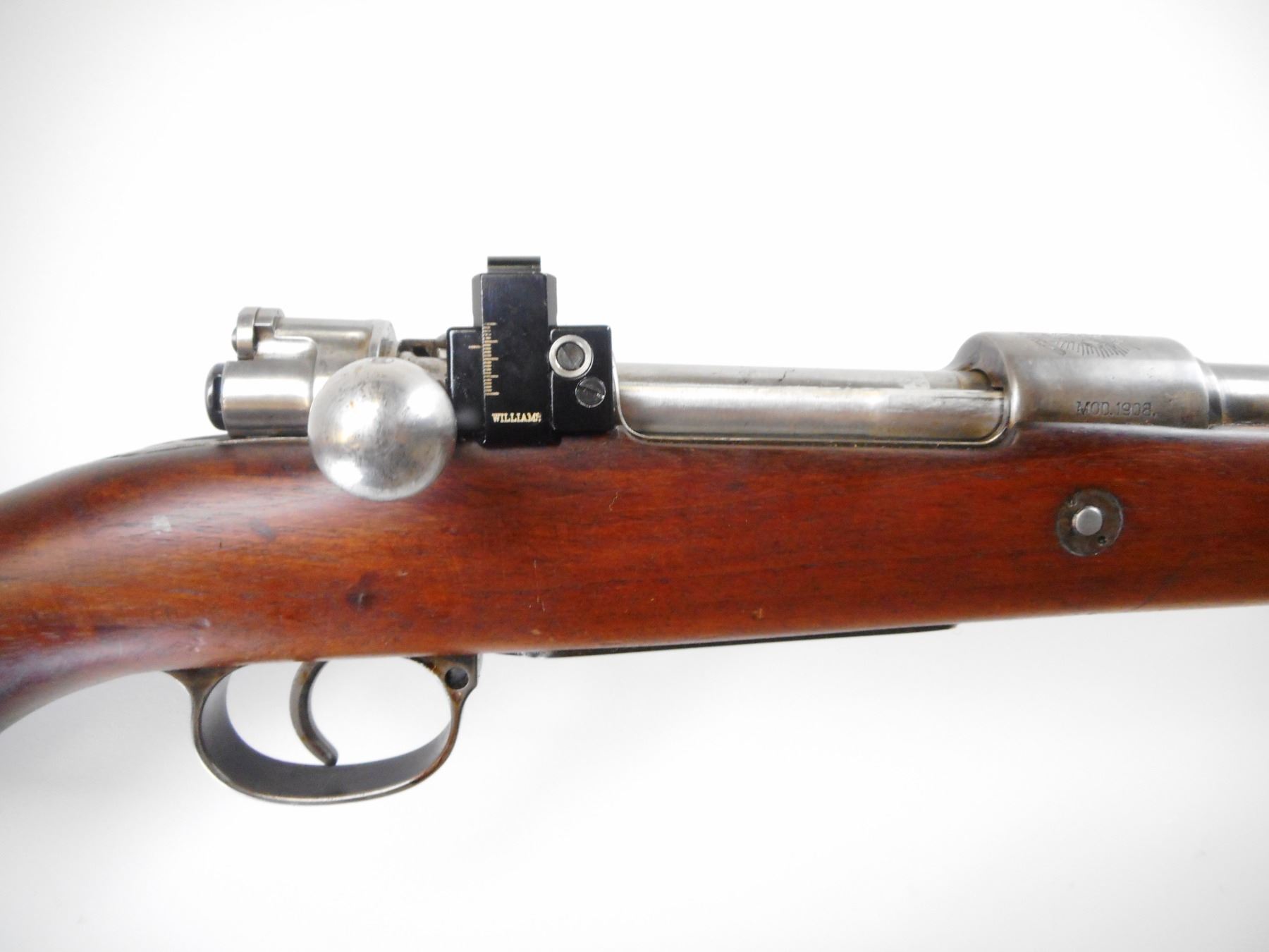 BRAZILIAN , MODEL: MAUSER 1908 SPORTER , CALIBER: 7 X 57MM , BORE IS GOOD, WORN. BARELY CORN FRONT WITH RAMP. STRAIGHT BOLT HANDLE. WILLIAMS PEEP SIGHT ON REICEVER. SMOOTH ONE PIECE WOOD STOCK. STEEL BUTT PLATE. SLING STUDS. METAL SILVER/GREY. SHOWS WEAR AND HANDLING MARKS. STOCK SHOWS NUMEROUS WEAR AND HANDLING MARKS. , ACTION: BOLT ACTION RIFLE , BARREL LENGTH: 23 1/2" , SERIAL# 5694M , CONDITION:5/10 , CLASS: CANADIAN NON RESTRICTED CLASS