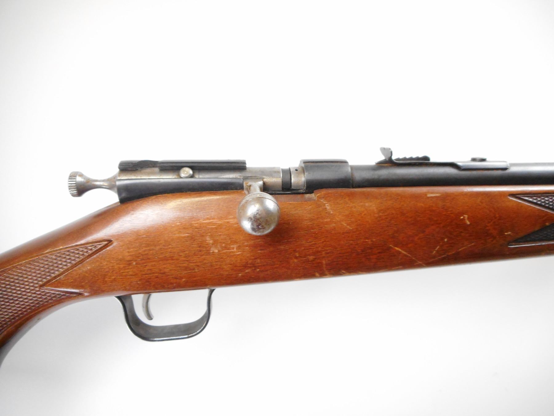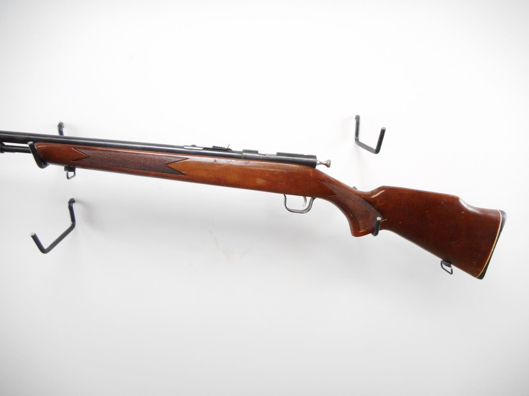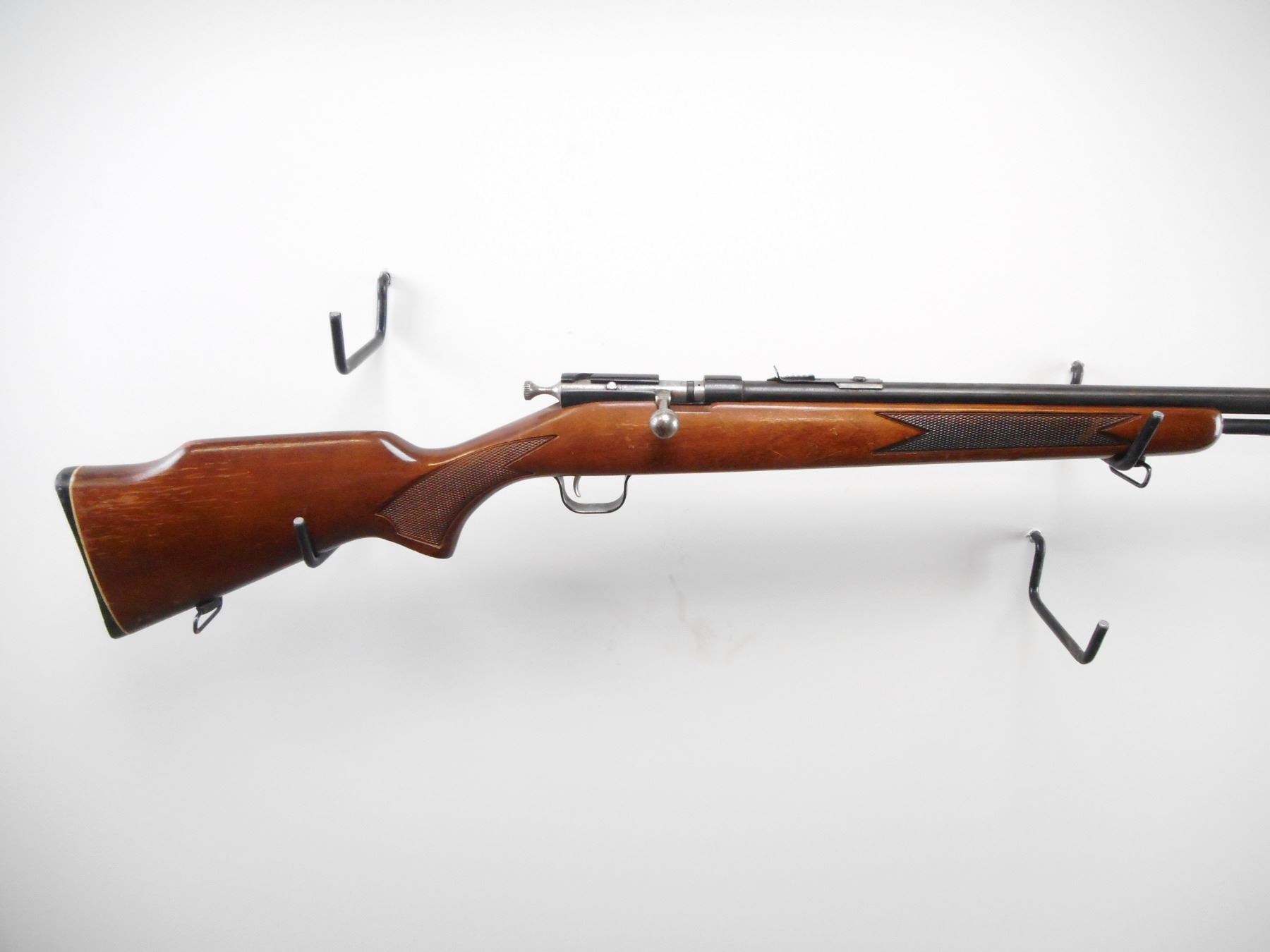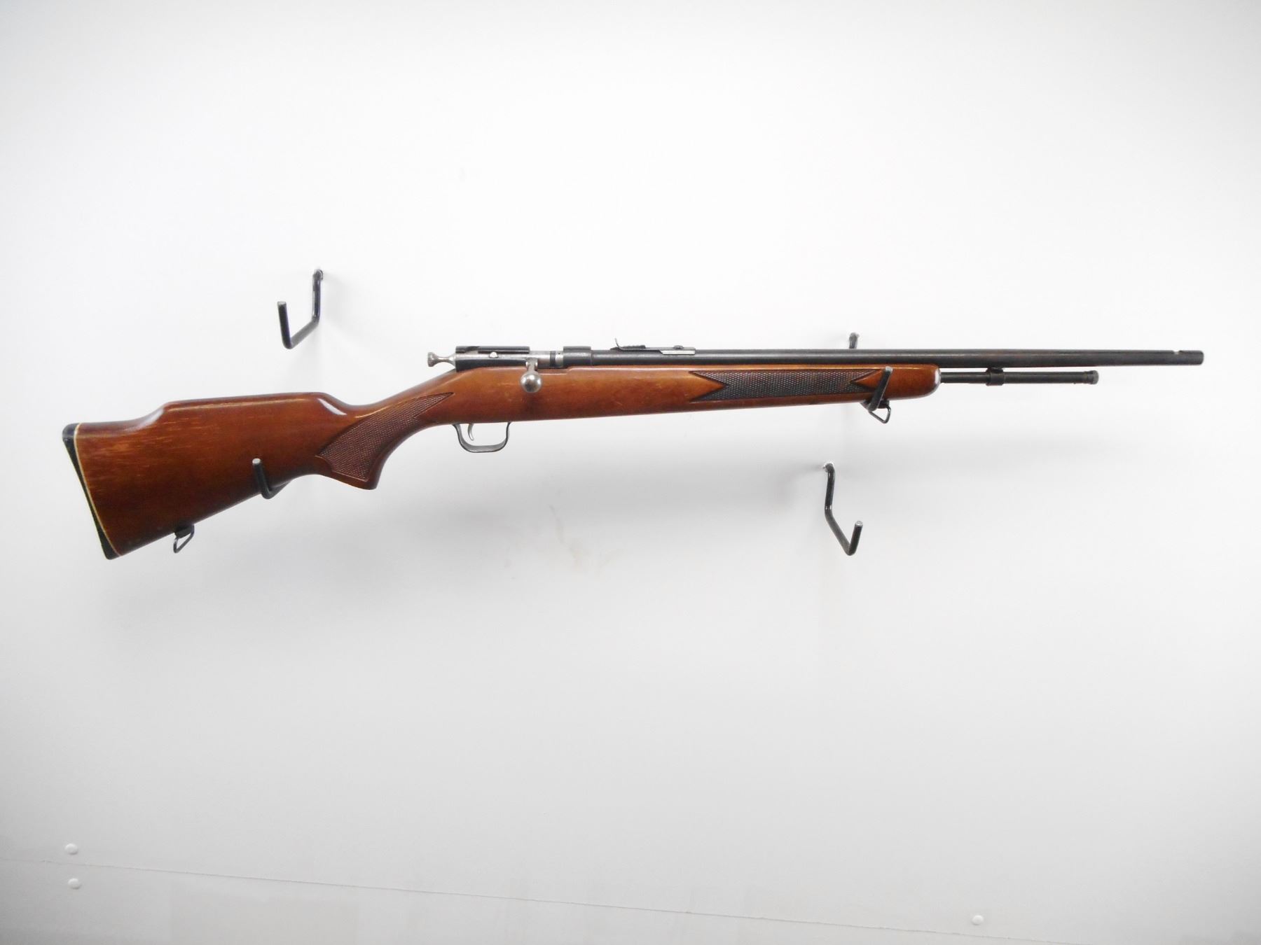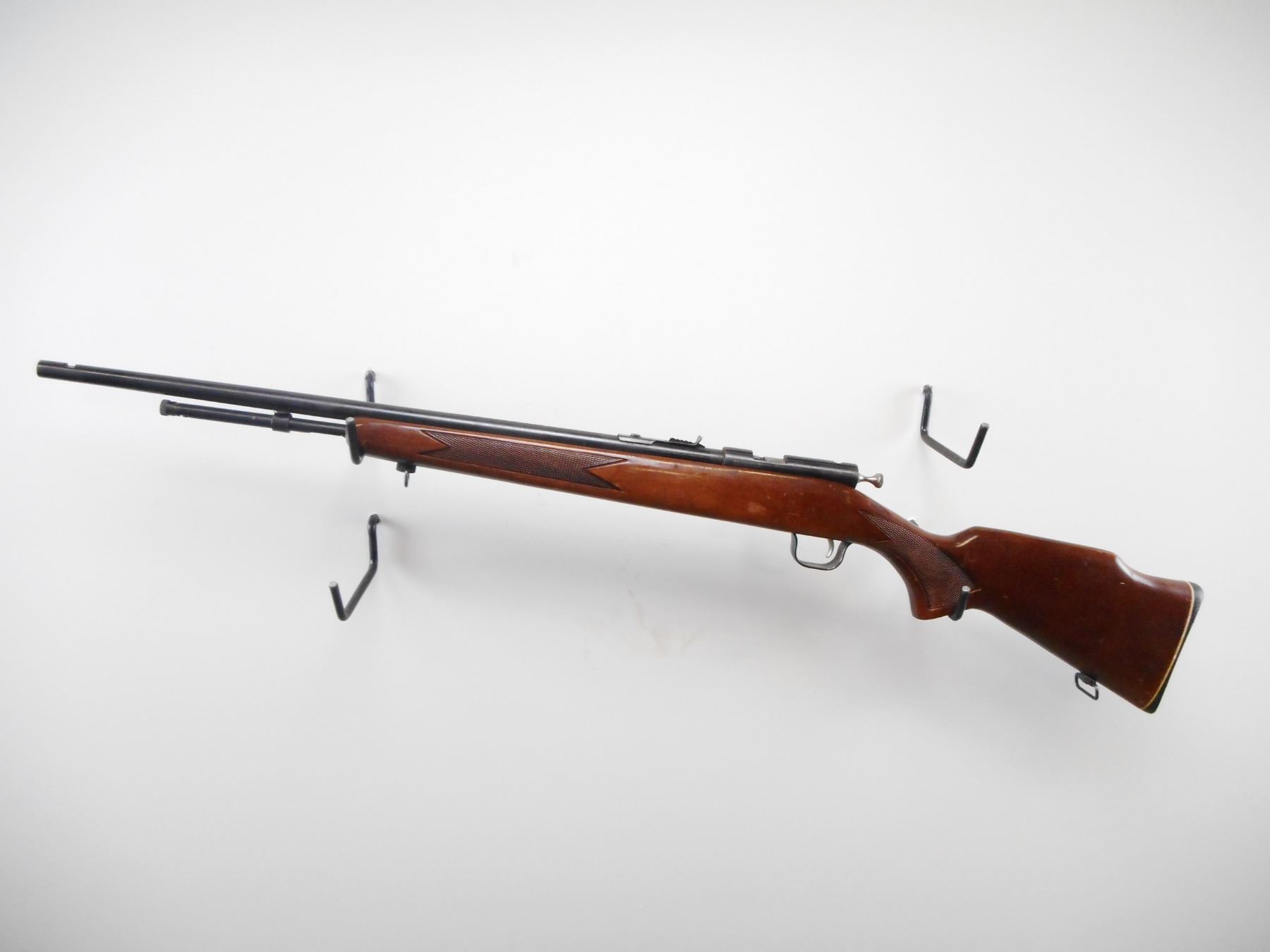 COOEY , MODEL: 600 , CALIBER: 22 LR , BORE IS VERY GOOD. MISSING FRONT SIGHT. U NOTCH REAR SIGHT. GROOVED RECEIVER. ONE PIECE WOOD STOCK. CHECKERED FOREARM AND PISTOL GRIP. GROOVED BLACK POLYMER BUTT PLATE. SLING SWIVELS. METAL SHOWS LIGHT RUST SPECKLES WEAR. STOCK SHOWS HANDLING MARKS AND WEAR. , ACTION: BOLT ACTION RIFL E , BARREL LENGTH: 22" , SERIAL# CG006049 , CONDITION:5/10 , CLASS: CANADIAN NON RESTRICTED CLASS