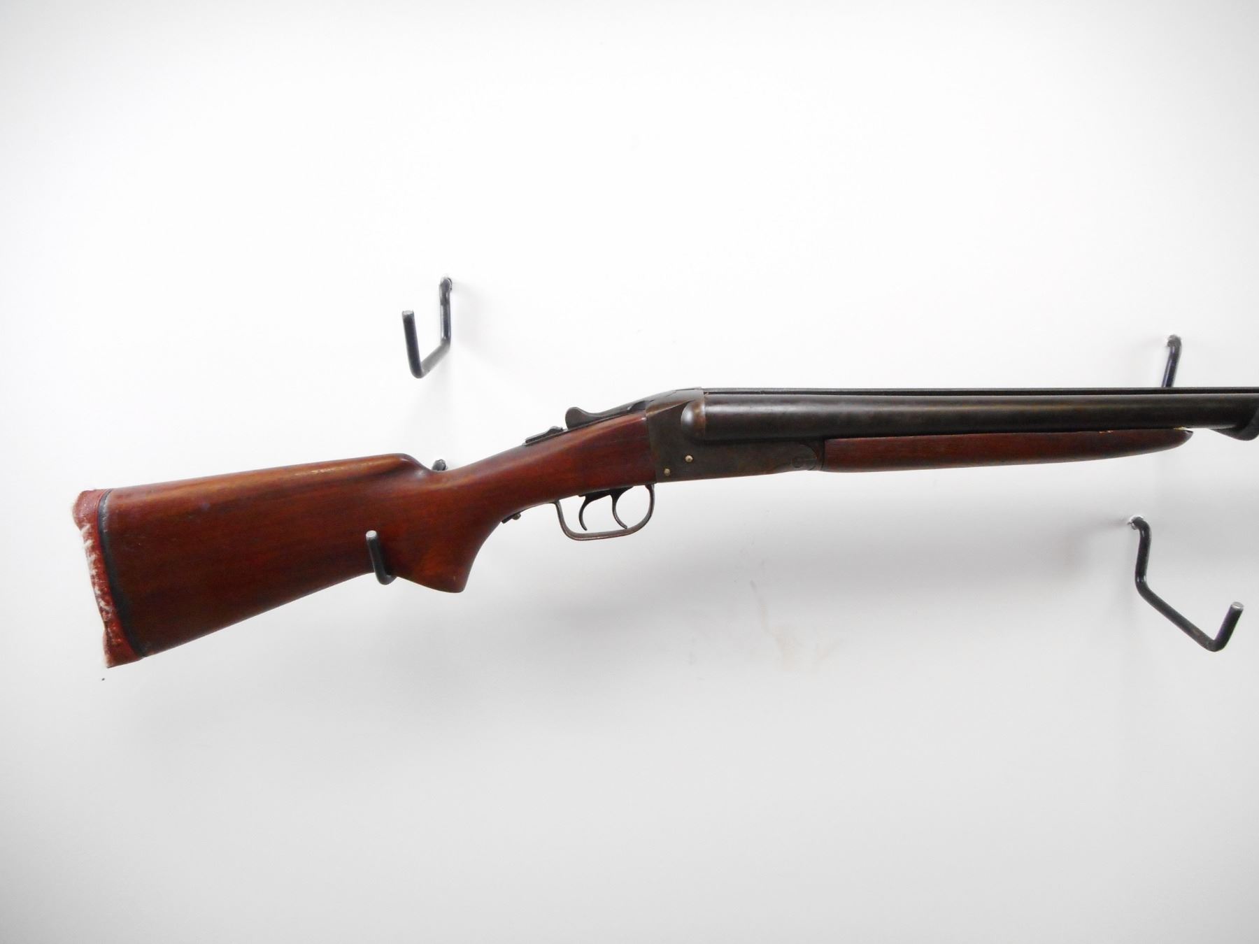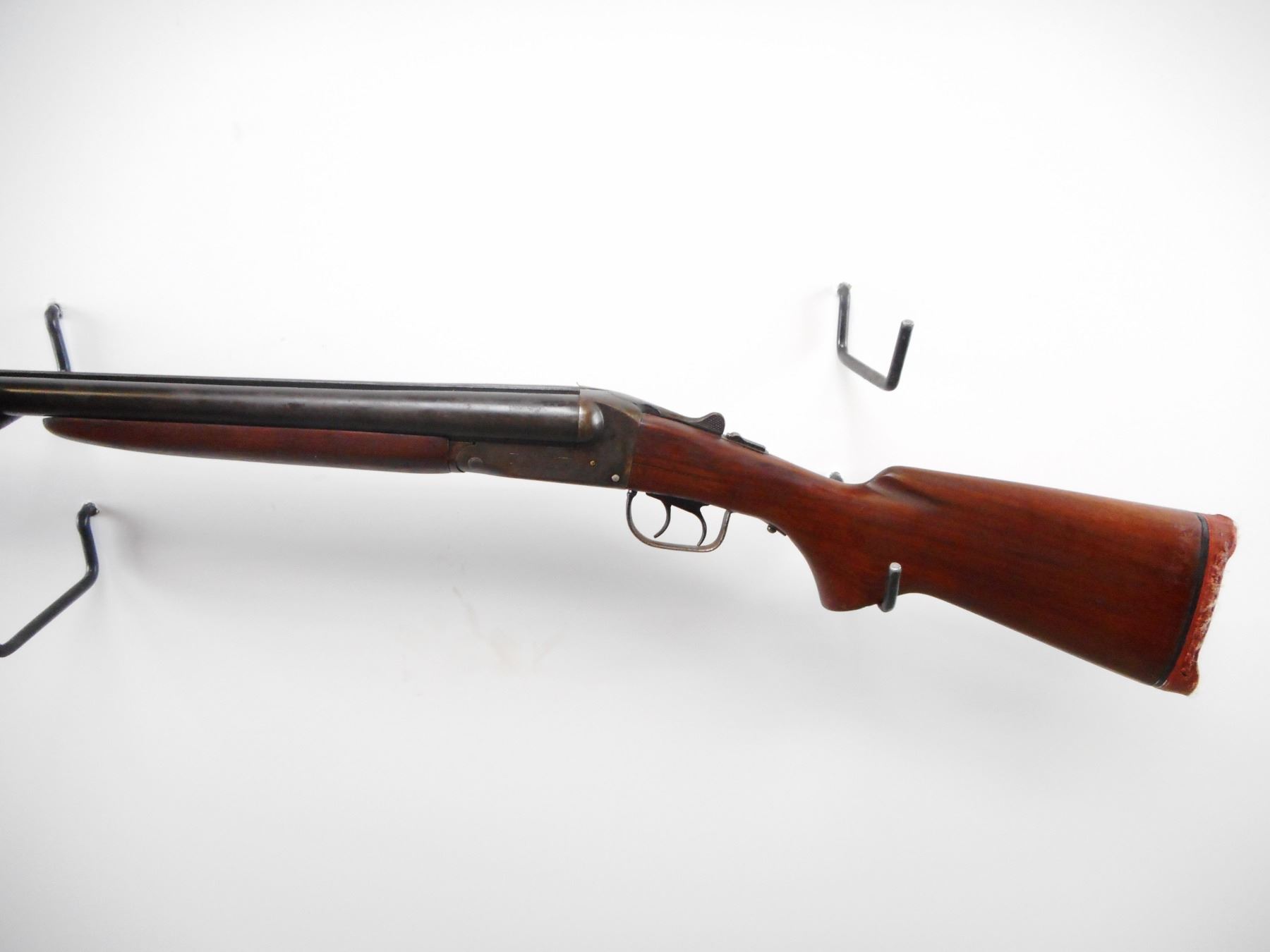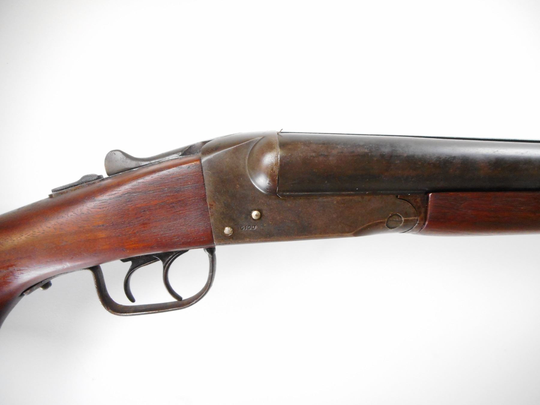 STEVENS , MODEL: 5100 , CALIBER: 12 GA X 2 3/4" , I/C AND I/M CHOKE. BORES ARE VERY GOOD. BRASS BEAD. SMOOTH TWO PIECE WOOD STOCKS. DEFORMED RED RUBBER RECOIL PAD. STOCK CRACKED BESIDE RECEIVER. METAL FINISH SHOWS WEAR AND HANDLING MARKS. STOCK SHOWS HANDLING MARKS. , ACTION: HINGE SXS SHOTGUN , BARREL LENGTH: 25 1/2" , SERIAL# N/A , CONDITION:5/10 , CLASS: CANADIAN NON RESTRICTED CLASS