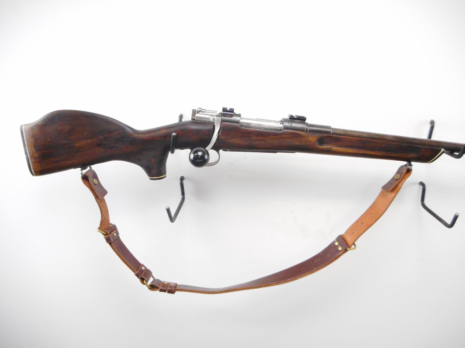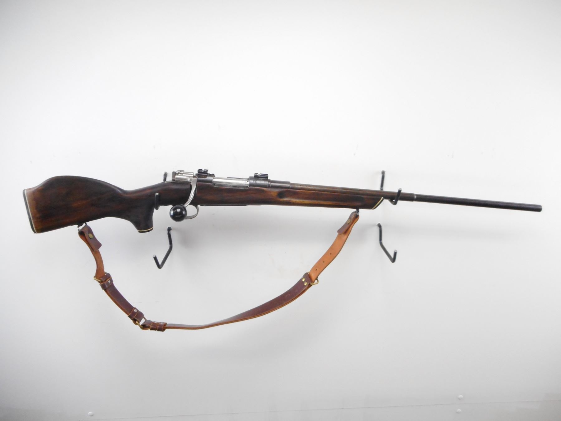 SWEDISH MAUSER , MODEL: SMALL RING SPORTER , CALIBER: 6.5 X 55 , BORE IS VERY GOOD. ROUND BARREL NO SIGHTS. RECEIVER DRILLED AND TAPPED WITH WEAVER BASES. EXTENED LARGE KNOB BOLT HANDLE. ONE PIECE SMOOTH WOOD STOCK. SMOOTH BUTT PLATE. SLING SWIVELS WITH BROWN LEATHER SLING. BLUEING SHOWS WEAR AND HANDLING MARKS. STOCK SHOWS WEAR AND HANDLING MARKS. , ACTION: BOLT ACTION RIFLE , BARREL LENGTH: 25" , SERIAL# 424371 , CONDITION:4/10 , CLASS: CANADIAN NON RESTRICTED CLASS