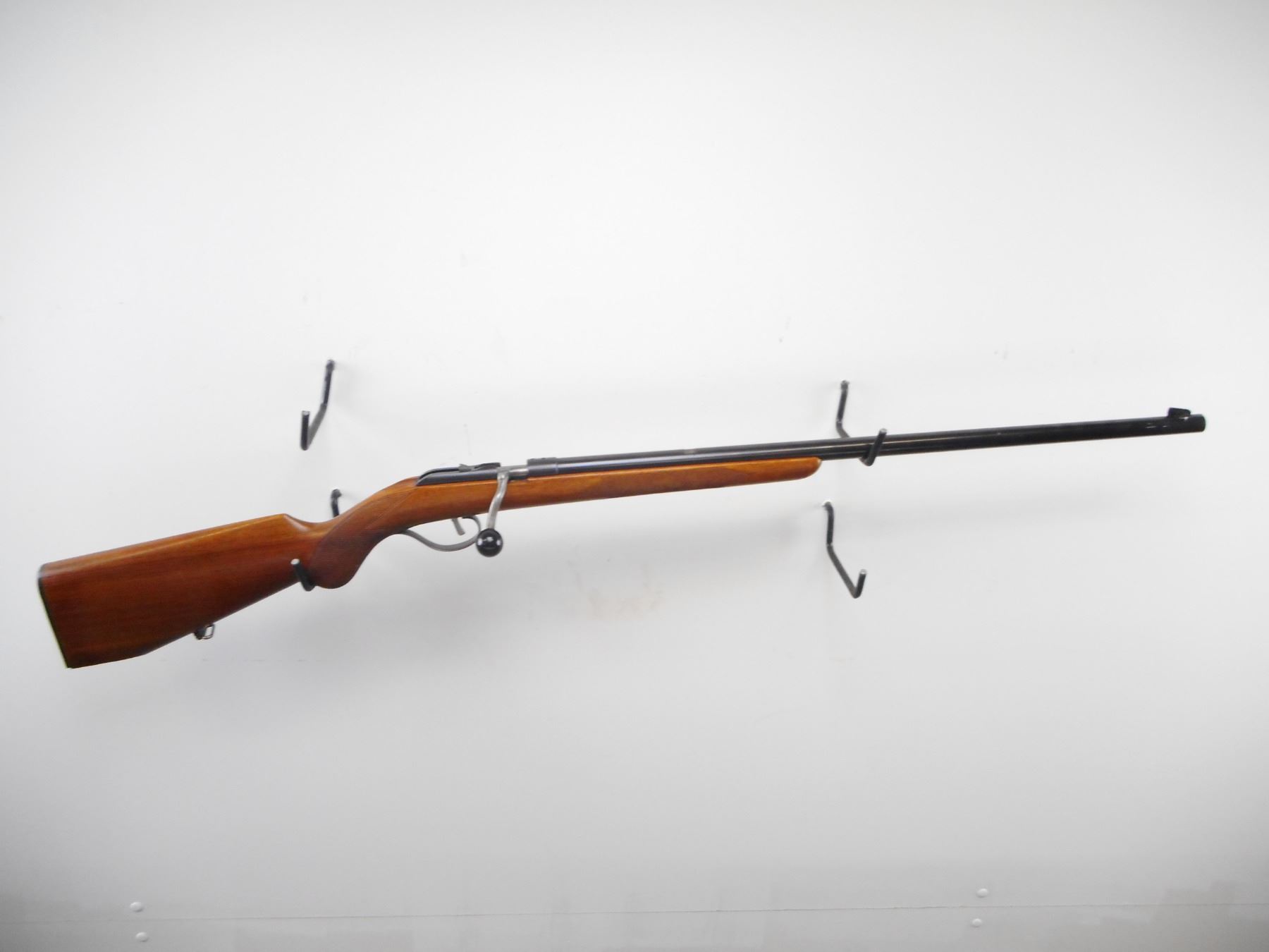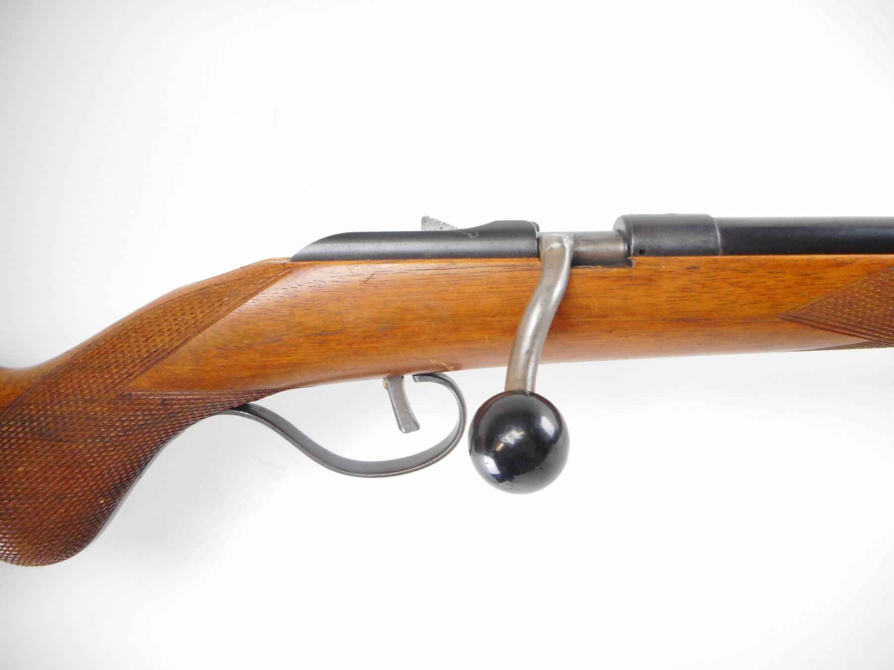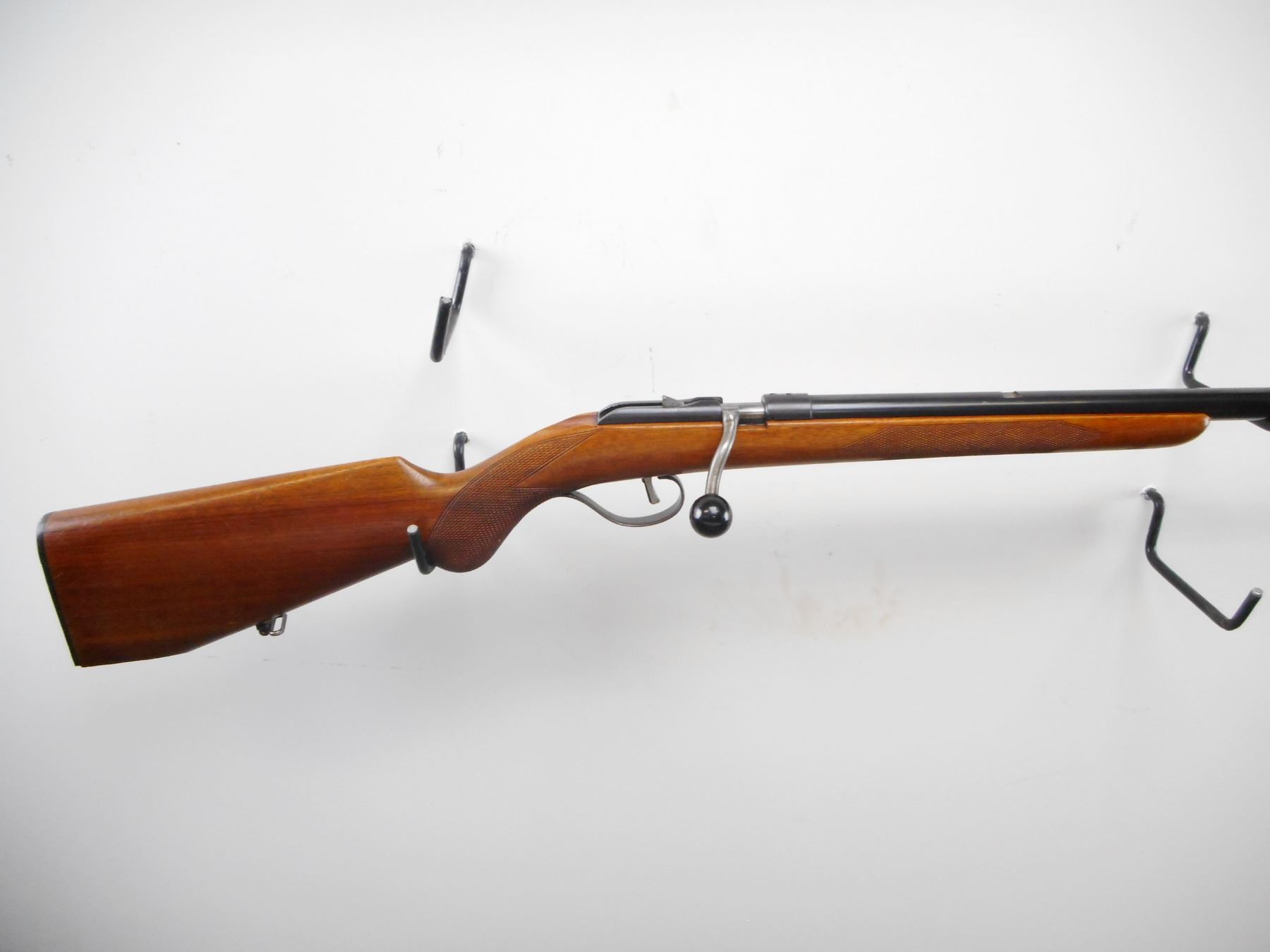 HUSQVARNA , MODEL: SAK RAT , CALIBER: 22 LR , BORE IS VERY GOOD. BLADE FRONT SIGHT. REAR SIGHT REMOVED. RECEIVER DRILLED AND TAPPED WITH TWO HOLES. EXTENDED BOLT HANDLE WITH LARGE KNOB. ONE PIECE WOOD STOCK. CHECKERED FOREARM AND PISTOL GRIP. GROOVED BLACK POLYMER BUTT PLATE. CHIPPED AND BROKEN AT TOE. WOOD ALSO CHIPPED. REAR SWIVEL ONLY. TRIGGER MODIFIED. BLUEING SHOWS WEAR AND HANDLING MARKS. STOCK SHOWS DINGS AND HANDLING MARKS. , ACTION: BOLT ACTION RIFLE , BARREL LENGTH: 25" , SERIAL# 18997 , CONDITION:5/10 , CLASS: CANADIAN NON RESTRICTED CLASS
