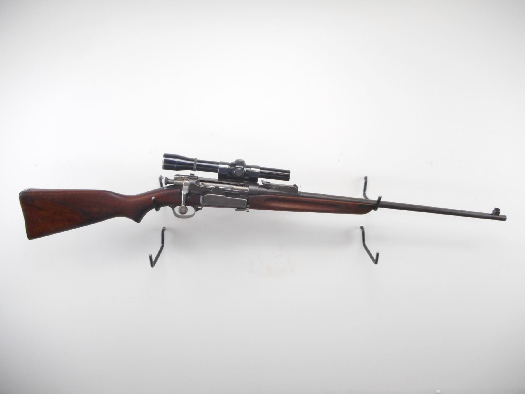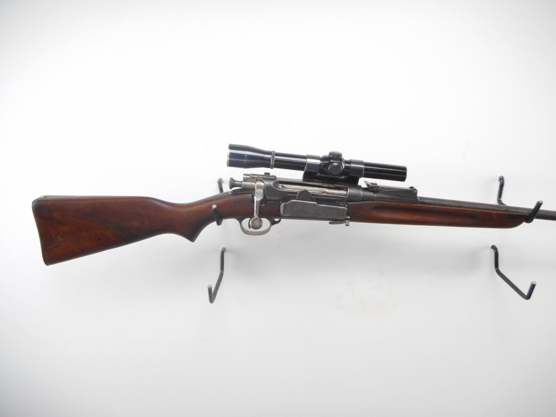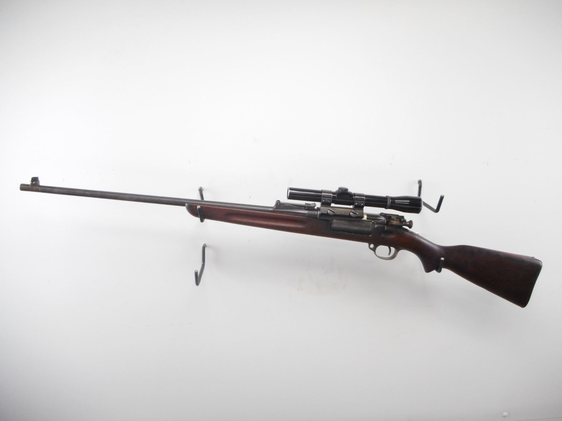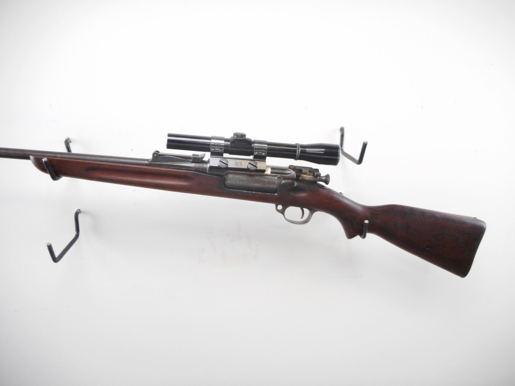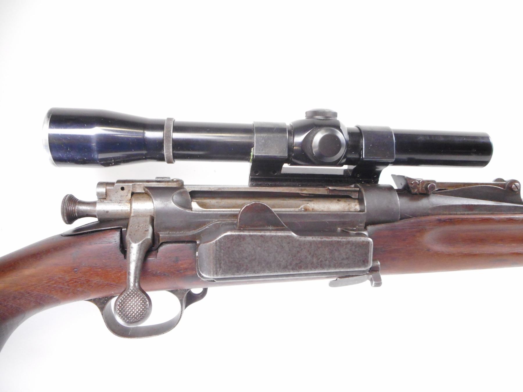NORWEGIAN , MODEL: KRAG CARBINE , CALIBER: 6.5 X 55 , BORE IS FAIR, WORN. BLADE FRONT SIGHT. ADJUSTABLE U NOTCH REAR SIGHT. LYMAN ALL AMERICAN 3X SCOPE. CLEAR OPTICS. FINE CROSS HAIR. SMOOTH ONE PIECE WOOD STOCK. STEEL BUTT PLATE. BLUEING SHOWS WEAR AND HANDLING MARKS. STOCK SHOWS WEAR AND HANDLING MARKS. , ACTION: BOLT ACTION RIFLE , BARREL LENGTH: 24" , SERIAL# 3965 , CONDITION:4/10 , CLASS: CANADIAN NON RESTRICTED CLASS