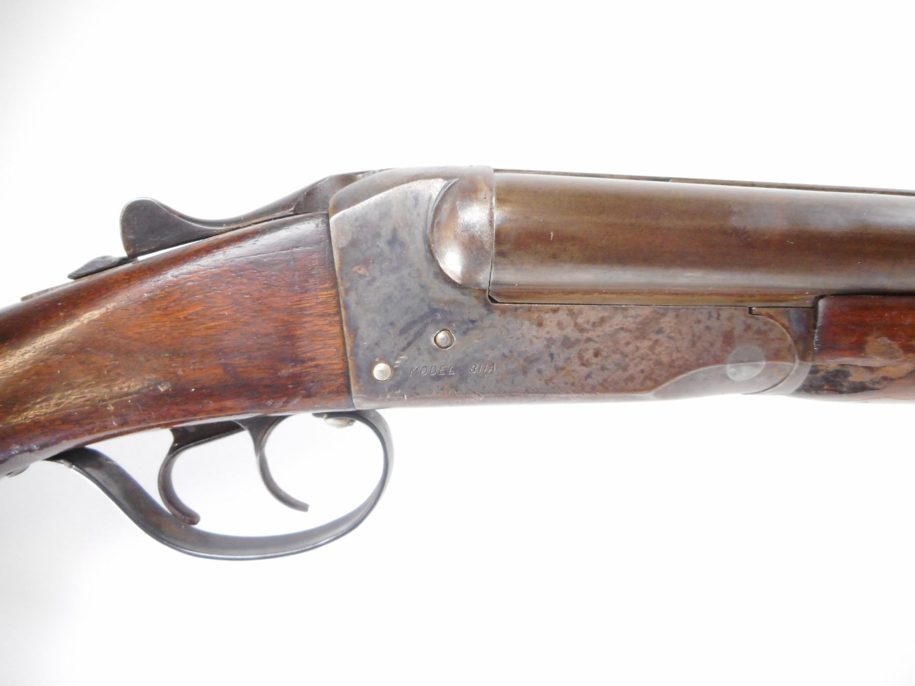 STEVENS , MODEL: 311A , CALIBER: 16GA X 2 3/4" , CYLINDER AND CYLINDER CHOKE. BORE IS VERY GOOD. BRASS BEAD. RAISED RIB. SAFETY BROKEN/NOT WORKING. EXTRACTOR. DOUBLE TRIGGERS. TWO PIECE SMOOTH WOOD STOCKS. GROOVED BLACK POLYMER BUTT PLATE. STOCK CRACKED AND REPAIRED AT WRIST. METAL SHOWS WEAR, LIGHT RUST SPOTS, HANDLING MARKS. STOCK SHOWS CHIPS, DINGS, HANDLING MARKS. , ACTION: HINGE SXS SHOTGUN , BARREL LENGTH: 23" , SERIAL# N/A , CONDITION:4/10 , CLASS: CANADIAN NON RESTRICTED CLASS