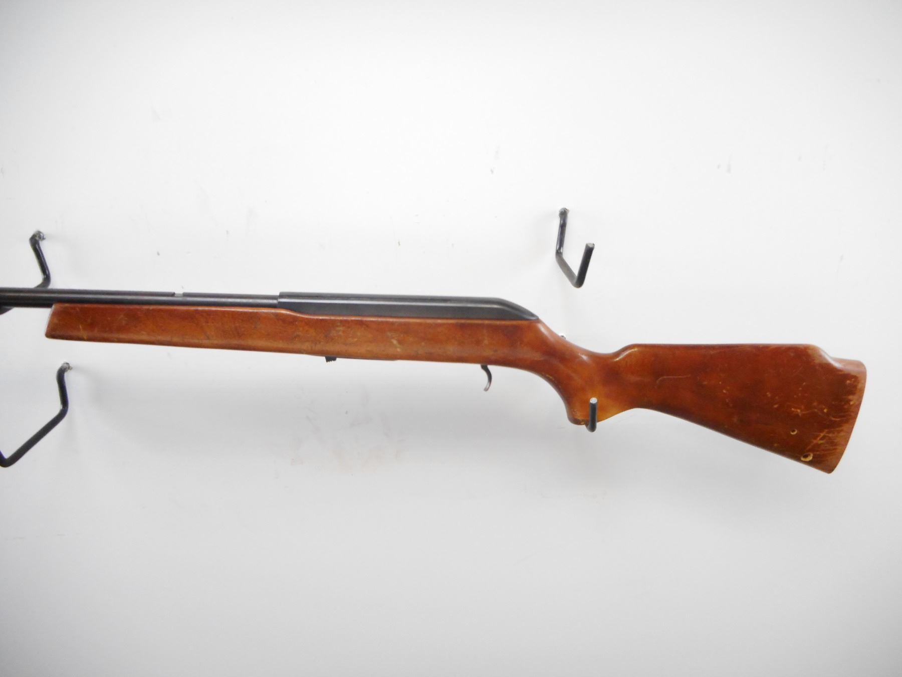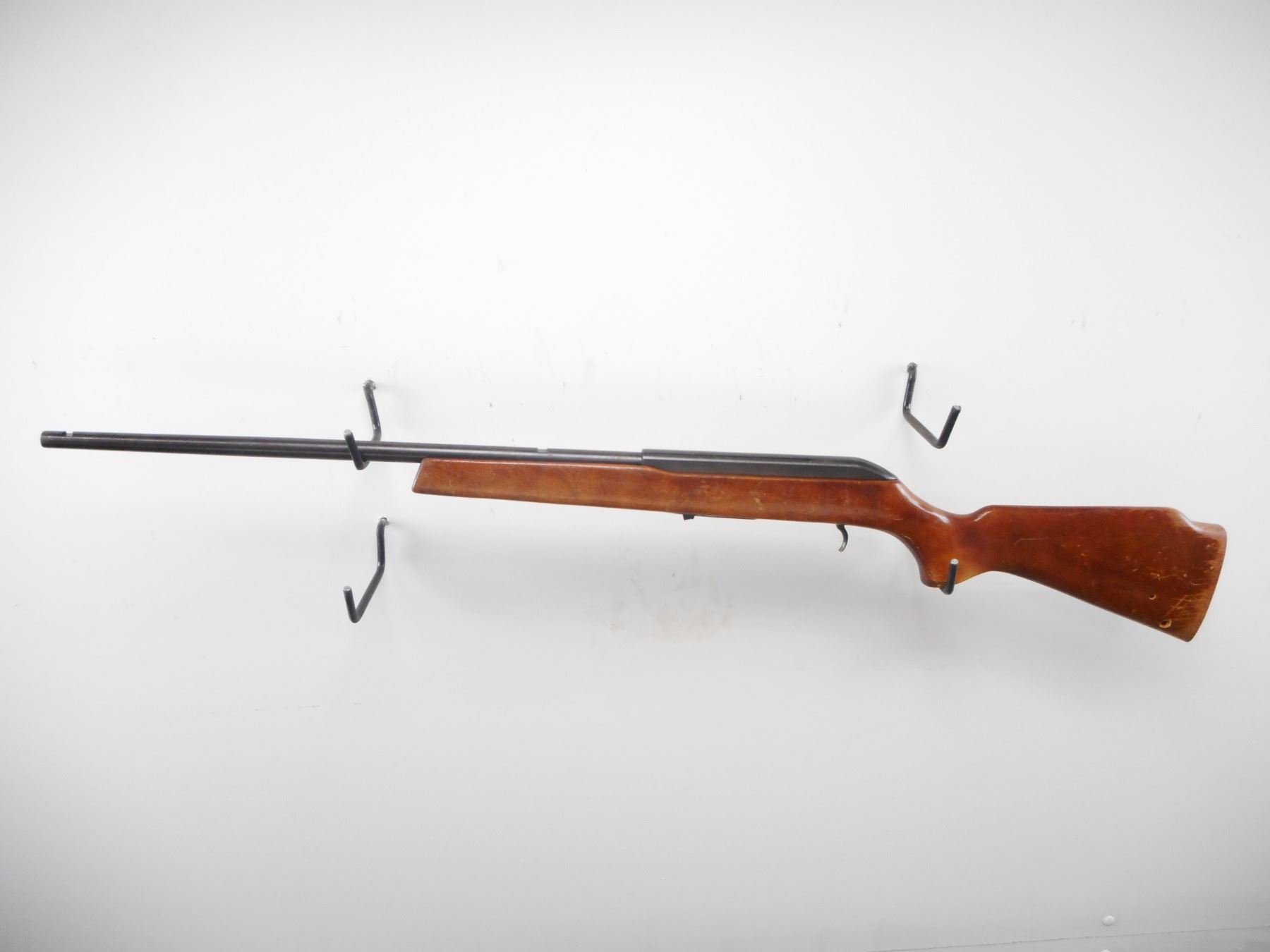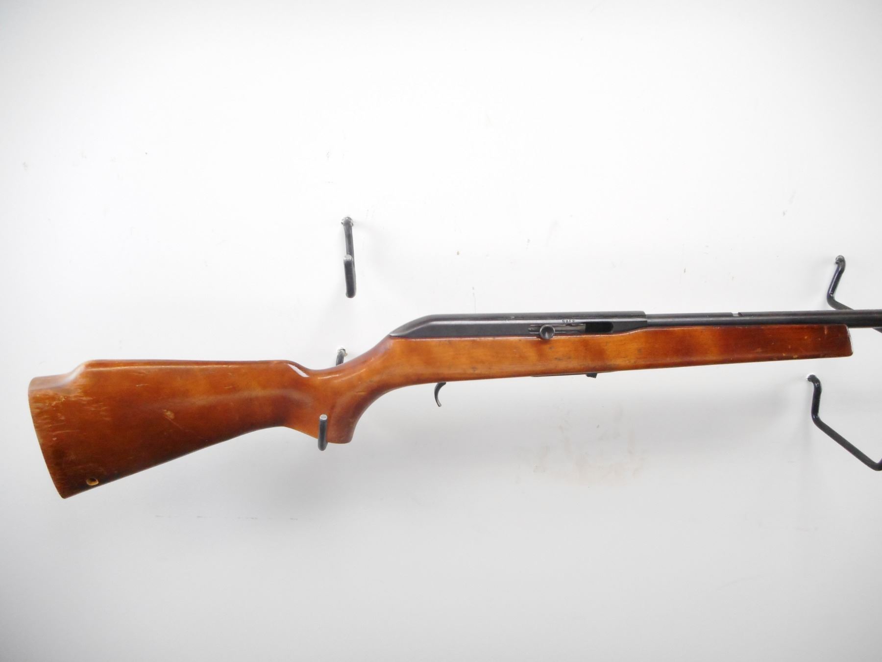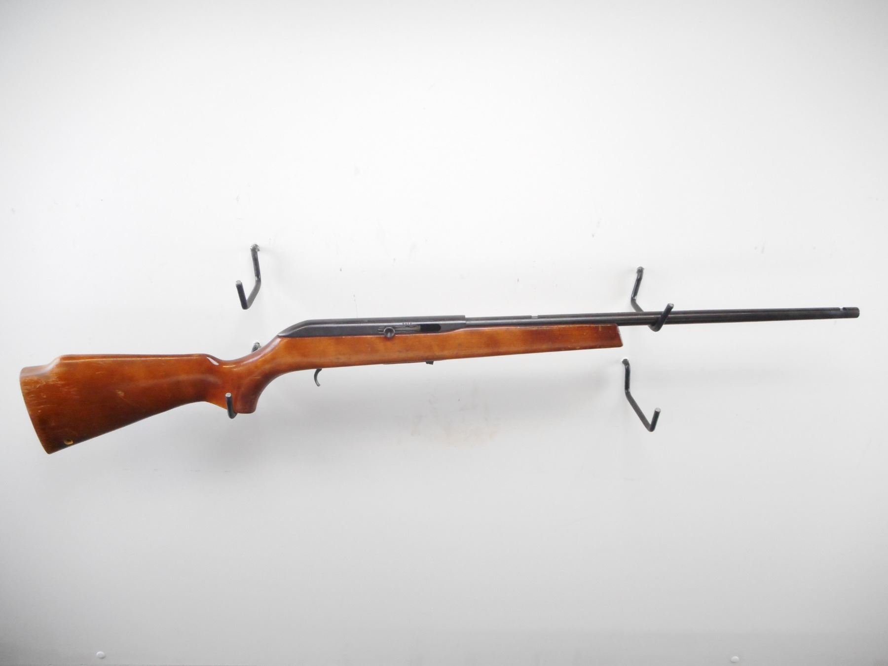 COOEY , MODEL: 64A , CALIBER: 22 LR , DOES NOT COME WITH MAGAZINE. BORE IS VERY GOOD. SIGHTS REMOVED. GROOVED RECEIVER. ONE PIECE SMOOTH WOOD STOCK, WITH SEVERAL HOLES. MISSING BUTT PLATE AND TRIGGER GUARD. BLUEING SHOWS WEAR AND HANDLING MARKS. STOCK SHOWS WEAR AND FINISH HANDLING MARKS. , ACTION: SEMI AUTO RIFLE , BARREL LENGTH: 21 1/2" , SERIAL# N/A , CONDITION:4/10 , CLASS: CANADIAN NON RESTRICTED CLASS