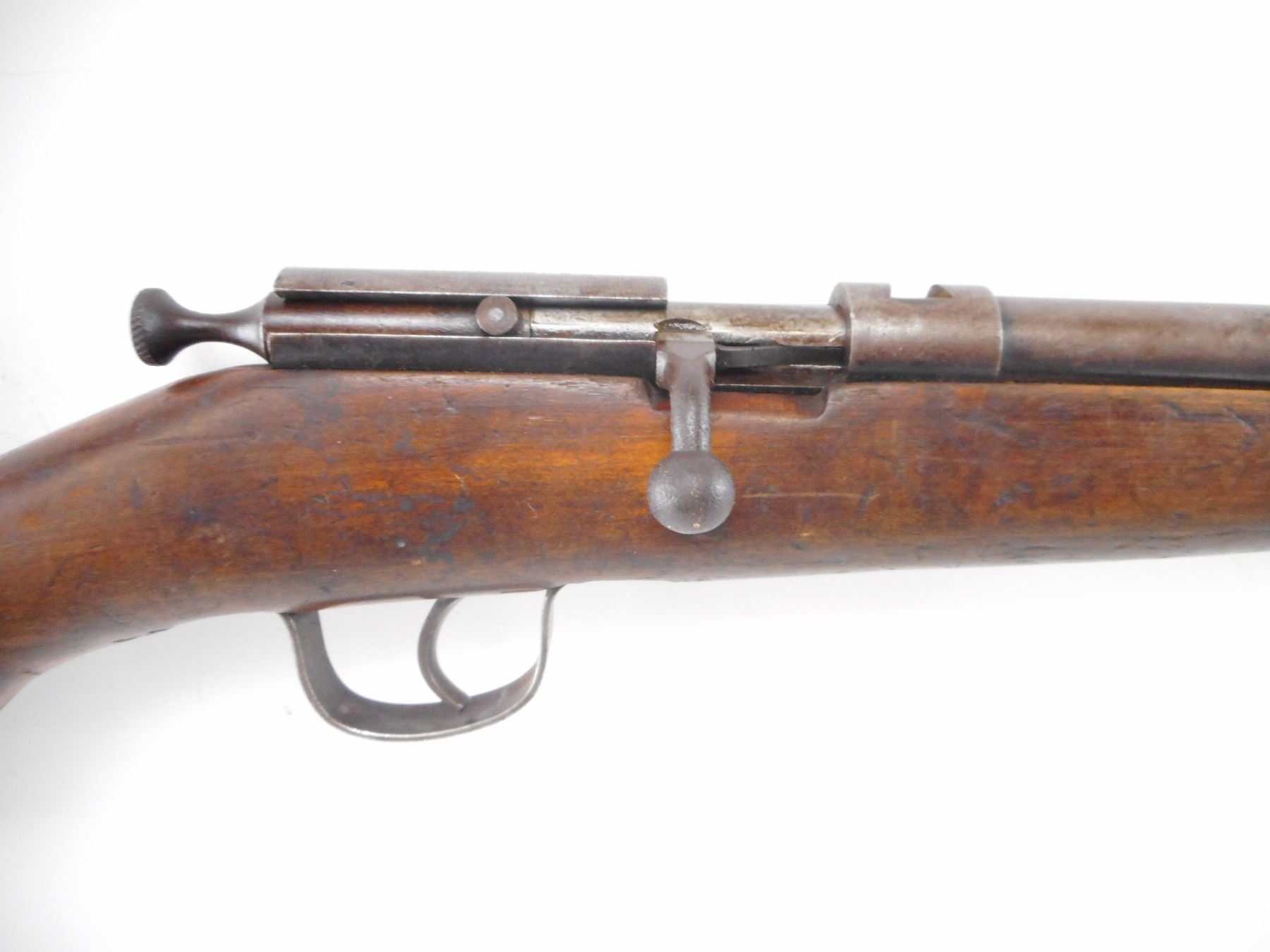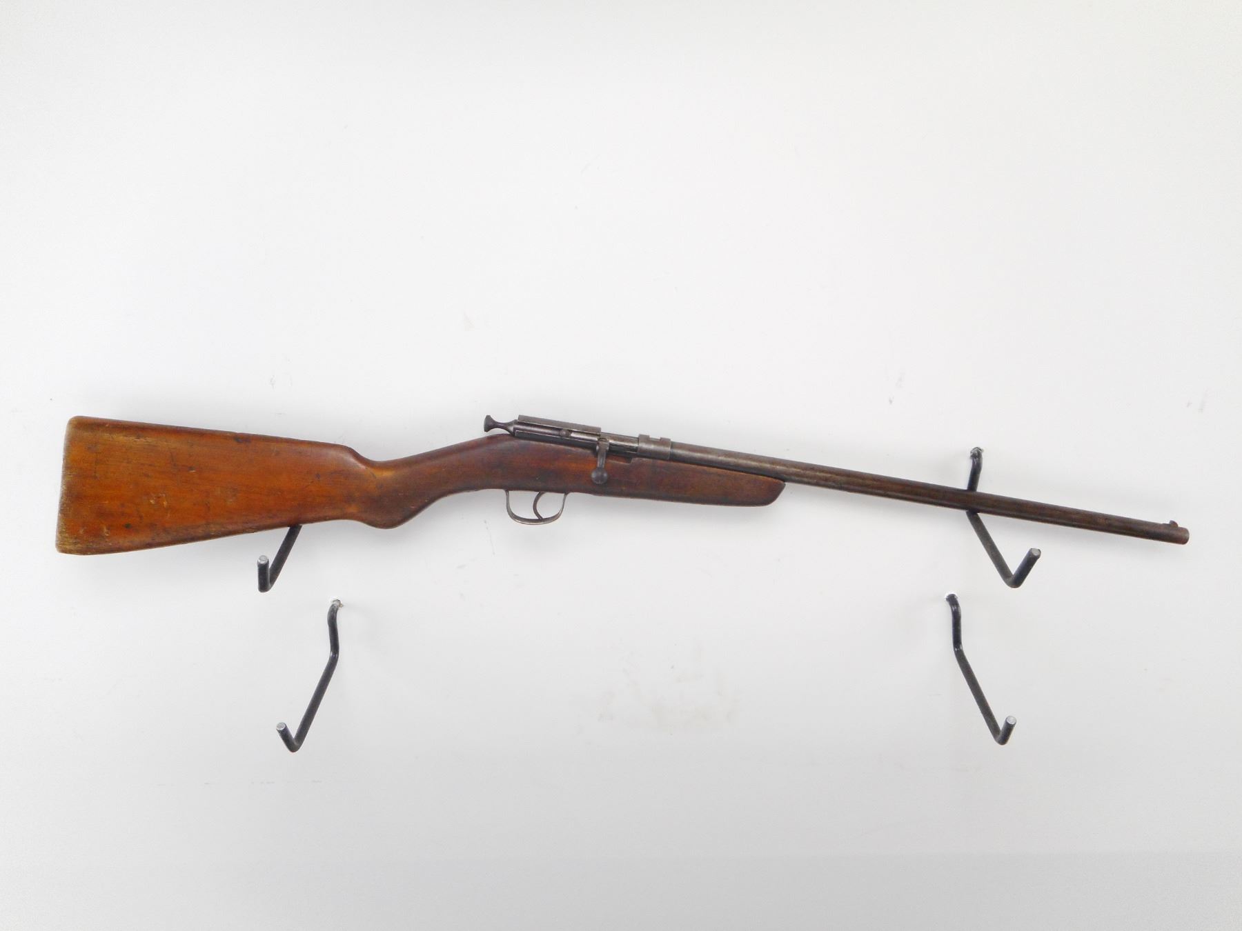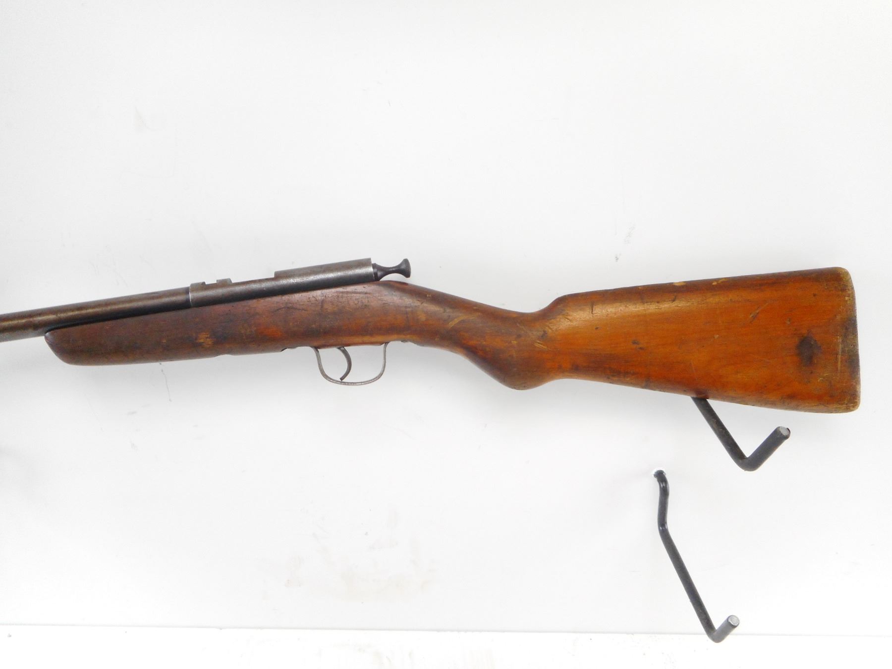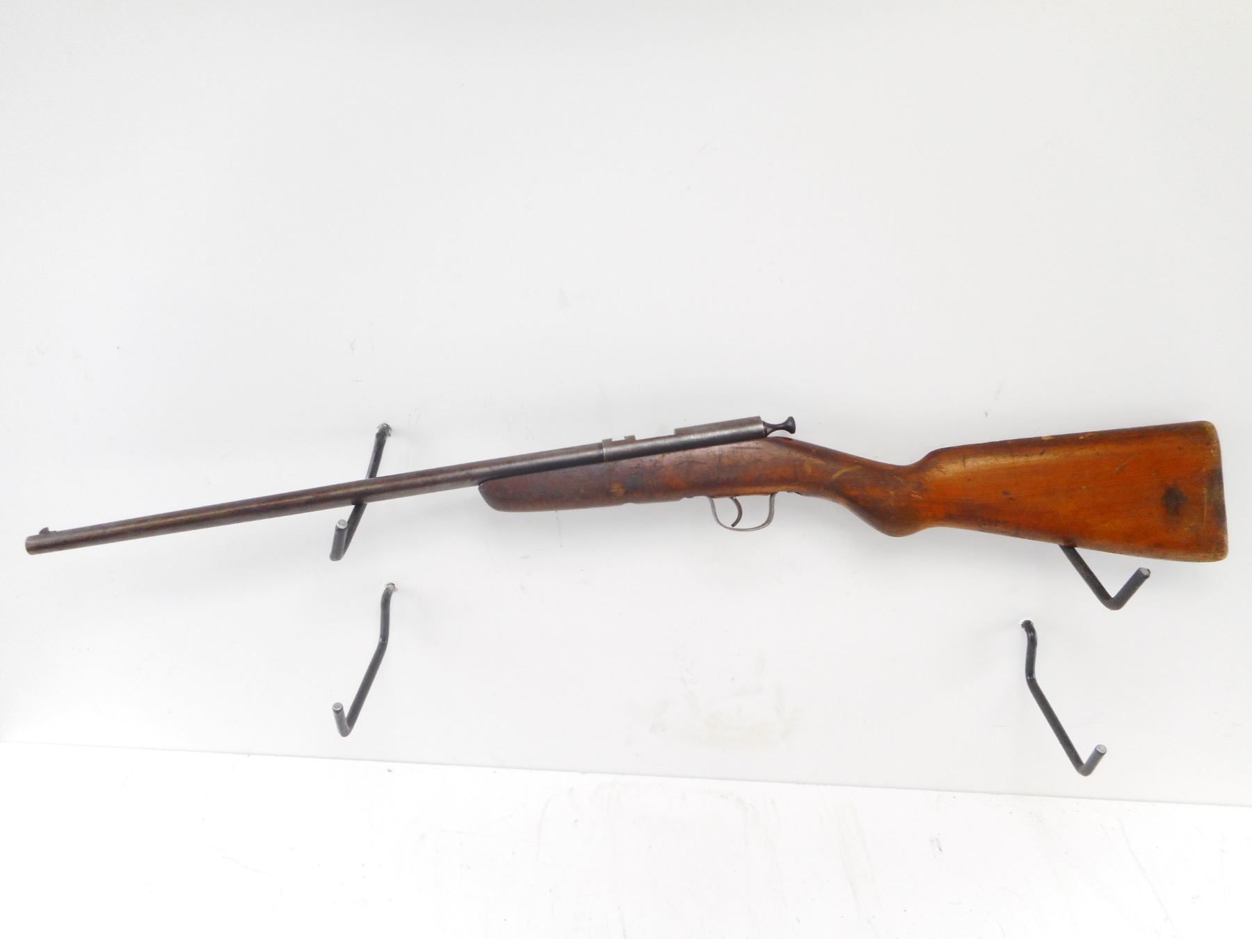 COOEY , MODEL: SPORT , CALIBER: 22 LR , BORE IS FAIR. BLADE FRONT SIGHT. REAR SIGHT REMOVED. SMALL BOLT KNOB. SMOOTH ONE PIECE WOOD STOCK. SMOOTH BUTT. STEEL TRIGGER GUARD. BLUEING SHOWS FADING LIGHT RUST SPECKLES AND WEAR. STOCK SHOWS NUMEROUS HANDLING MARKS AND DINGS. , ACTION: BOLT ACTION RIFLE , BARREL LENGTH: 17" , SERIAL# N/A , CONDITION:4/10 , CLASS: CANADIAN NON RESTRICTED CLASS
