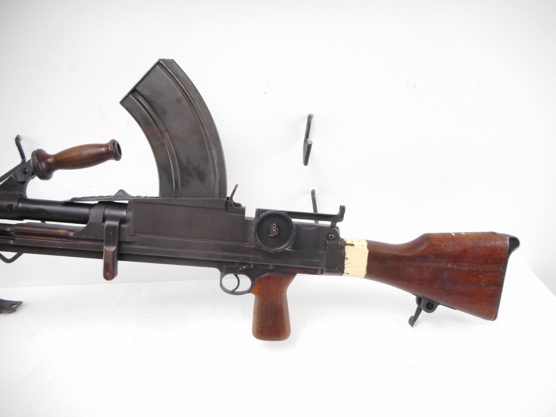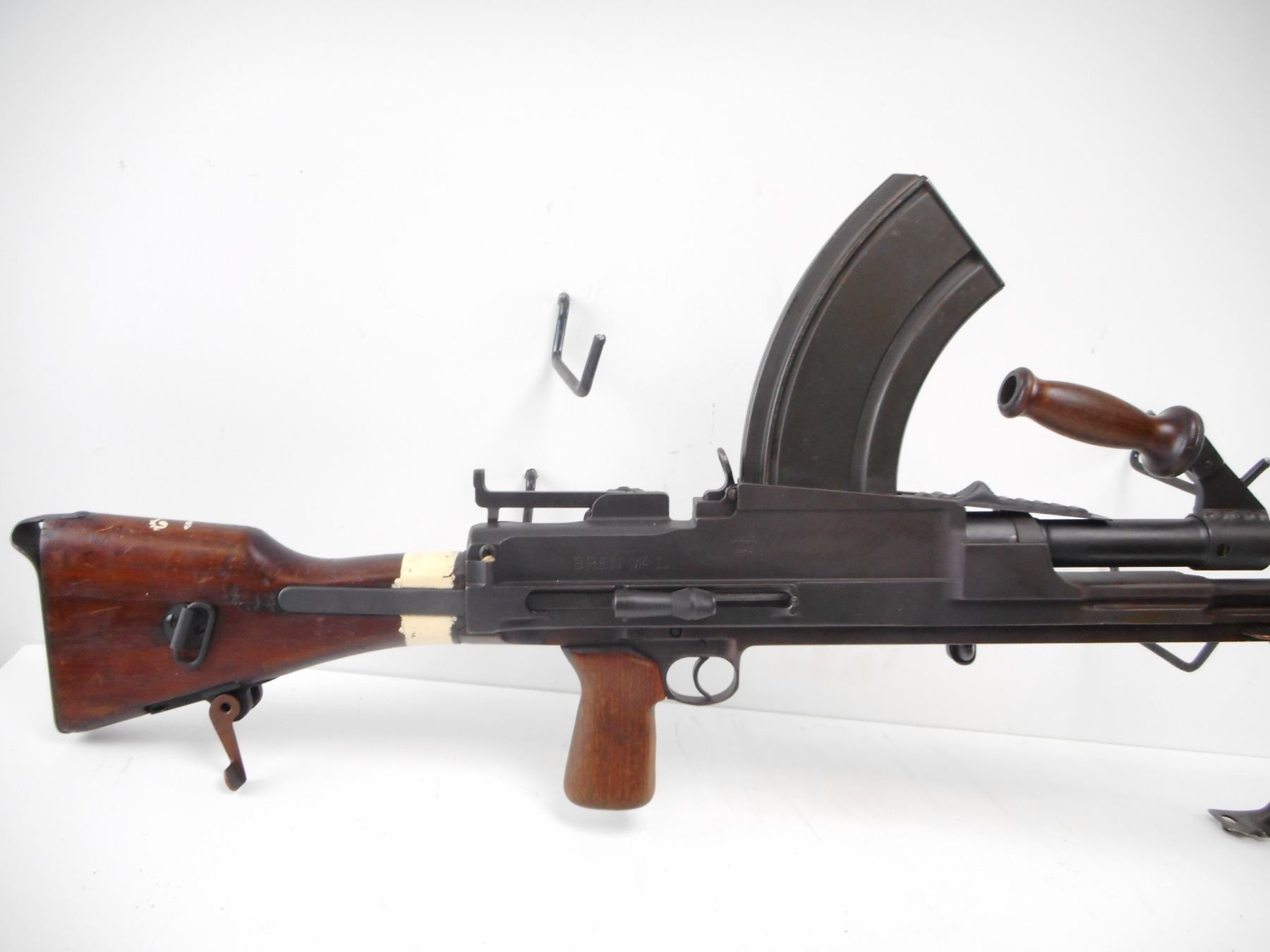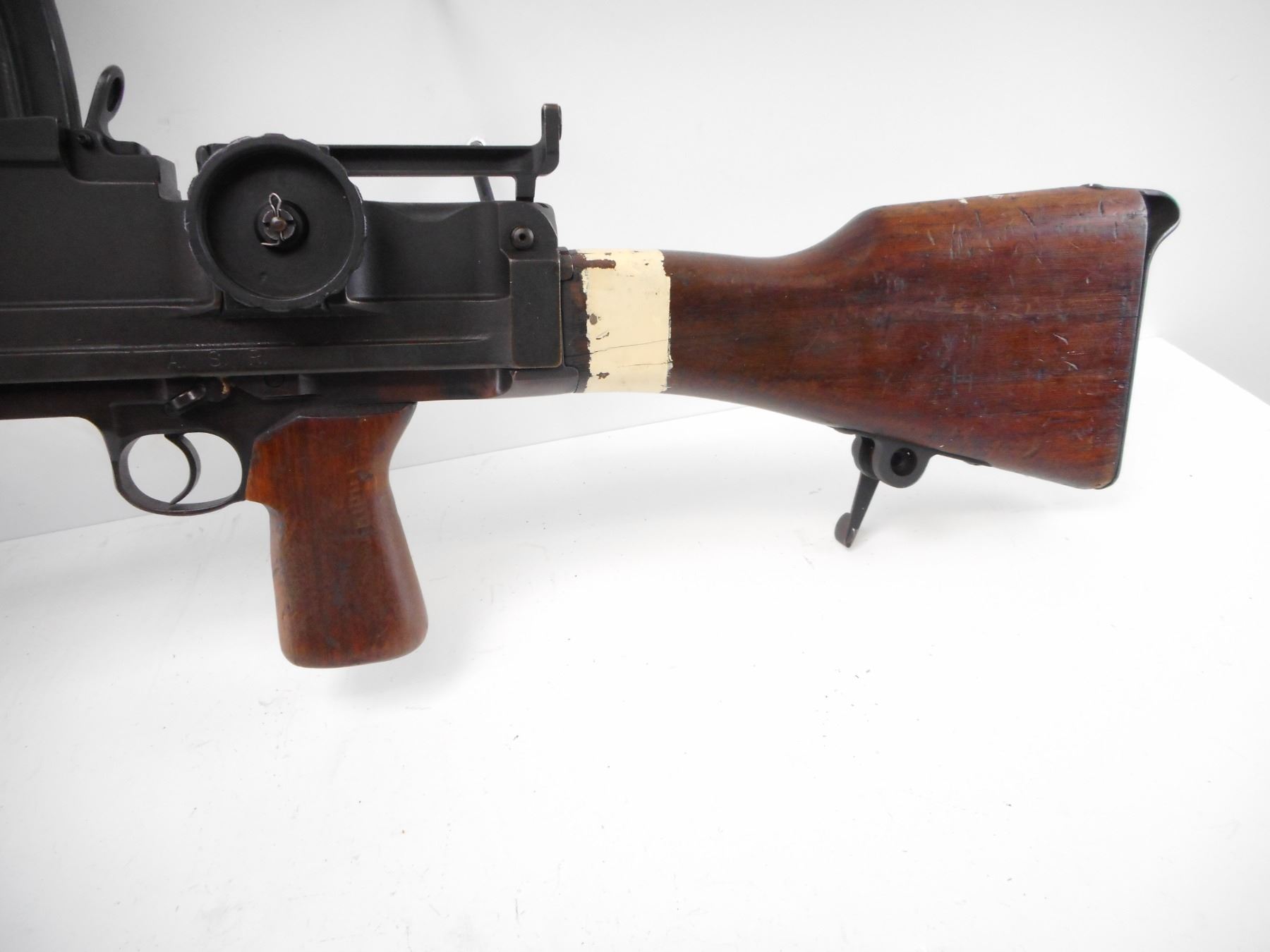 INGLIS , MODEL: MKI M , CALIBER: 303 BR , DEACTIVATED. BLADE FRONT SIGHT WITH EARS. LEFT SIDE DIAL PEEP SIGHT. WOOD CARRYING HANDLE. MAG WELL DUST COVER. MATTE BLACK FINISH ON METAL PARTS. WOOD PISTOL GRIP AND BUTT STOCK. BLUED STEEL BUTT PLATE. BI-POD. FLASH HIDER. MIXTURE OF MKII AND MKI PARTS. SERIAL NUMBERS MISMATCHED. SHOWS NUMEROUS HANDLING MARKS AND WEAR , ACTION: DEACTIVATED , BARREL LENGTH: 23 1/2" , SERIAL# 1T5033 , CONDITION:7/10 ANTIQUE , CLASS: NO LICENSE REQUIRED TO PURCHASE