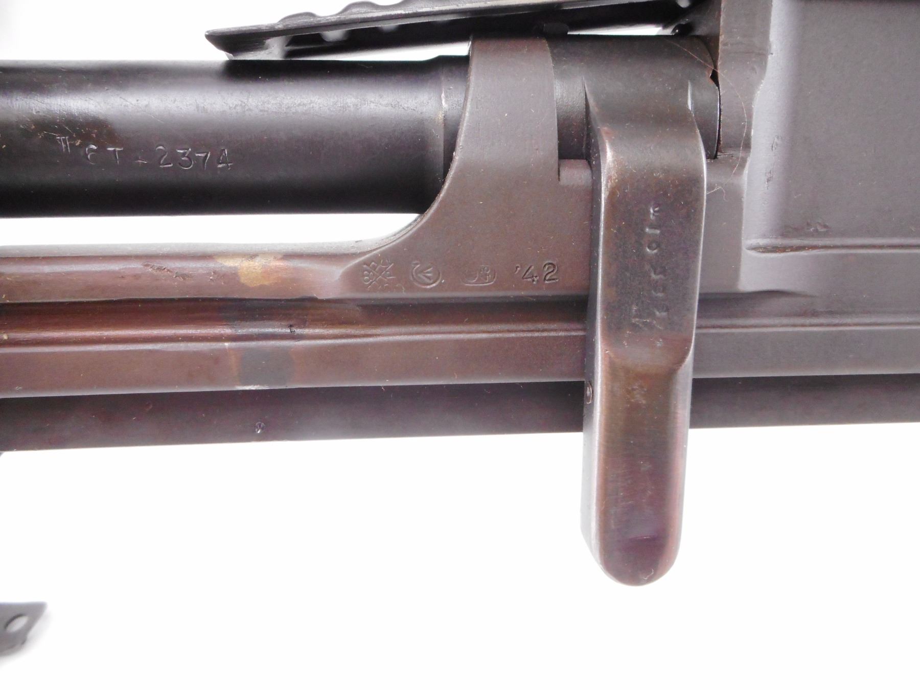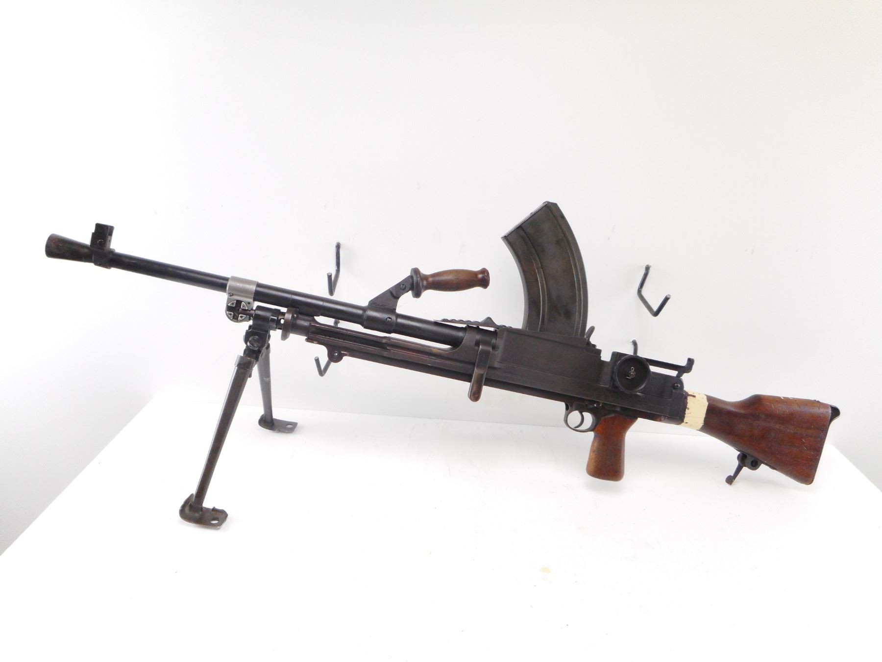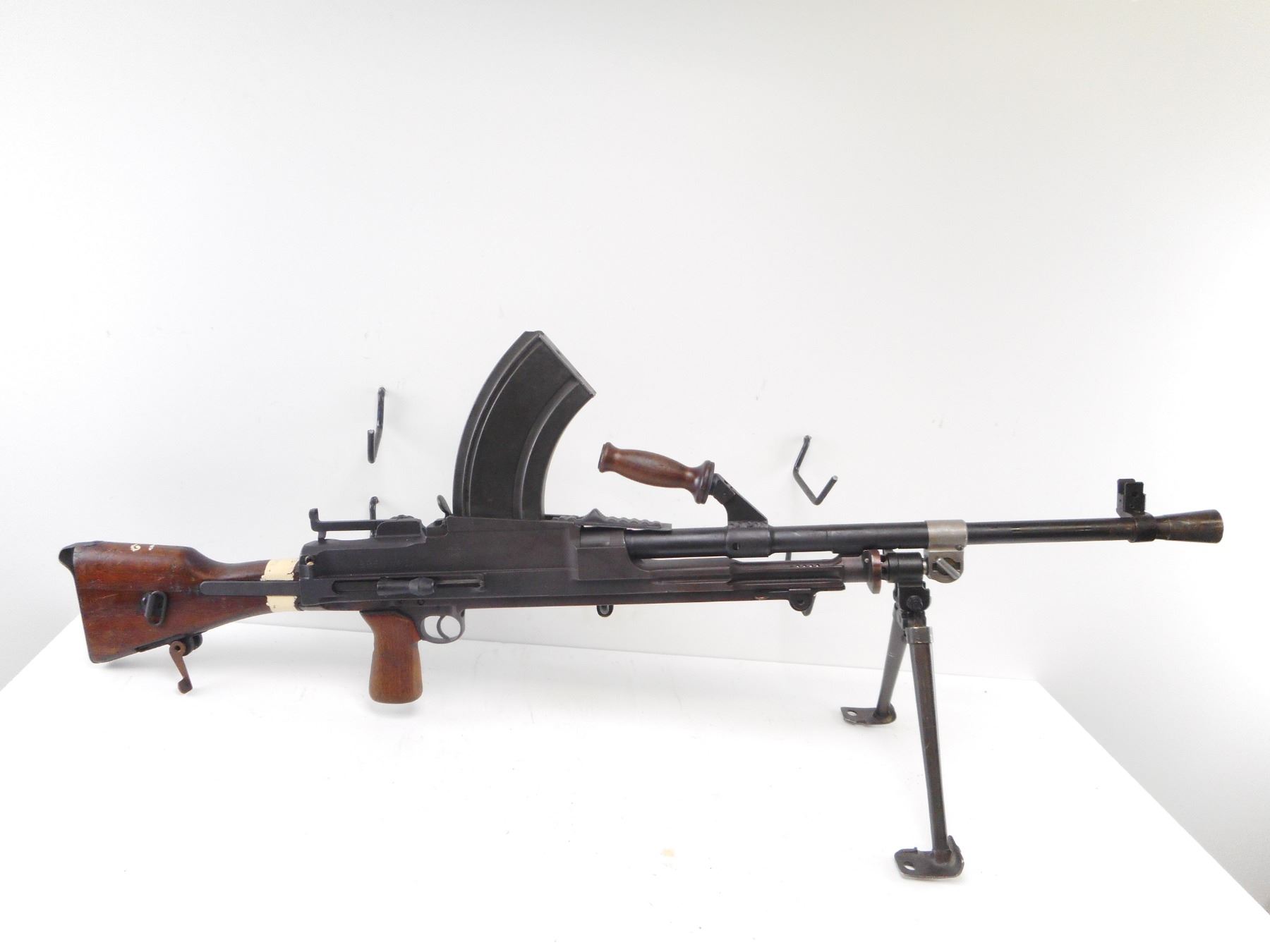 INGLIS , MODEL: MKI M , CALIBER: 303 BR , DEACTIVATED. BLADE FRONT SIGHT WITH EARS. LEFT SIDE DIAL PEEP SIGHT. WOOD CARRYING HANDLE. MAG WELL DUST COVER. MATTE BLACK FINISH ON METAL PARTS. WOOD PISTOL GRIP AND BUTT STOCK. BLUED STEEL BUTT PLATE. BI-POD. FLASH HIDER. MIXTURE OF MKII AND MKI PARTS. SERIAL NUMBERS MISMATCHED. SHOWS NUMEROUS HANDLING MARKS AND WEAR , ACTION: DEACTIVATED , BARREL LENGTH: 23 1/2" , SERIAL# 1T5033 , CONDITION:7/10 ANTIQUE , CLASS: NO LICENSE REQUIRED TO PURCHASE