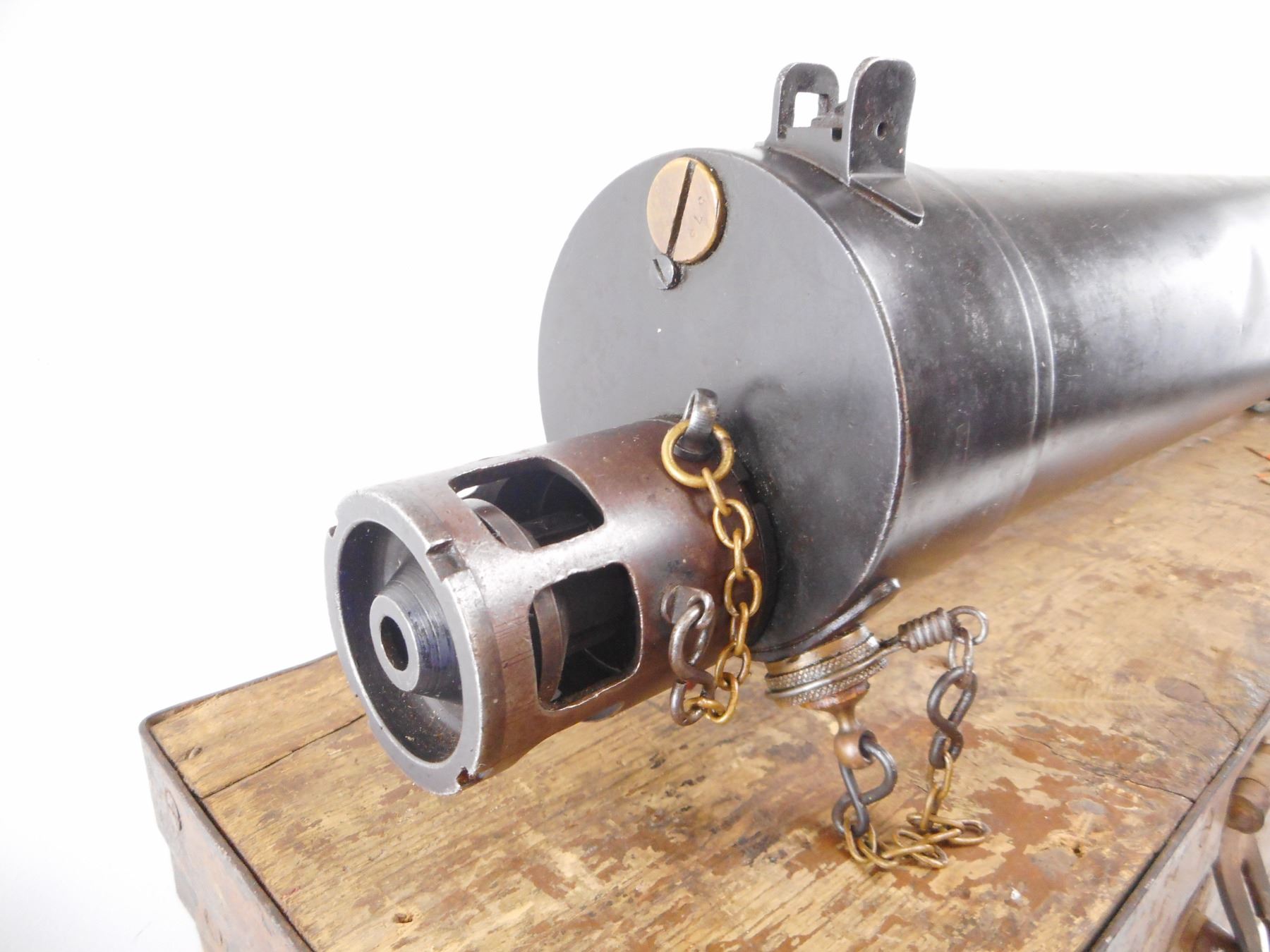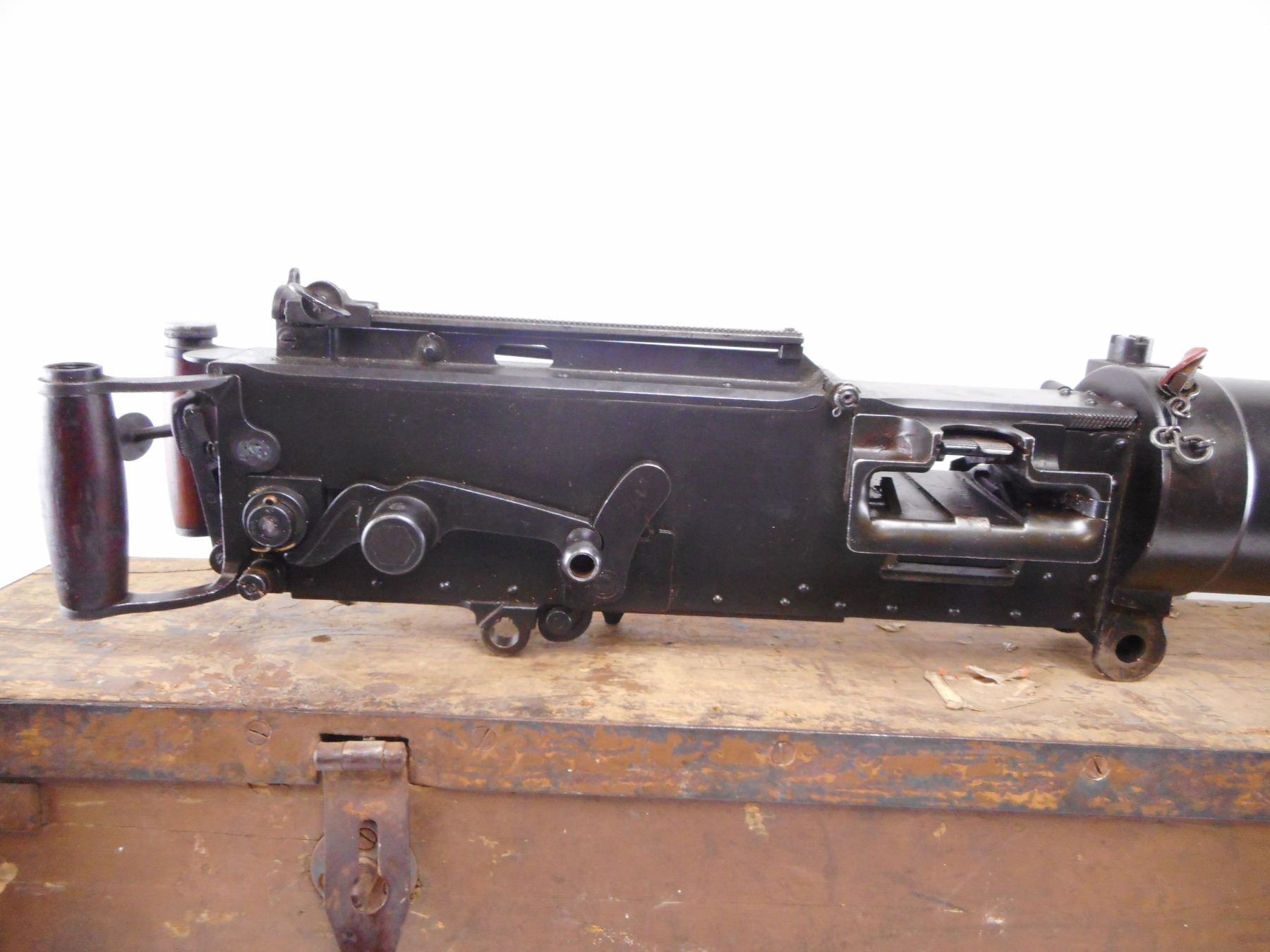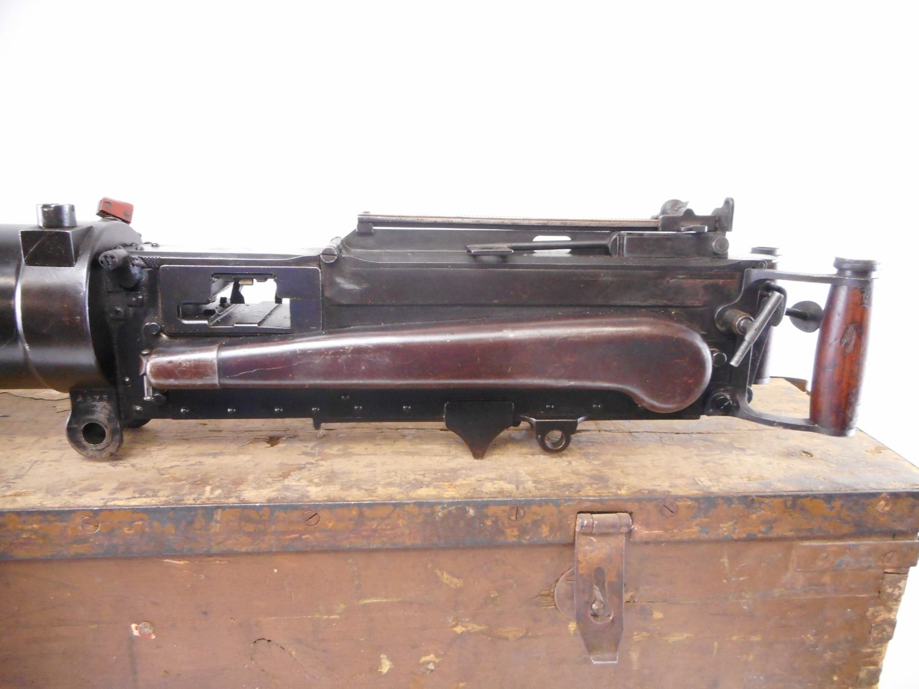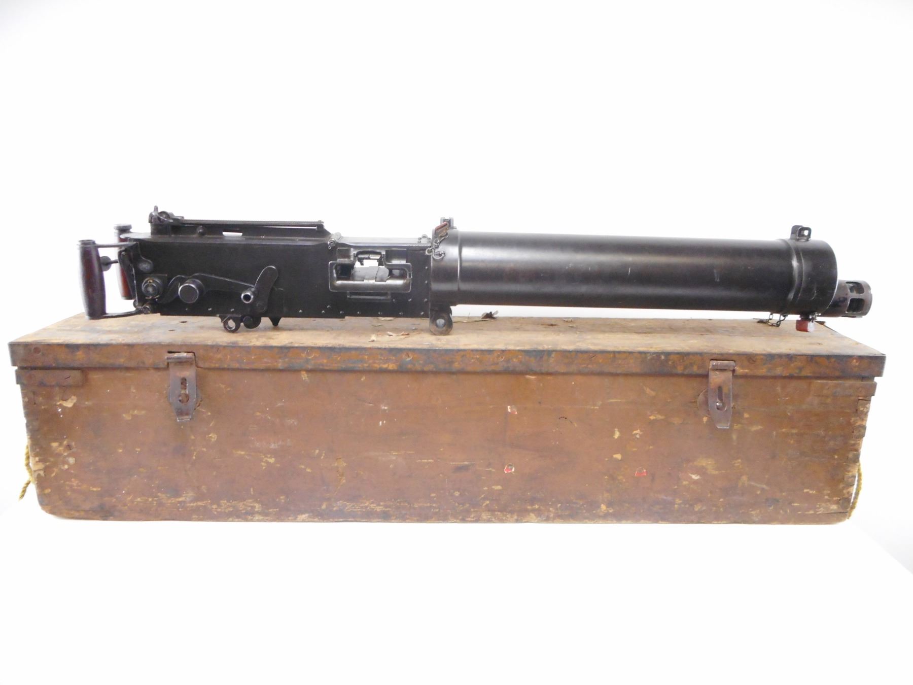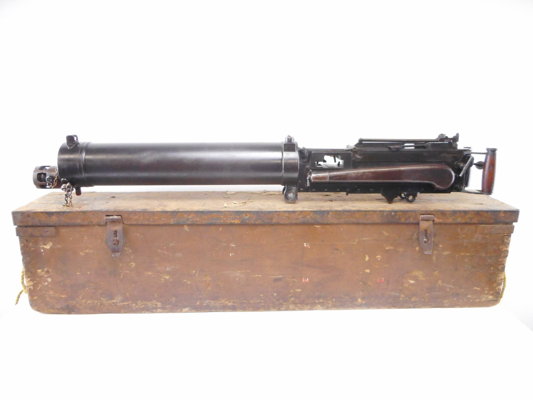 VICKERS , MODEL: MKI TURKISH , CALIBER: 8MM , COMES WITH WOOD TRANSIT CASE. BLADE FRONT SIGHT WITH EARS. ADJUSTABLE LADDER PEEP SIGHT. SMOOTH WATER JACKET. MODIFIED WITH TURKISH AA SIGHTS. WOOD SPADE GRIPS. MISSING ONE OIL CAP. FILLER PLUGS WITH CHAINS IN WATER JACKETS. FLAT NOSE CAP. METAL FINISH SHOWS NUMEROUS HANDLING MARKS AND WEAR , ACTION: DEACTIVATED , BARREL LENGTH: 24" , SERIAL# 573 , CONDITION:7/10 ANTIQUE , CLASS: NO LICENSE REQUIRED TO PURCHASE