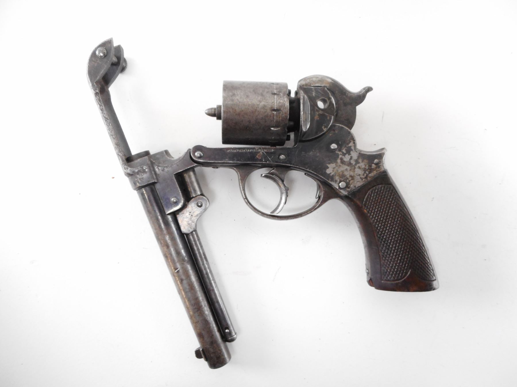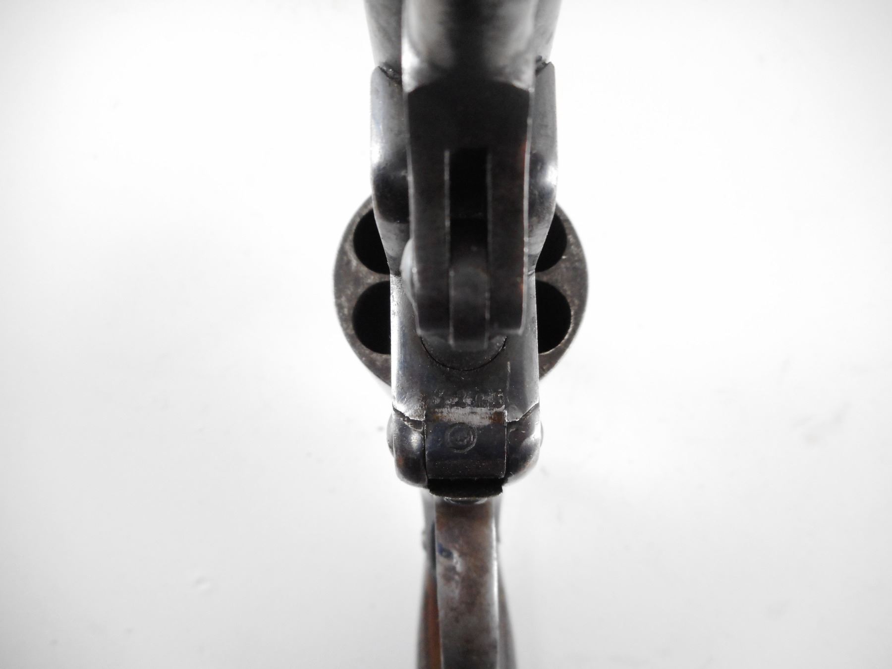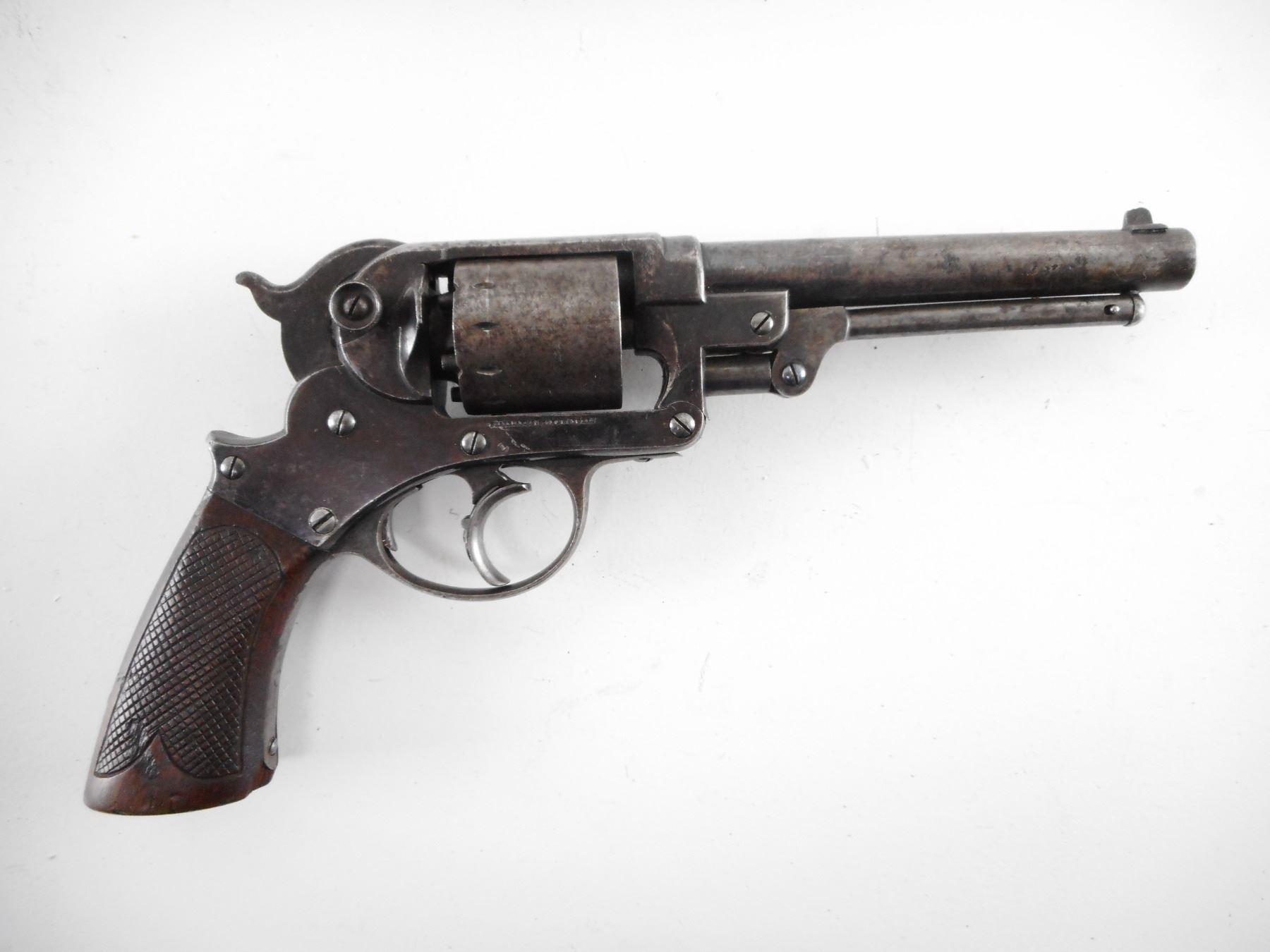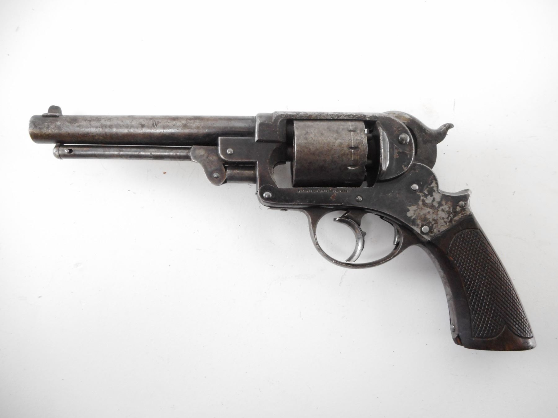 STARR , MODEL: 1858 DOUBLE ACTION ARMY , CALIBER: 44 CAL PERC , BORE IS GOOD WITH SOME LIGHT PITTING. BLADE FRONT SIGHT. NO REAR SIGHT. CHECKERED WOOD GRIPS. SHOWS EXTENSIVE PITTING ON ALL METAL PARTS. , ACTION: REVOLVER , BARREL LENGTH: 152MM , SERIAL# 1245 , CONDITION:5/10 ANTIQUE , CLASS: NO LICENSE REQUIRED TO PURCHASE