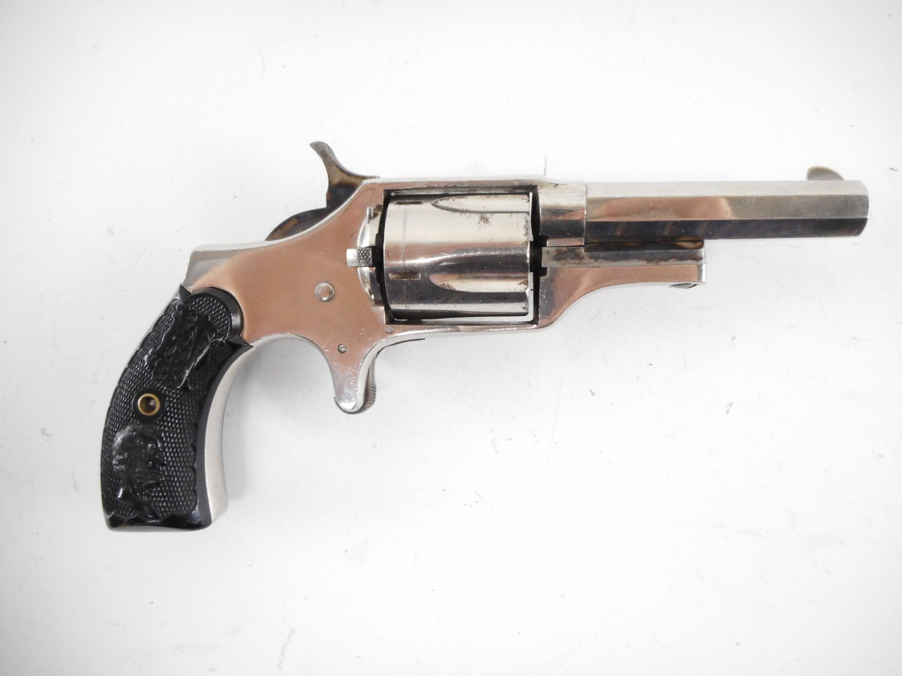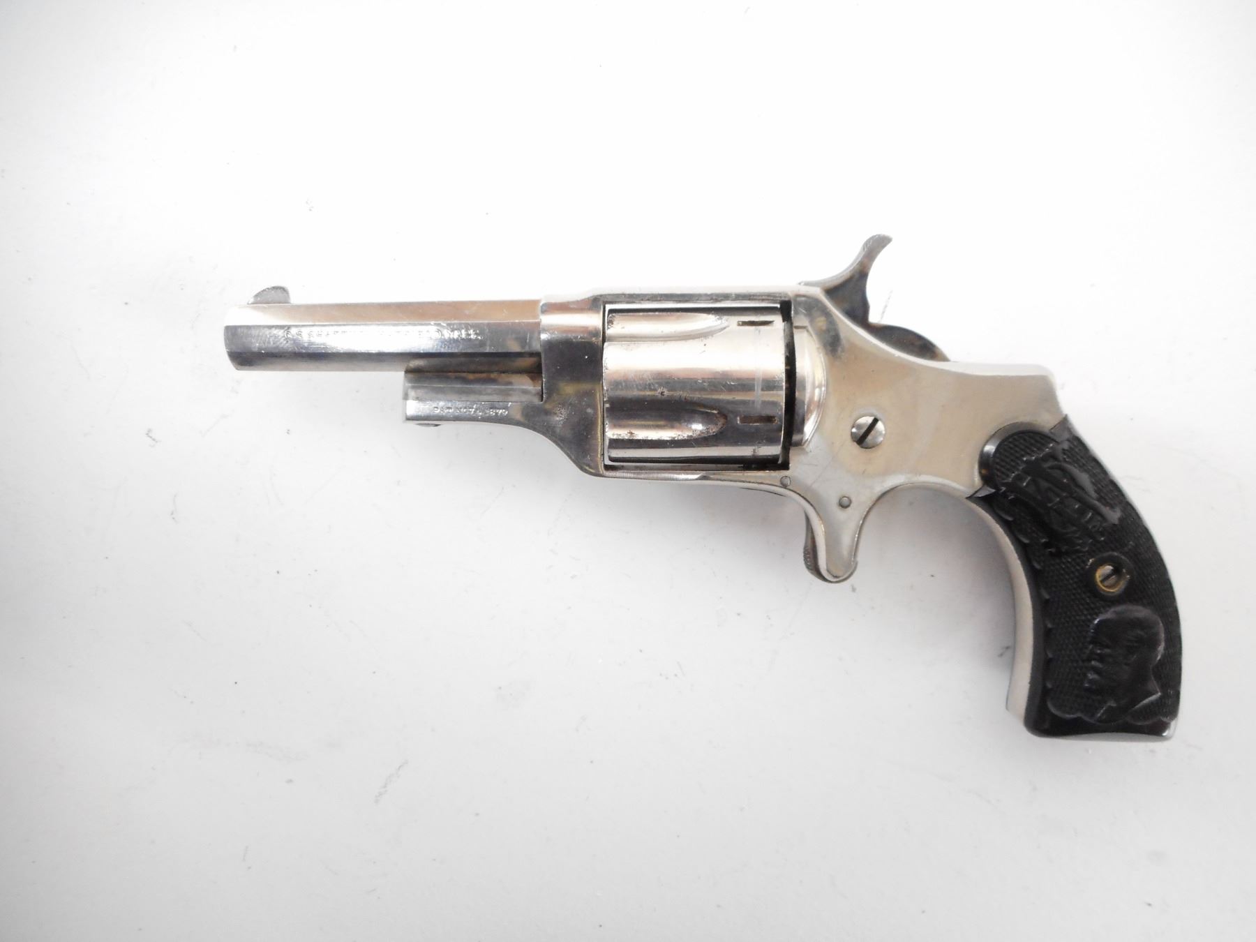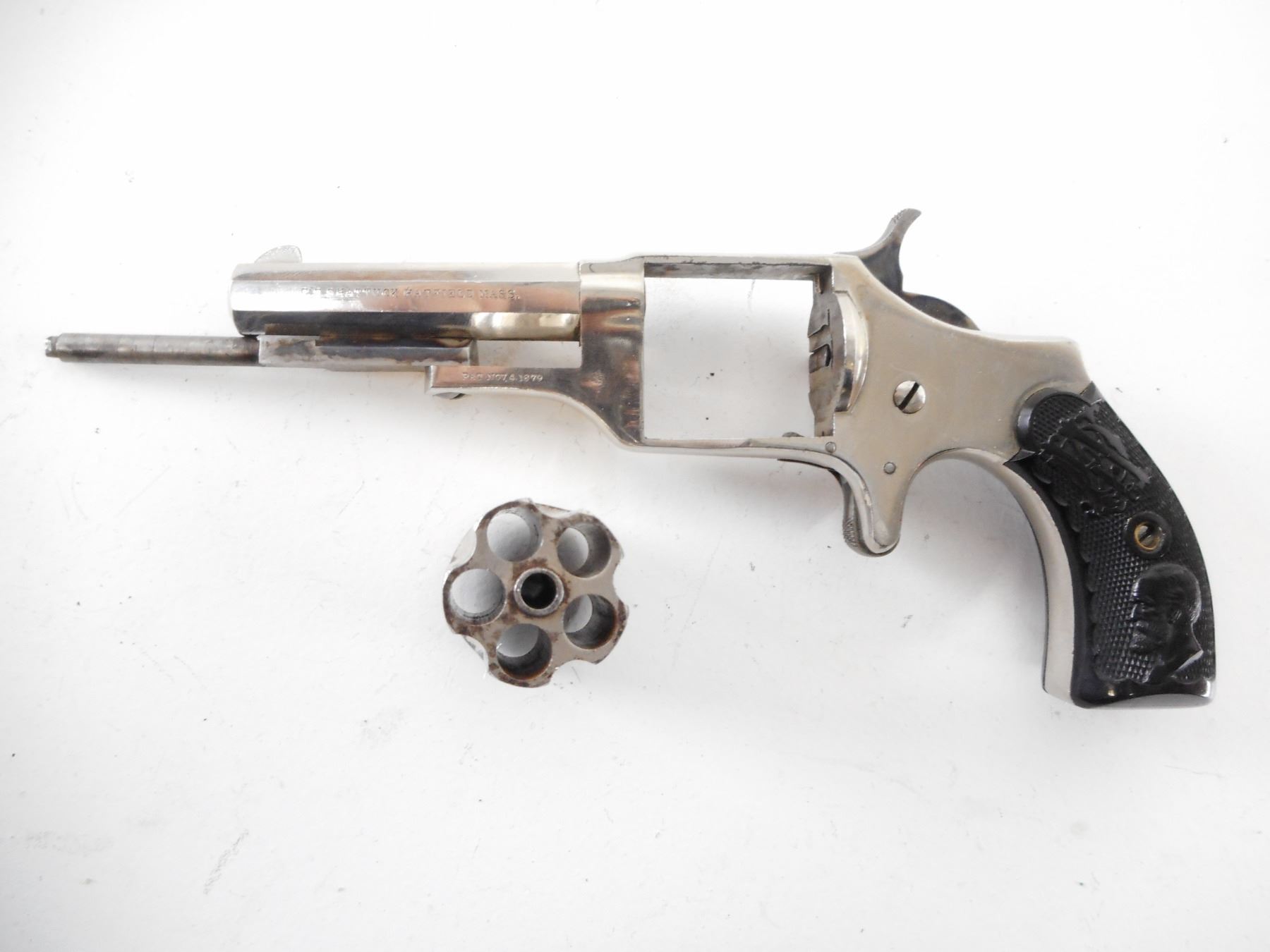 SHATTUCK , MODEL: 1879 HYDES PATENT , CALIBER: 32 RIM FIRE , BORE IS GOOD. BLADE FRONT AND NOTCHED REAR SIGHT. CHECKERED TWO PIECE BLACK PLASTIC GRIPS. UNIQUE SWING OUT CYLINDER DESIGN. SHOWS SOME HANDLING MARKS. , ACTION: REVOLVER , BARREL LENGTH: 66MM , SERIAL# N/A , CONDITION:7/10 ANTIQUE , CLASS: NO LICENSE REQUIRED TO PURCHASE