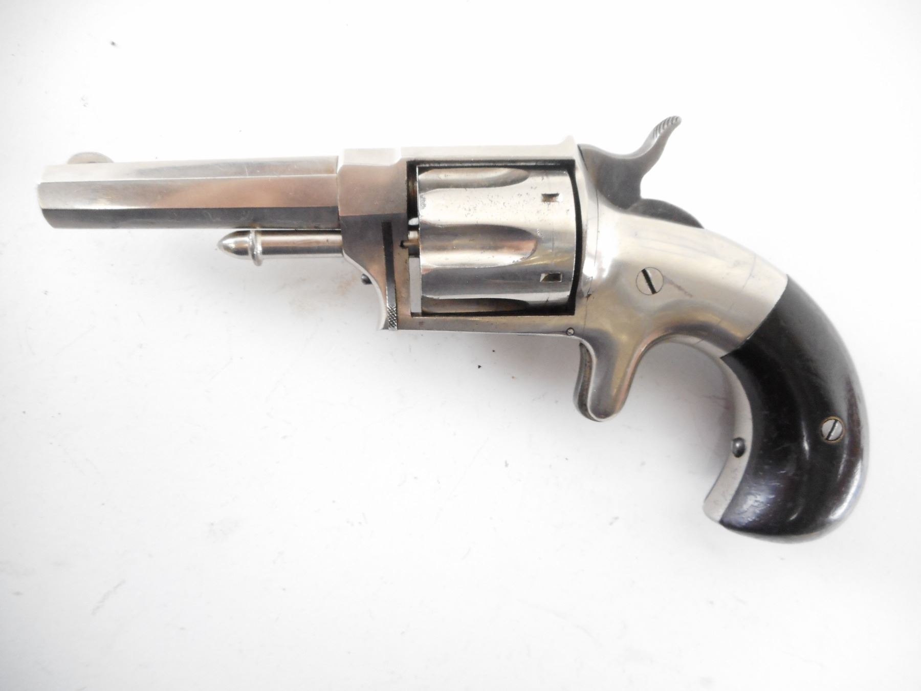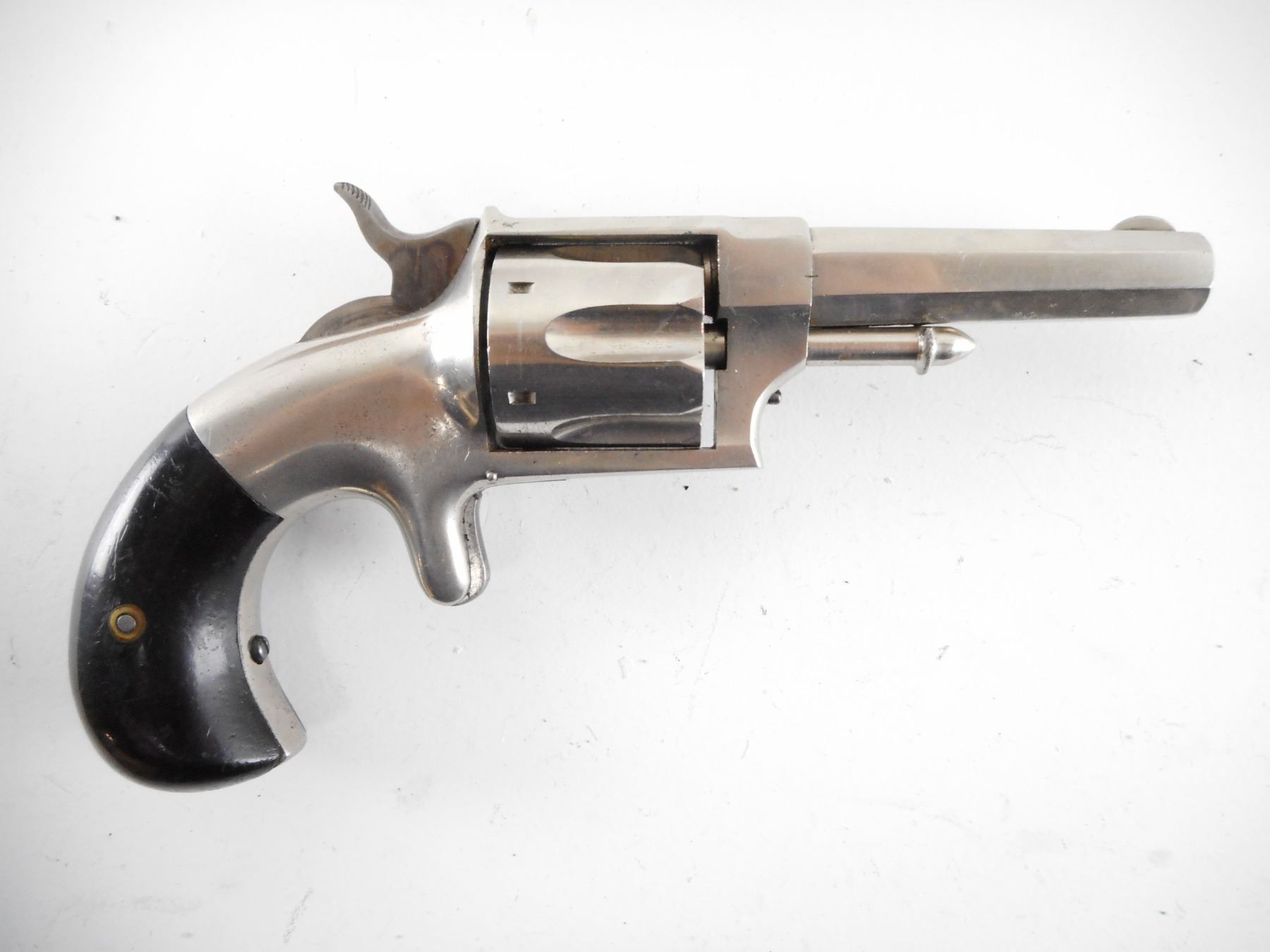 HOPKINS & ALLEN , MODEL: XL NO3 , CALIBER: 32 RIM FIRE , BORE IS GOOD WITH SOME LIGHT PITTING. BLADE FRONT SIGHT. RAISED NOTCH REAR SIGHT. TWO PIECE ROSEWOOD GRIPS. HOLDS COCK, SINGLE ACTION ONLY. SHOWS VERY LITTLE HANDLING MARKS. , ACTION: REVOLVER , BARREL LENGTH: 76MM , SERIAL# 885 , CONDITION:7/10 ANTIQUE , CLASS: NO LICENSE REQUIRED TO PURCHASE