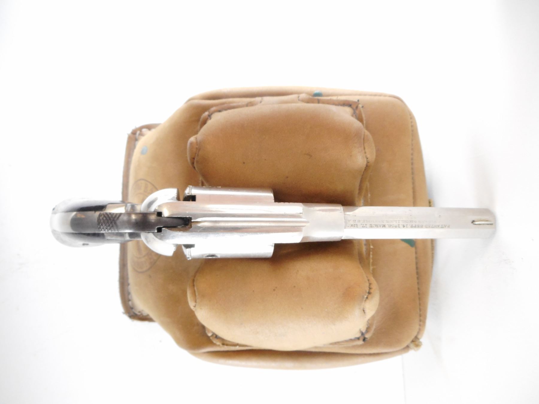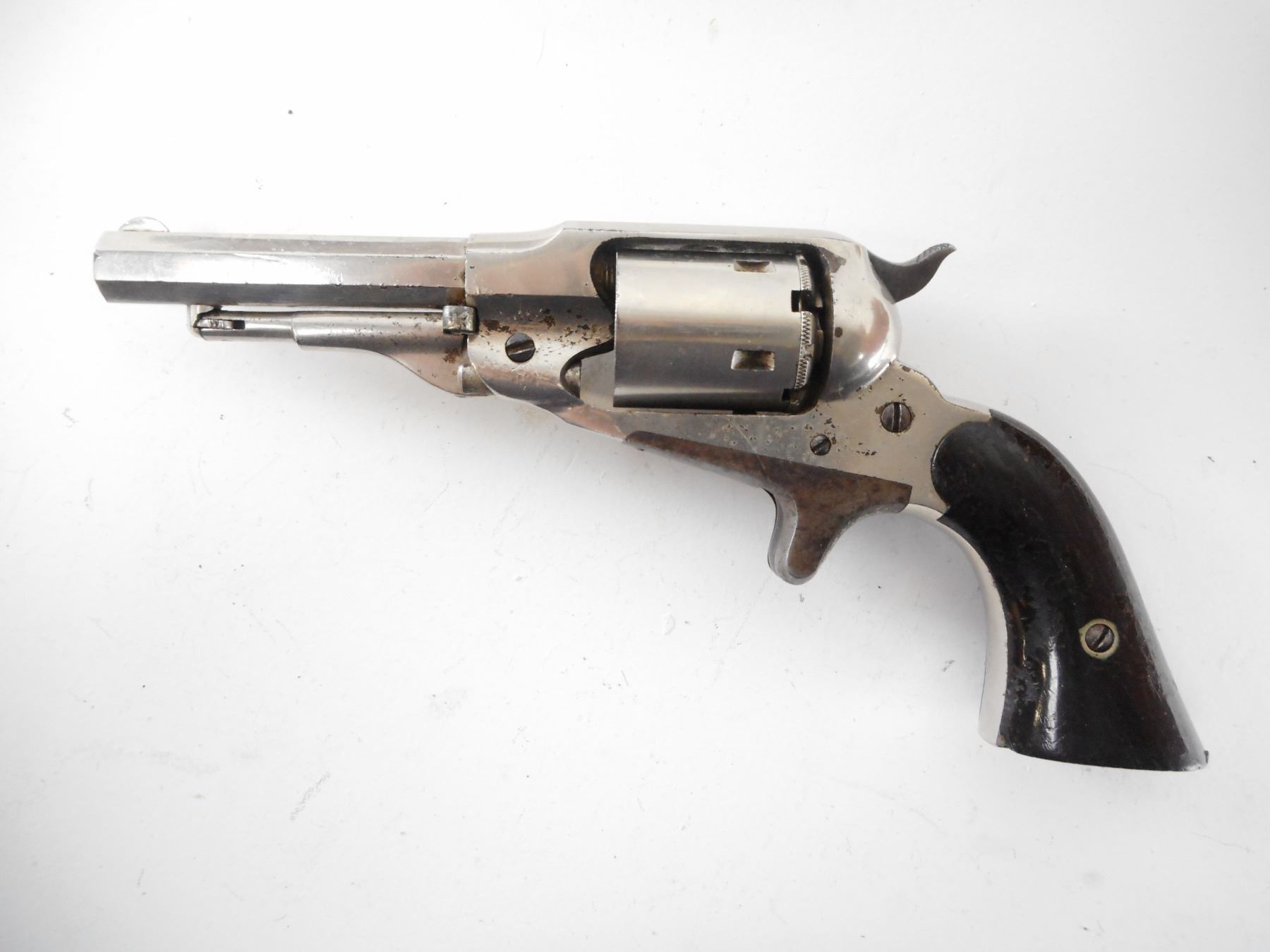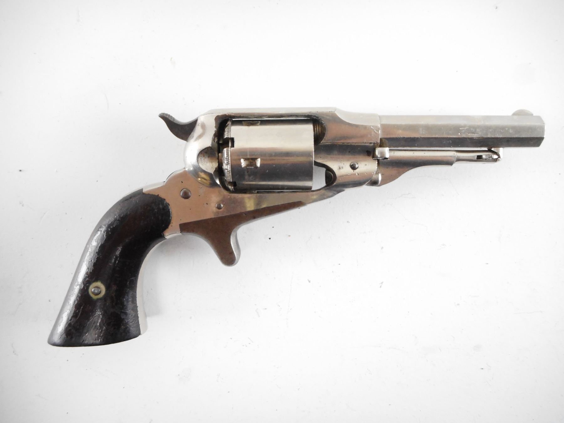 REMINGTON , MODEL: NEW MODEL POCKET , CALIBER: 32 RIM FIRE , BORE IS DARK. BLADE FRONT AND NOTCH REAR SIGHT. PLAIN WOOD GRIP PANELS. MINOR FLAKING ON THE NICKEL FINISH. HOLDS COCK, SINGLE ACTION ONLY. MANUFACTURED 1863-1888. SHOWS SOME HANDLING MARKS. , ACTION: REVOLVER , BARREL LENGTH: 89MM , SERIAL# 23118 , CONDITION:6/10 ANTIQUE , CLASS: NO LICENSE REQUIRED TO PURCHASE