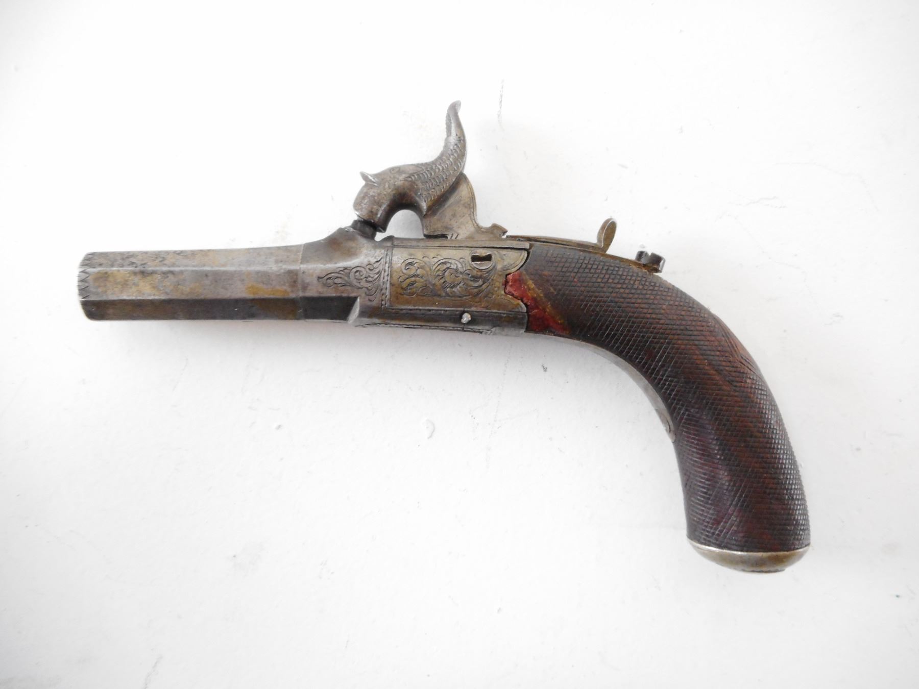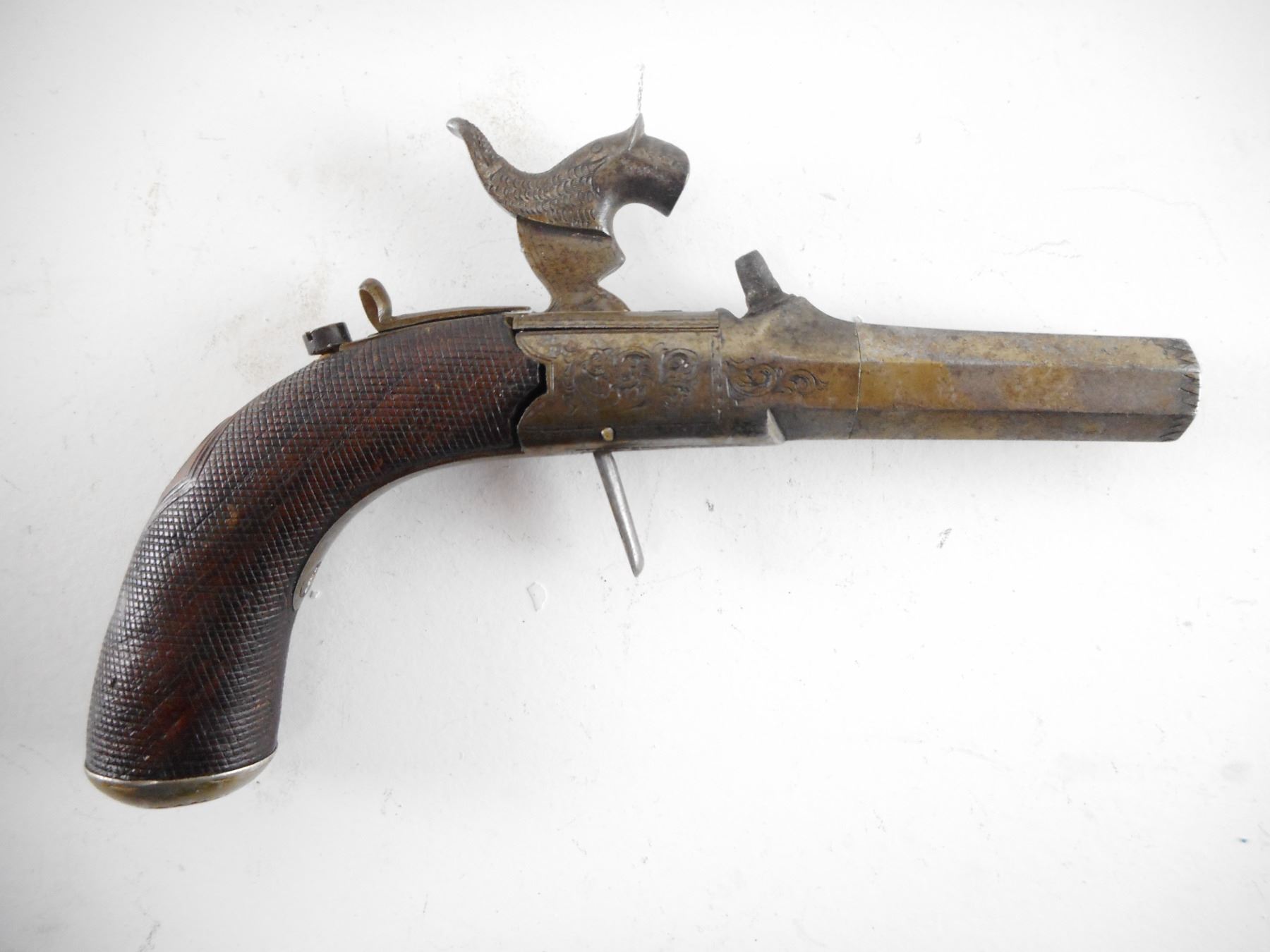 SW BERRY , MODEL: SCREW BARREL PISTOL , CALIBER: 36 CAL PERC , BORE IS GOOD WITH SOME LIGHT PITTING. NO SIGHTS. RICHLEY ENGRAVED RECEIVER. FINLEY CHECKERED WOOD GRIPS WITH OVAL VANITY DISK. TRAP DOOR IN POMMEL. UNIQUE CENTER HAMMER DESIGN WITH SLIDING SAFETY. FOLDING TRIGGER. HOLDS COCK. SHOWS SOME HANDLING MARKS. , ACTION: SINGLE SHOT PERC , BARREL LENGTH: 40MM , SERIAL# N/A , CONDITION:6/10 ANTIQUE , CLASS: NO LICENSE REQUIRED TO PURCHASE