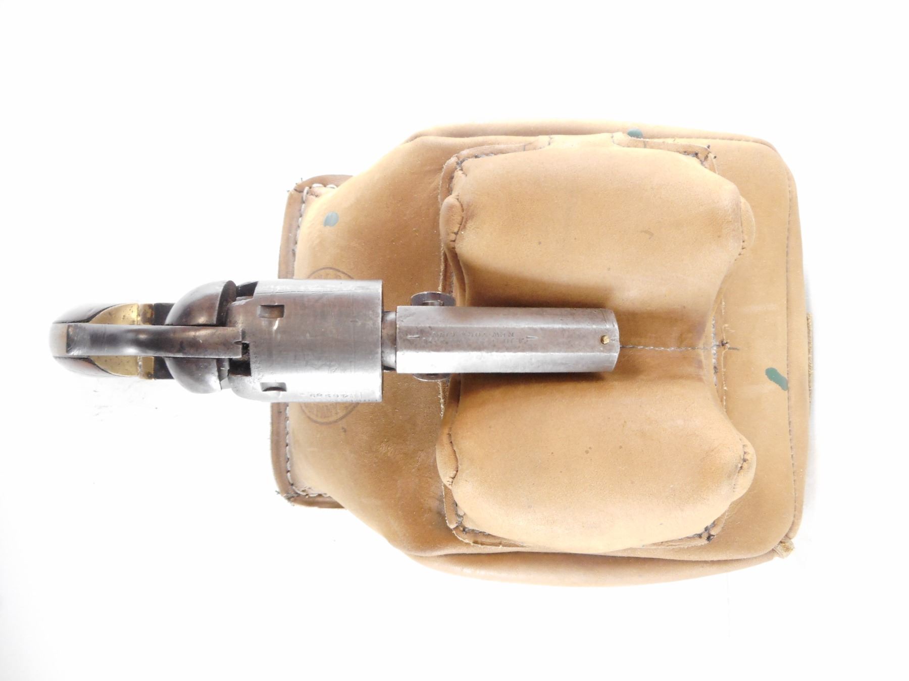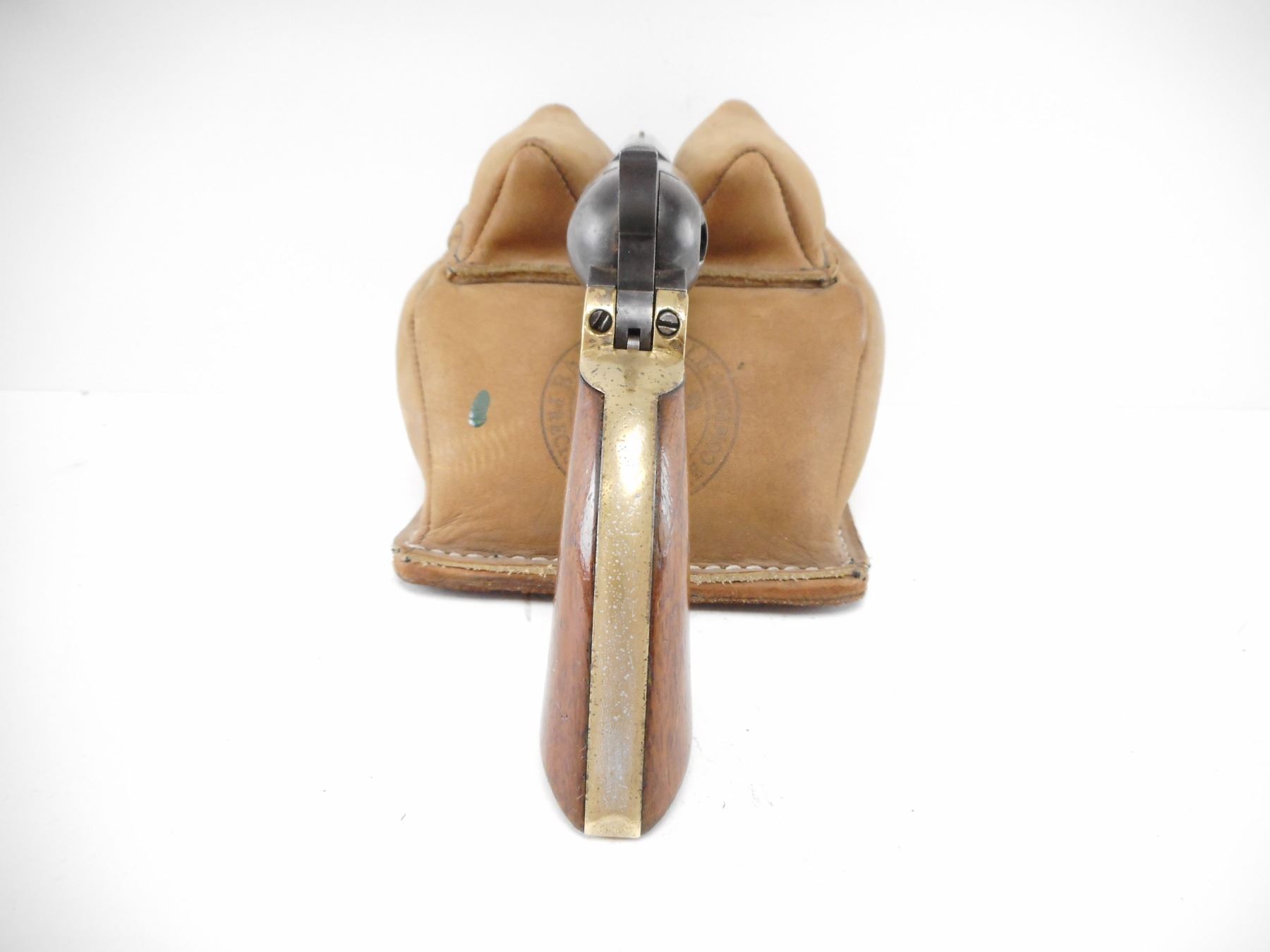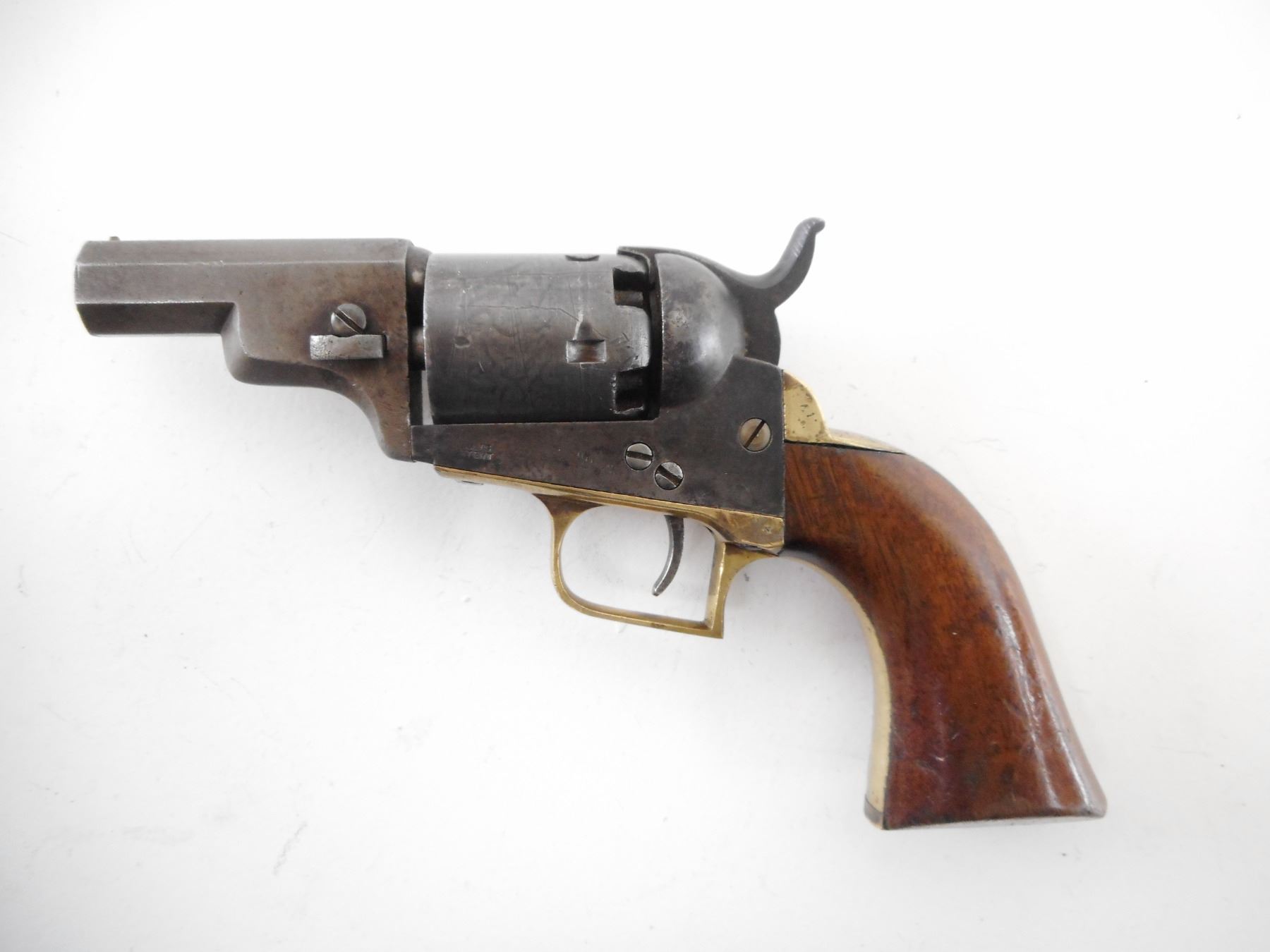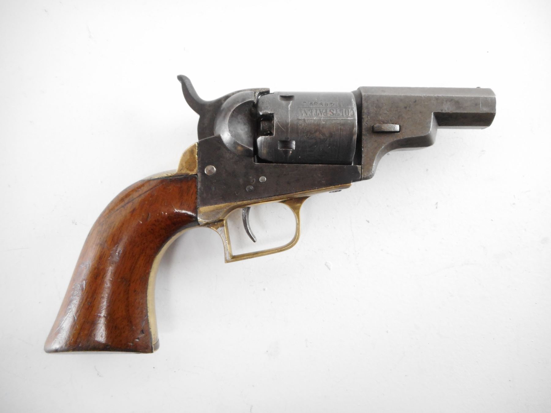 COLT , MODEL: 1849 POCKET , CALIBER: 31 CAL PERC , BORE IS DARK. FIRST YEAR OF PRODUCTION. ALL SERIAL #'S ARE MATCHING EXCEPT THE CYLINDER. MADE WITH NO PROVISION FOR A LOADING LEVER. POSSIBLY FOR WELLS FARGO. HOLDS COCK SINGLE ACTION ONLY. BEAD FRONT SIGHT AND NOTCH HAMMER REAR SIGHT. TWO PIECE PLAIN WOOD GRIPS. SHOWS SOME HANDLING MARKS. , ACTION: REVOLVER , BARREL LENGTH: 57MM , SERIAL# 12844 , CONDITION:6/10 ANTIQUE , CLASS: NO LICENSE REQUIRED TO PURCHASE