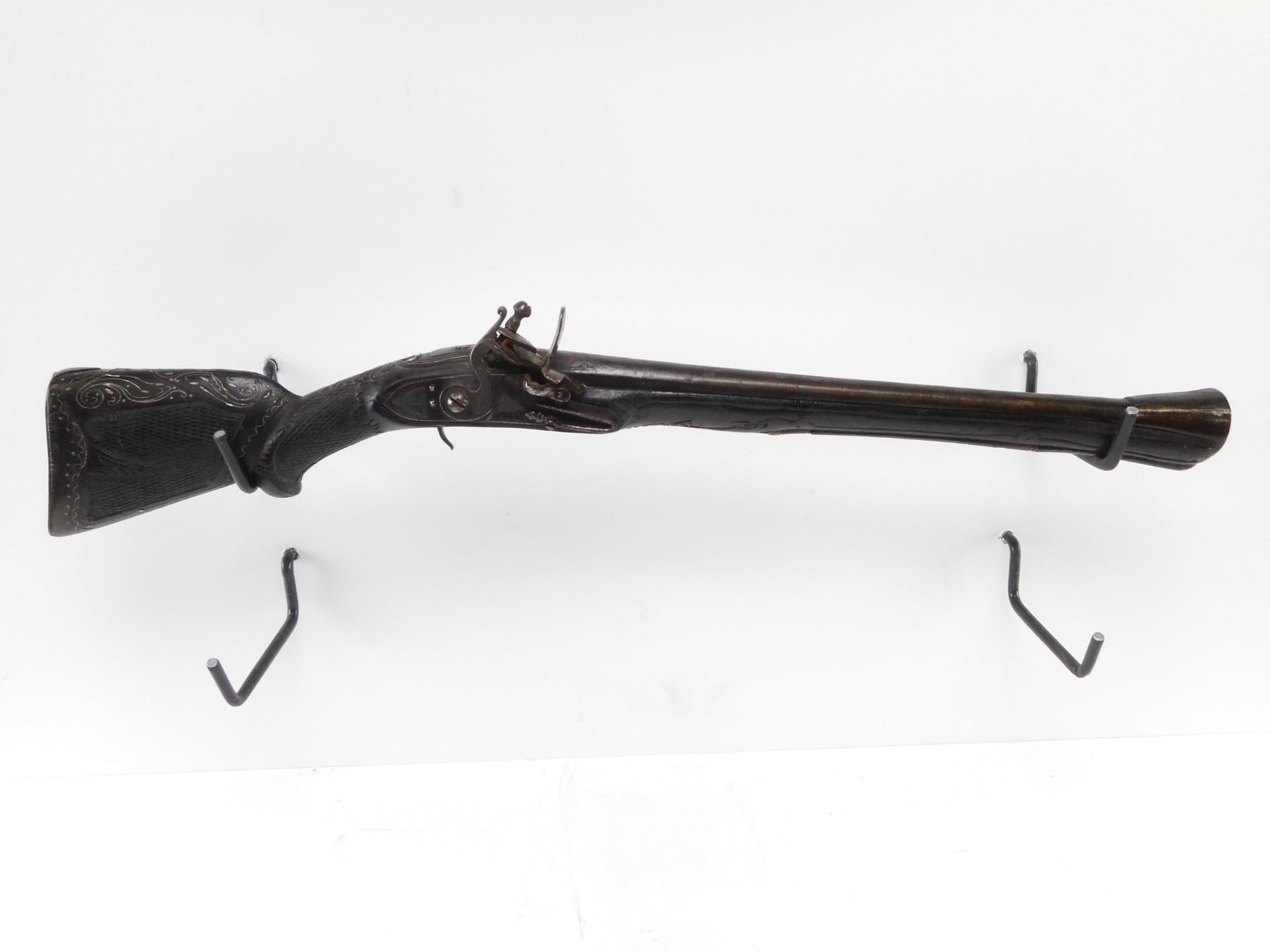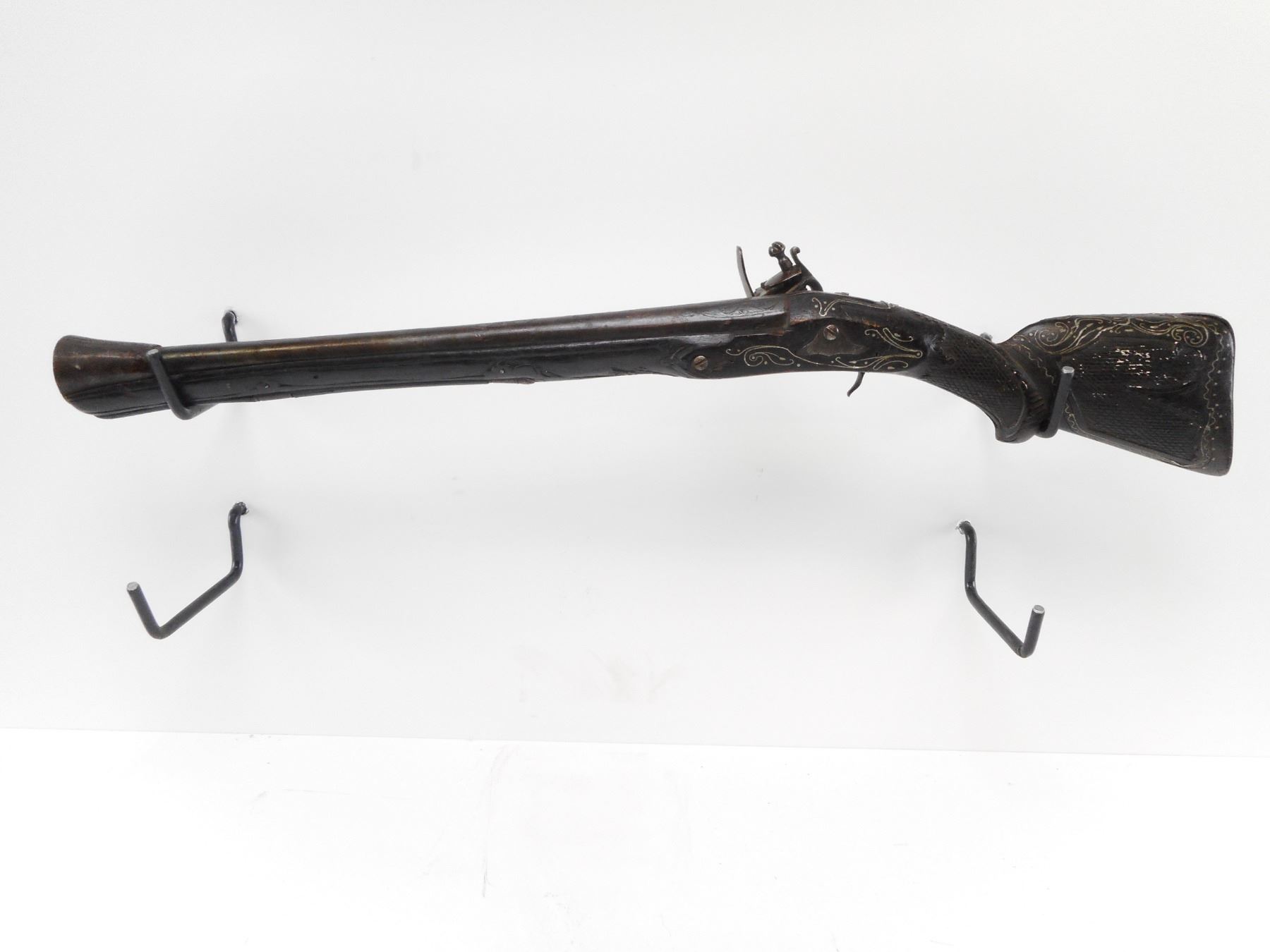 UNKNOWN , MODEL: AFGAN , CALIBER: ? , BORE IS POOR. FLARED MUZZLE. ROUND BARREL, WITH VARIOUS ETCHED DESIGNS. POSSIBLY ARABIC LETTERS. UNKNOWN LOCK. FULL LENGTH WOOD STOCK. WITH SILVER METAL INLAY. SMOOTH STEEL BUTT PLATE. CARVED WOOD RAM ROD, NOT FUNCTIONAL. WITH TRIGGER GUARD. 7 1/4" LOP. 22 3/4" OAL. SHOWS NUMEROUS HANDLING MARKS AND WEAR. , ACTION: FLINT LOCK , BARREL LENGTH: 16" , SERIAL# N/A , CONDITION:5/10 ANTIQUE , CLASS: NO LICENSE REQUIRED TO PURCHASE