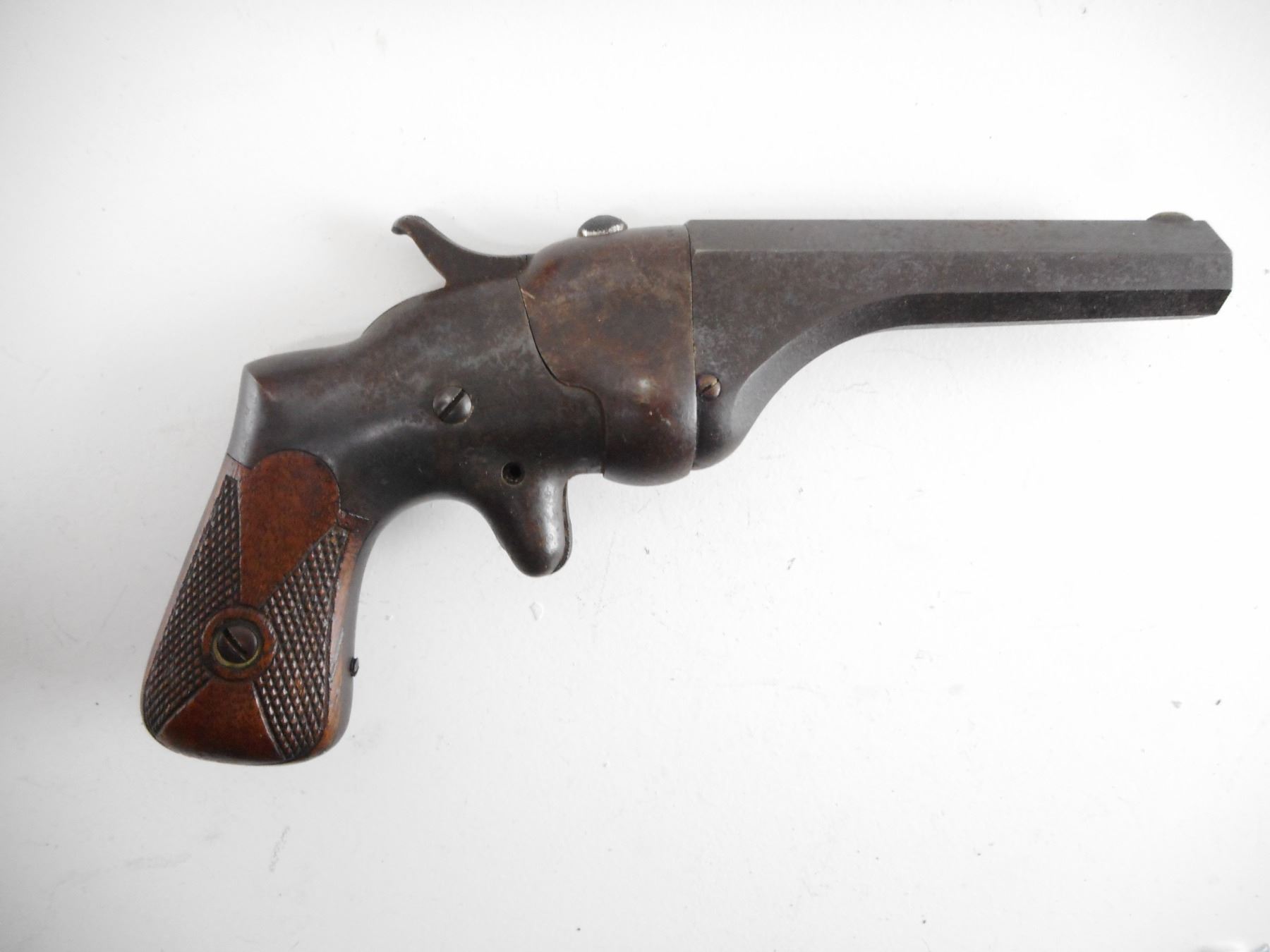 CONNECTICUT ARMS AND MANUFACTURING COMPANY , MODEL: 1864 , CALIBER: 44 SHORT RIM FIRE , BORE IS GOOD. SIDE SWINGING BREACH LOADER. BLADE FRONT SIGHT. RAISED NOTCH REAR SIGHT THAT ACTS AS AN ACTION RELEASE. CHECKERED TWO PIECE WOOD GRIPS. MISSING A TRIGGER SCREW. LIGHT SURFACE RUST ON ALL METAL PARTS. SHOWS SOME HANDLING MARKS. , ACTION: SINGLE SHOT PISTOL , BARREL LENGTH: 102MM , SERIAL# N/A , CONDITION:5/10 ANTIQUE , CLASS: NO LICENSE REQUIRED TO PURCHASE