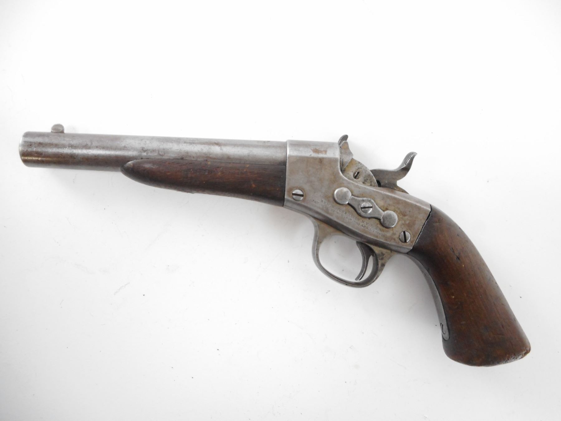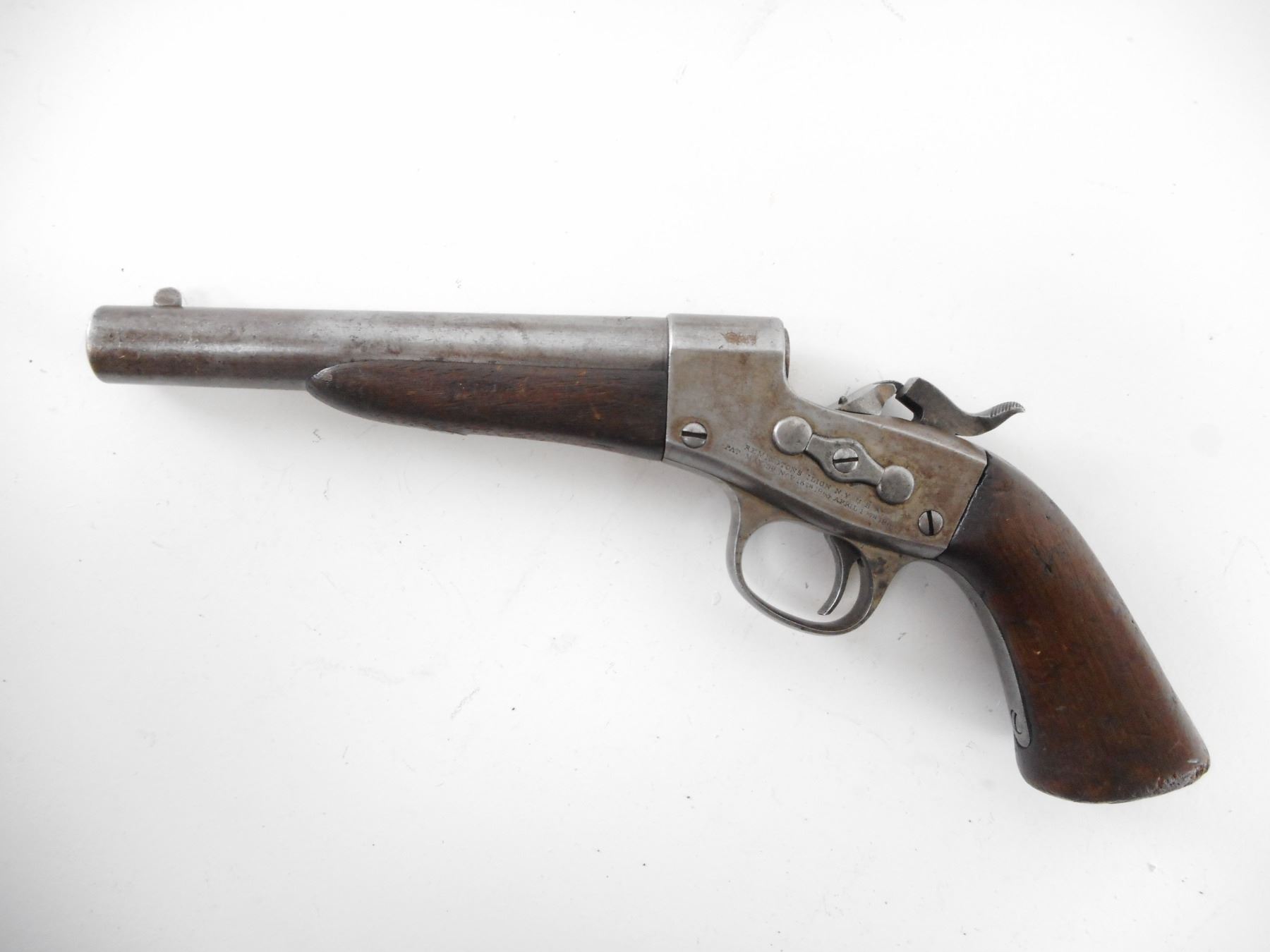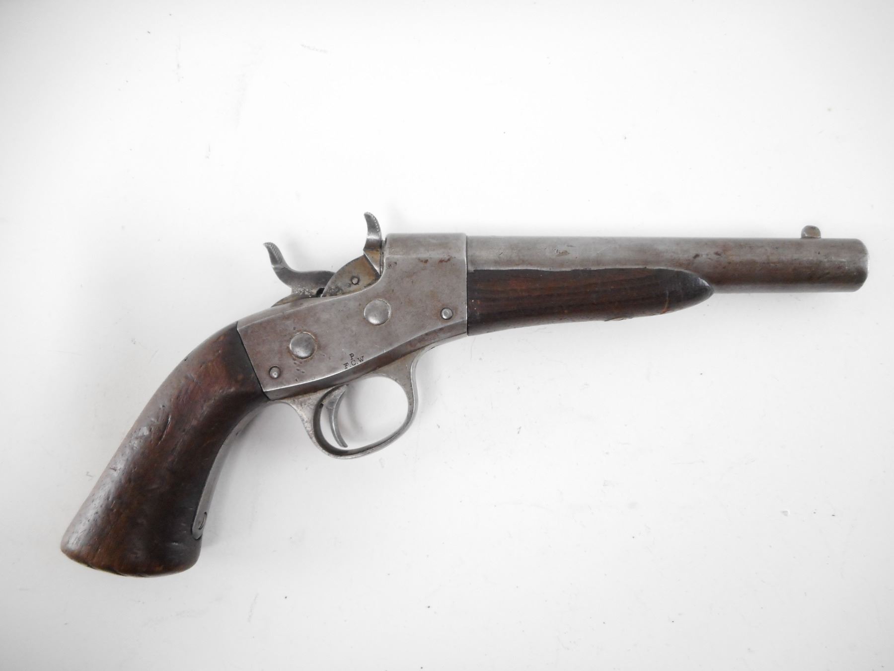 REMINGTON , MODEL: 1867 NAVY , CALIBER: 50 CAL REMINGTON NAVY CENTER FIRE , CIRCA 1870'S. BORE IS GOOD. BLADE FRONT AND NOTCH REAR SIGHT. TWO PIECE WOOD FOREND AND GRIPS. NUMEROUS SCRATCHES ON THE BASE OF THE GRIP. UNIQUE NAVAL MARKINGS ON TOP OF BARREL INCLUDE AN ANCHOR AND W.D.W . ACTION IS TIGHT. SHOWS SOME HANDLING MARKS. , ACTION: SINGLE SHOT PISTOL , BARREL LENGTH: 178MM , SERIAL# 2554 , CONDITION:7/10 ANTIQUE , CLASS: NO LICENSE REQUIRED TO PURCHASE